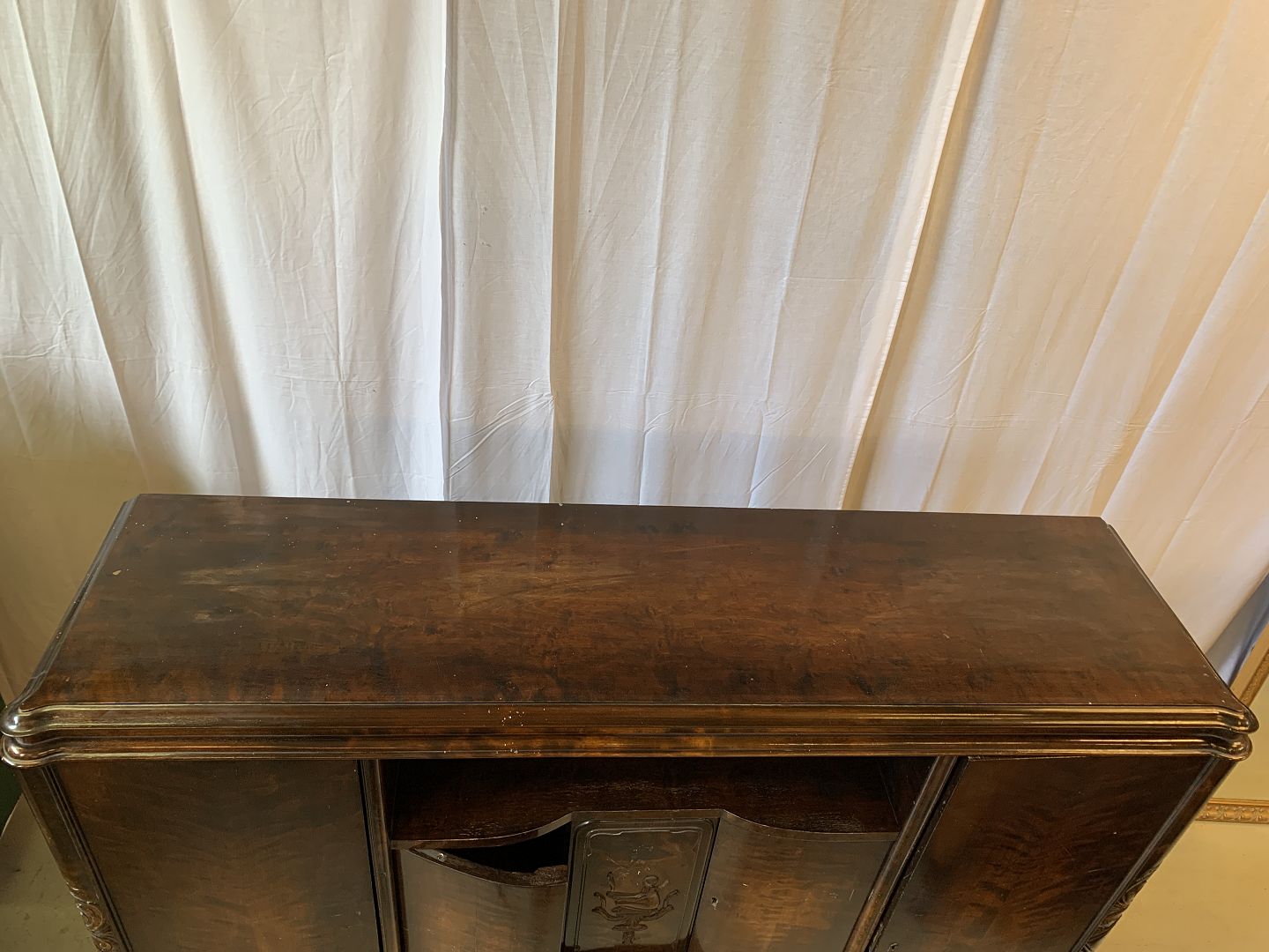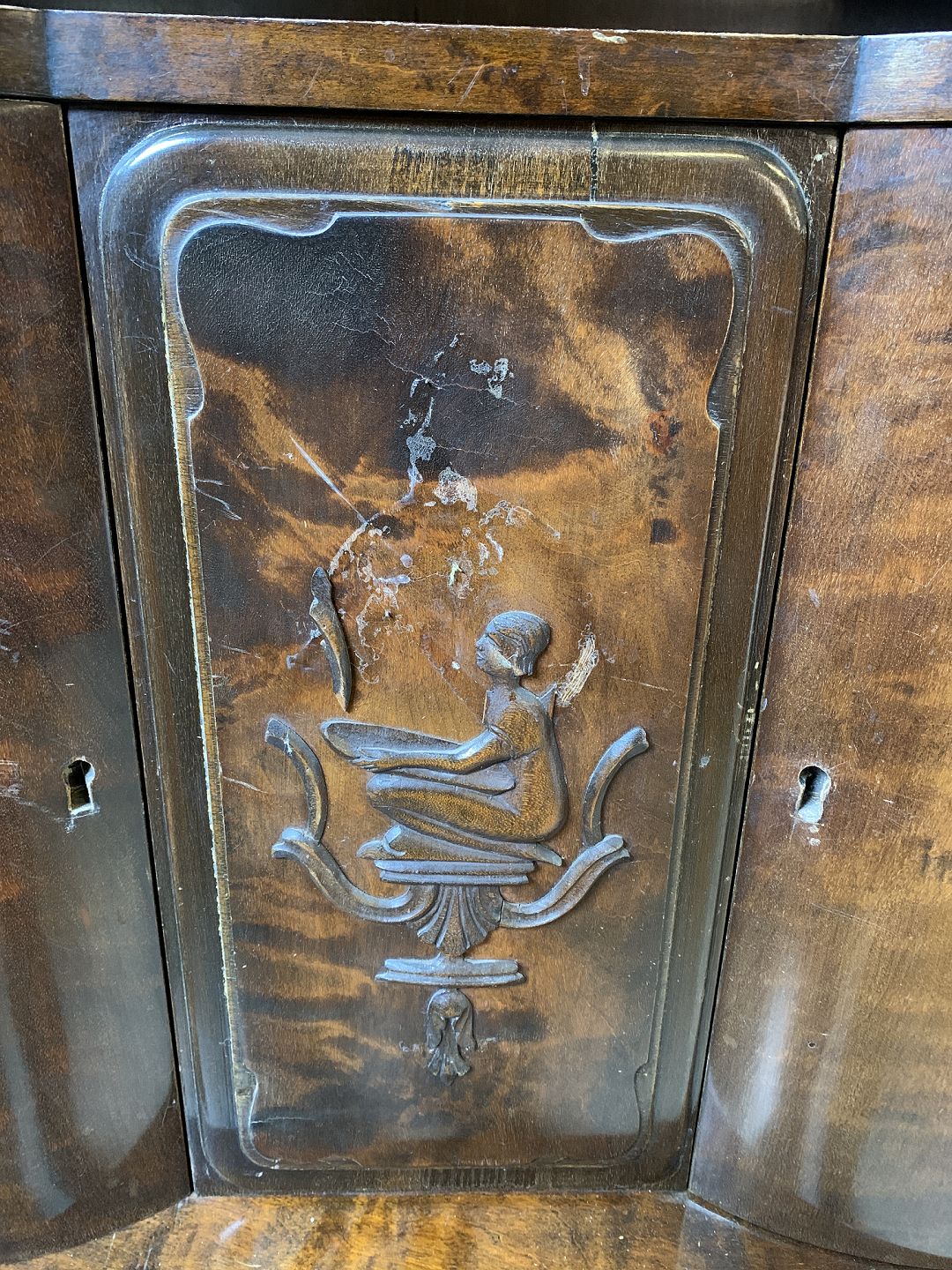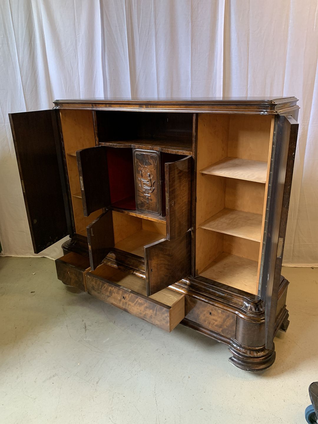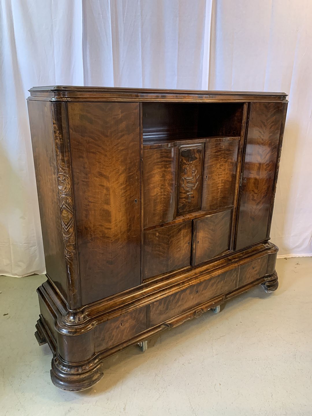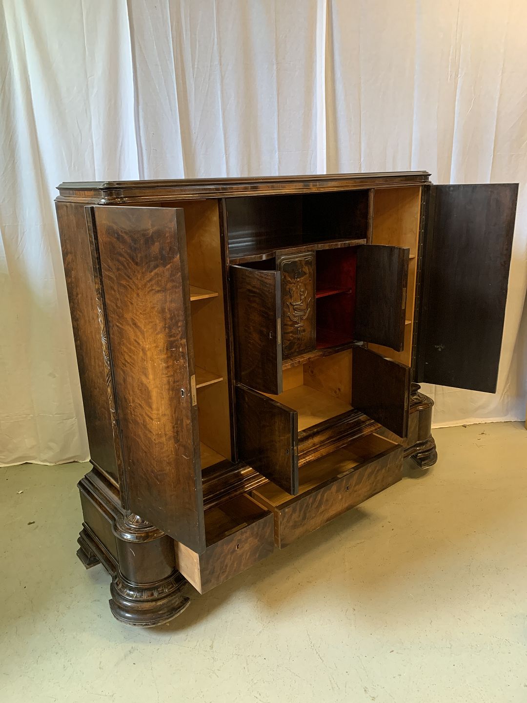 Dækketøjsskab i fineret birketræ, fra 1930erne.