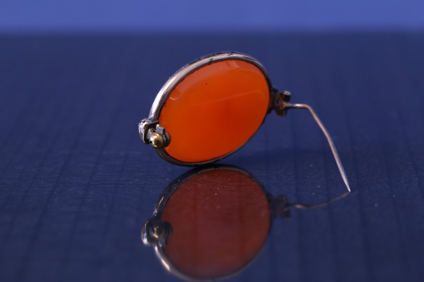 Guldbroche med flot orange sten, i 14 karat guld. Meget elegant.