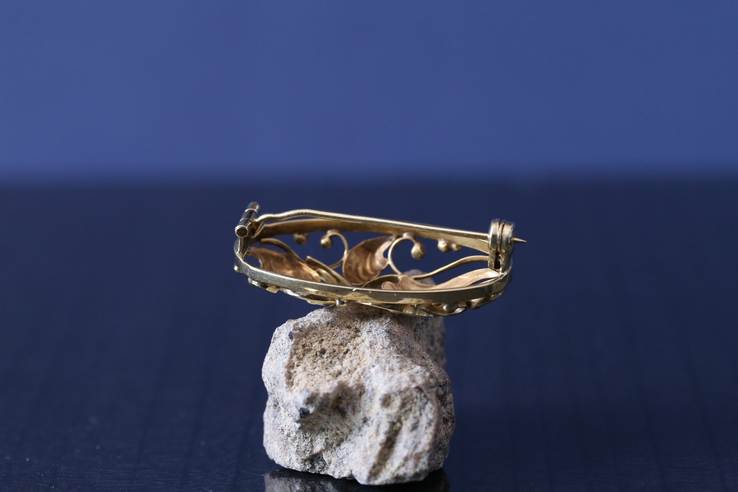 Flot guldbroche i 14 karat guld, med smukt detaljeret bladmønster. Brochen er, med sit bladmønster, levende og dynamisk. Brochen er smedet med sans for detaljen, og har et levende organisk mønster.