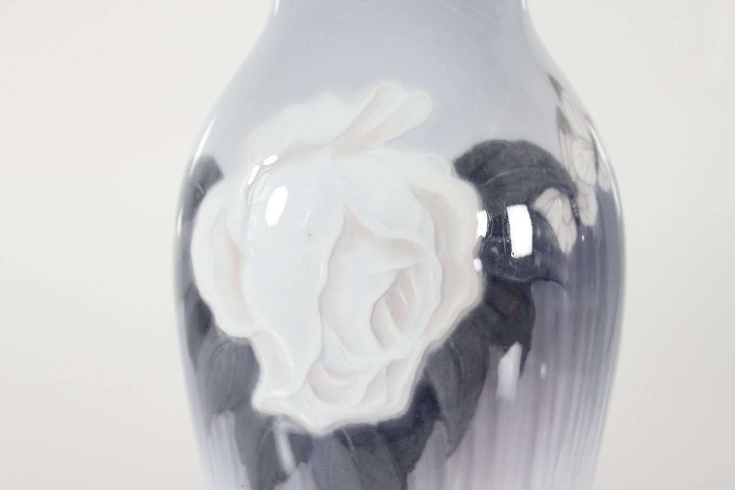 Gammel høj slank vase med roser og sommerfugle