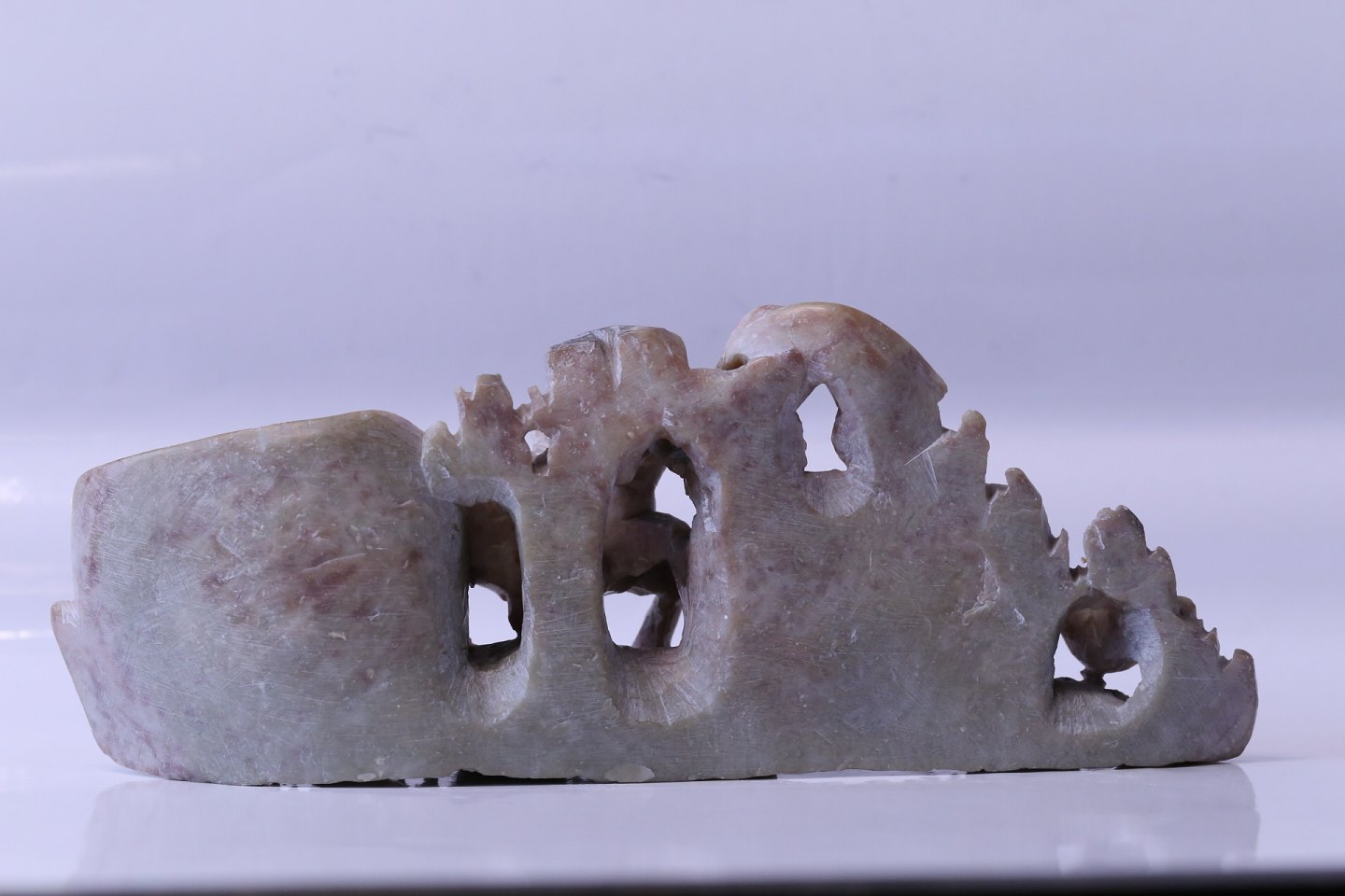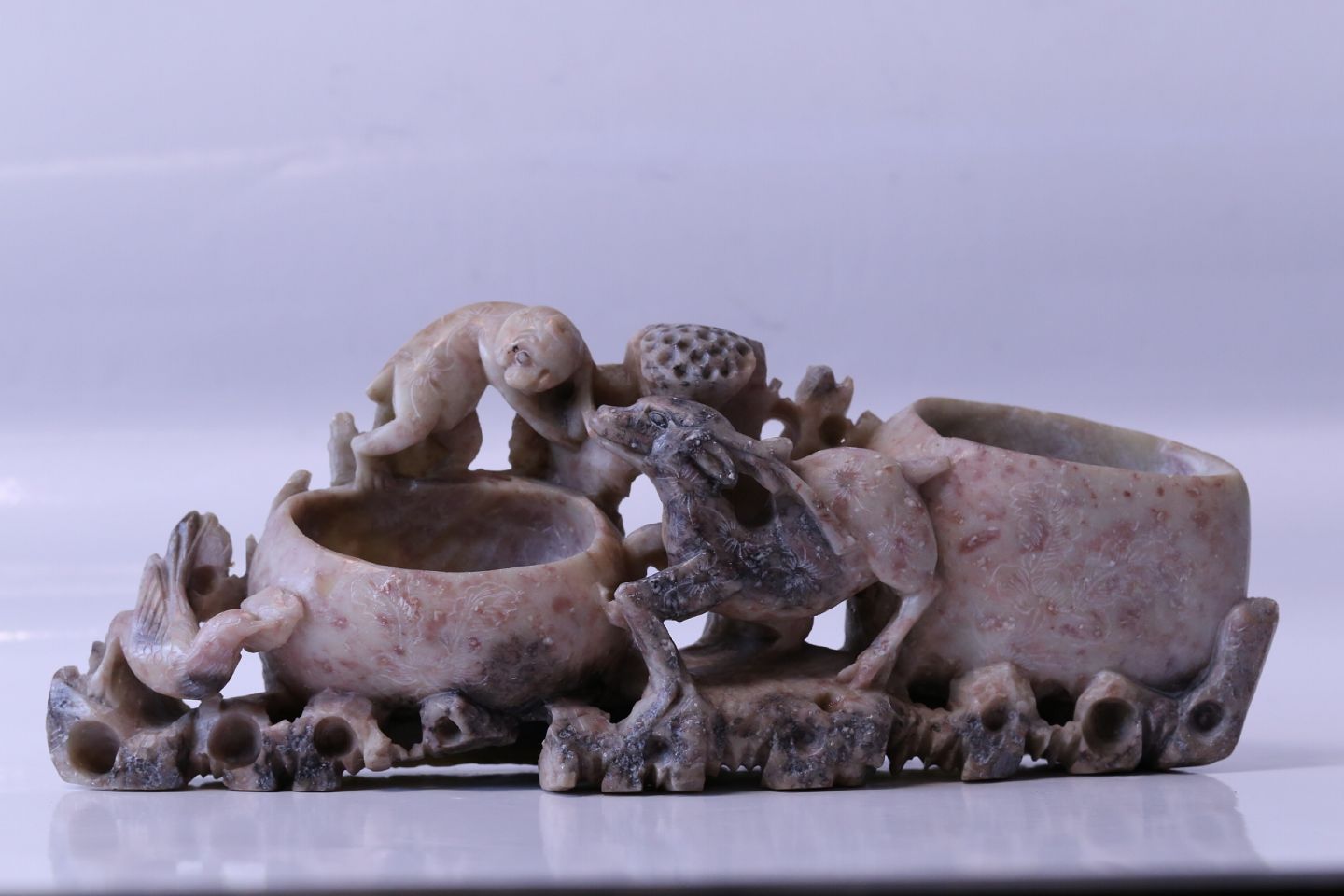 Bordskulptur af fedtsten med flot detaljeret dyremotiv, samt to rum.
