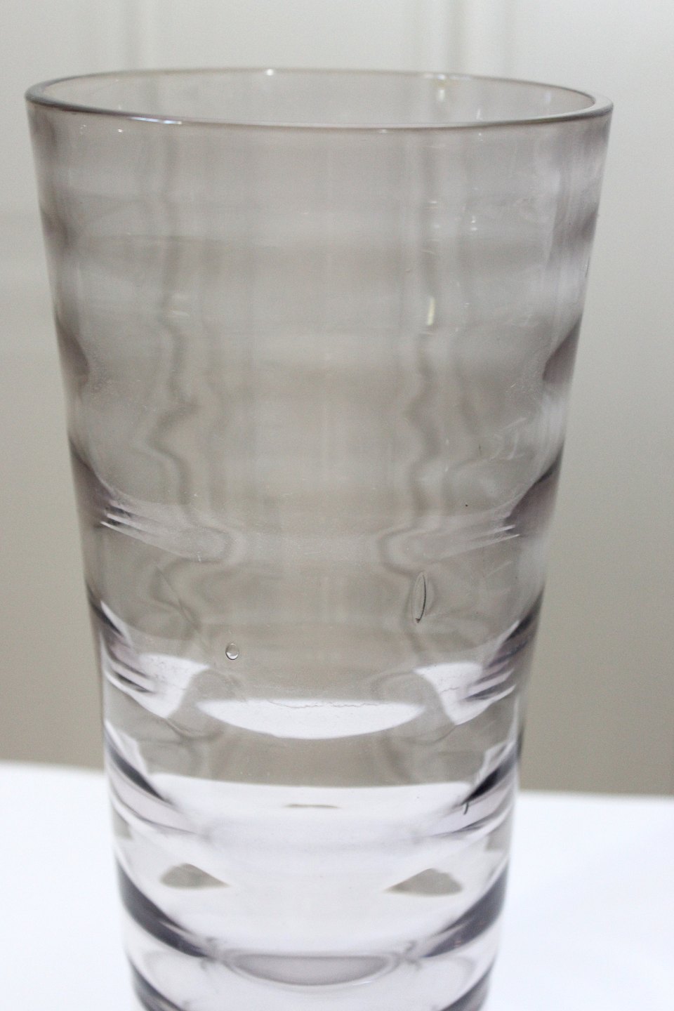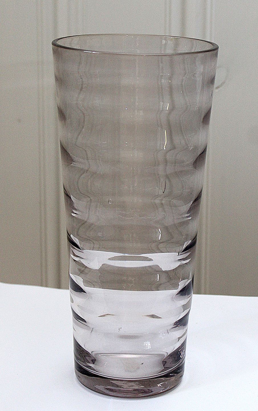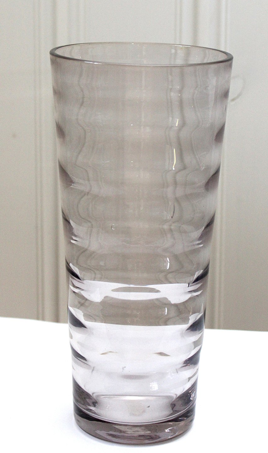 Vase i grå/violet tonet transparent glas med rillede vandrette linjer. Højde 25,3 cm. Diameter top 11,5 cm. Diameter bund 8,5 cm. Bobler indvendig heraf en enkelt bristet. Lettere kalk brugsspor og ridser. Rundsleben i bund. Ingen signatur. Pris: 225 kr. stk. Lager: 1