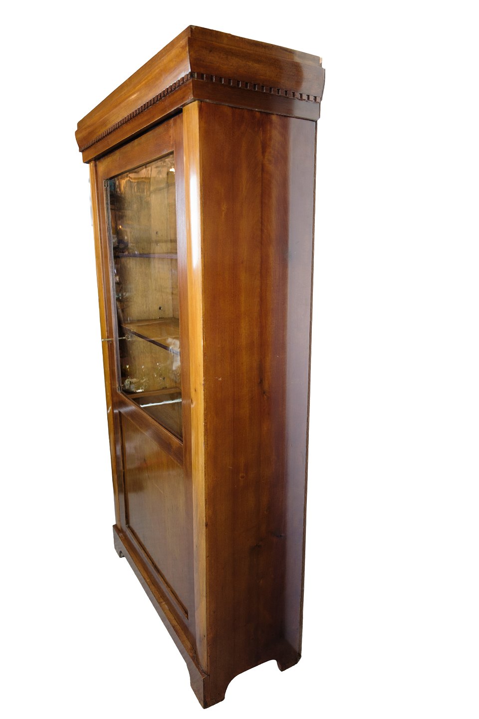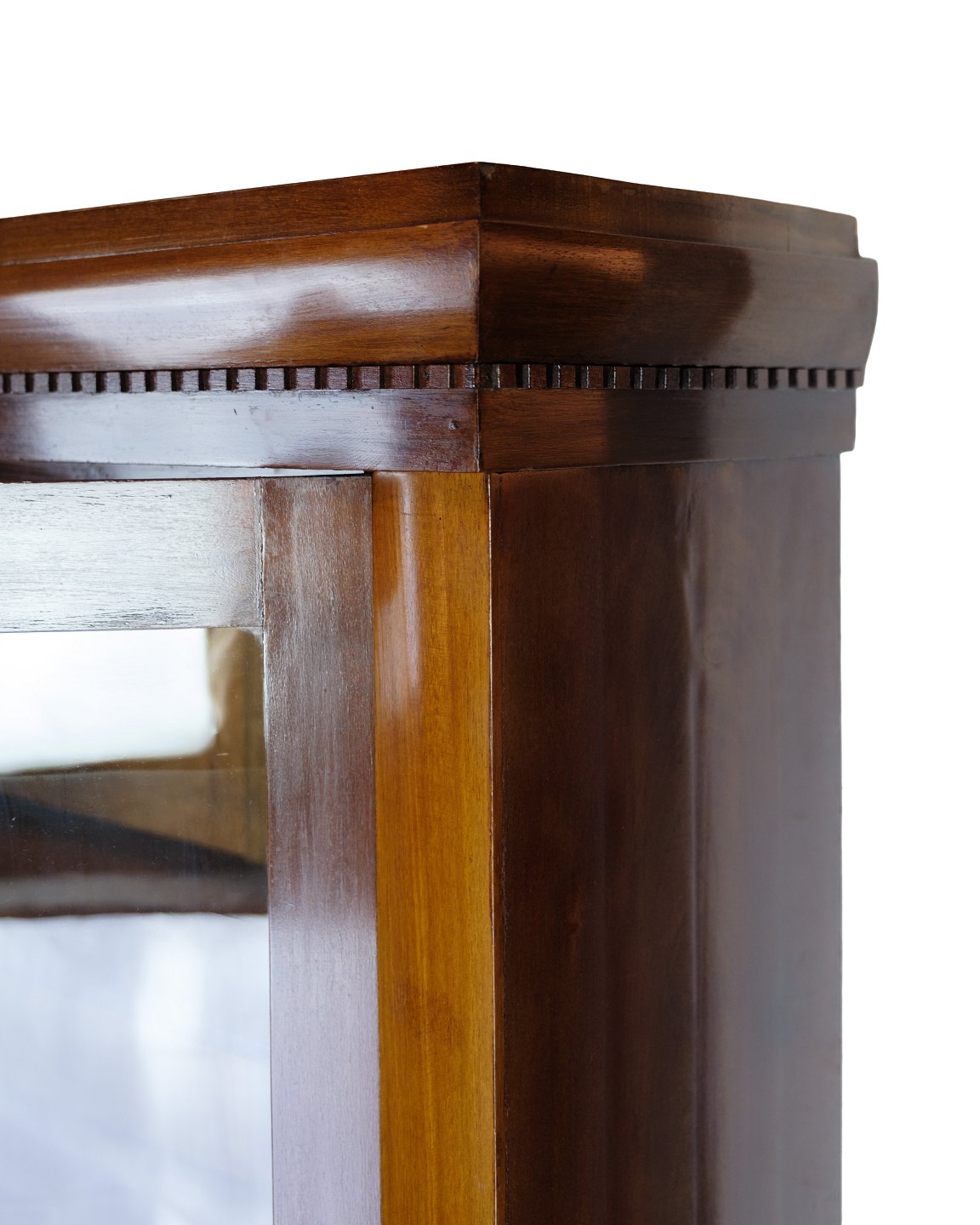 Vitrineskab fra 1920'erne udført i mahogni med enkelt glasdør og fem justerbare hylder.