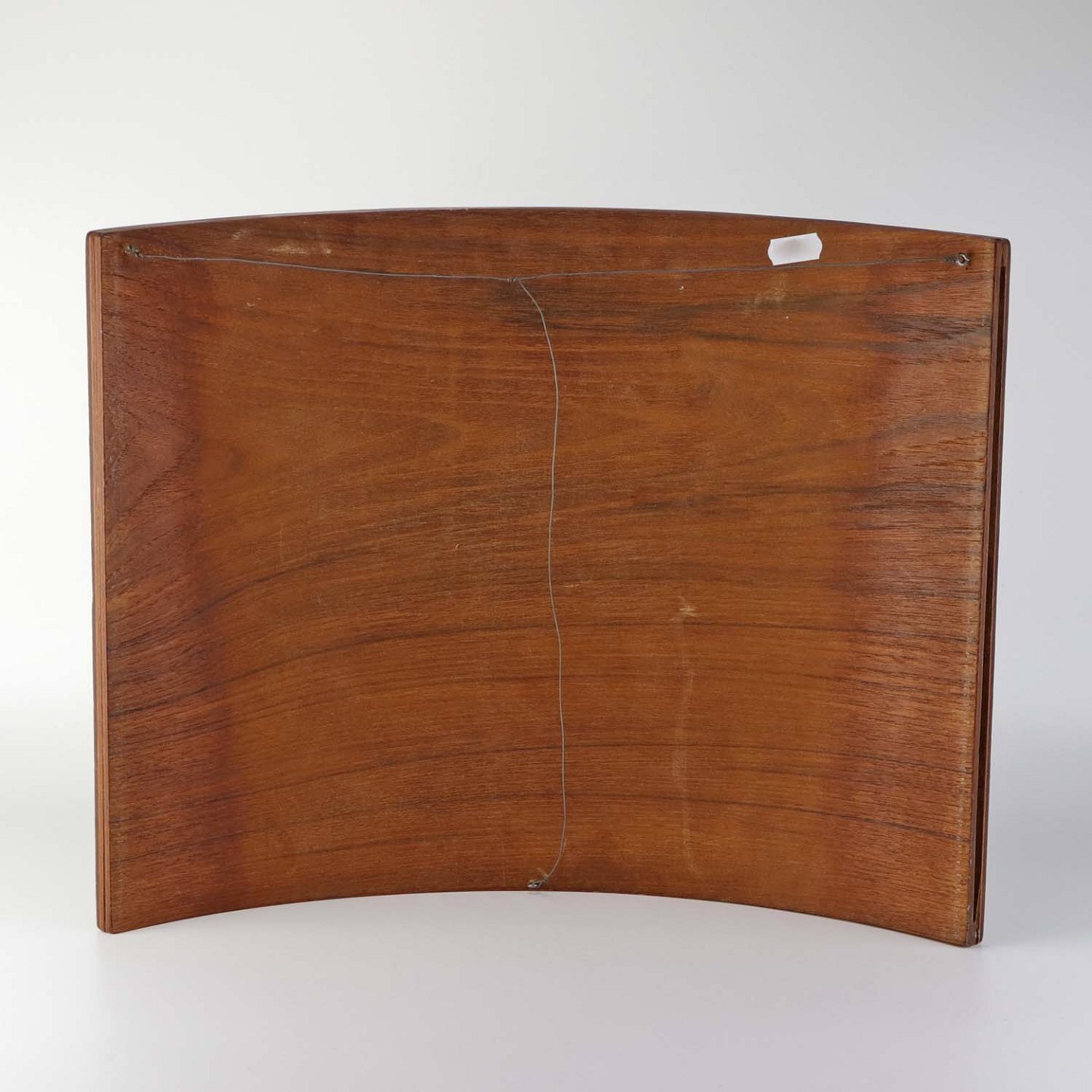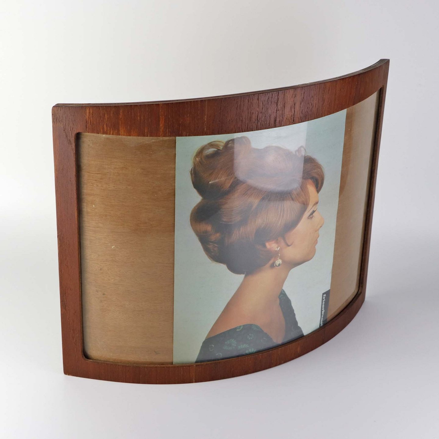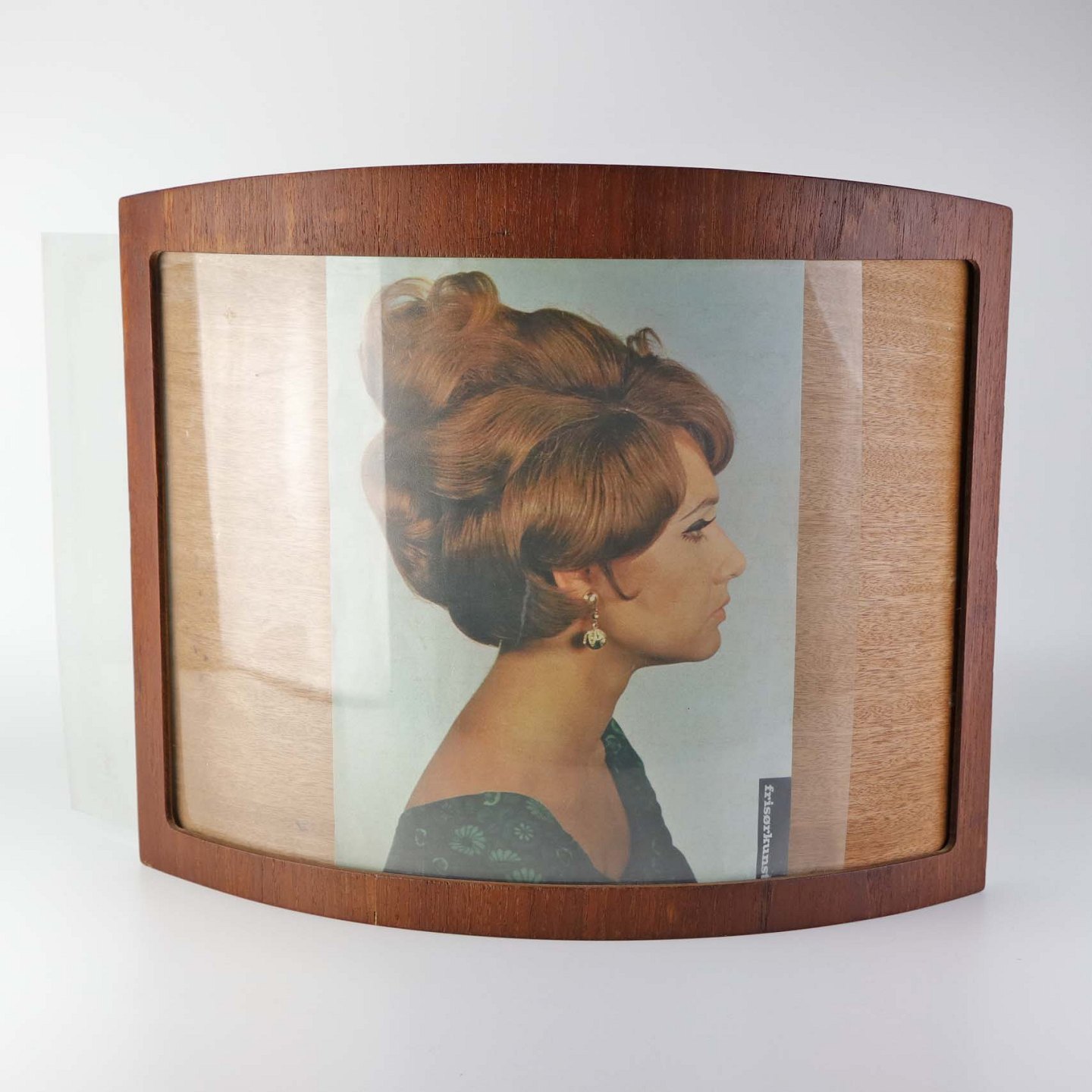 Indrammet tryk bag blødt past i buet ramme i teaktræsfiner. Trykket er mærket Frisørkunst.