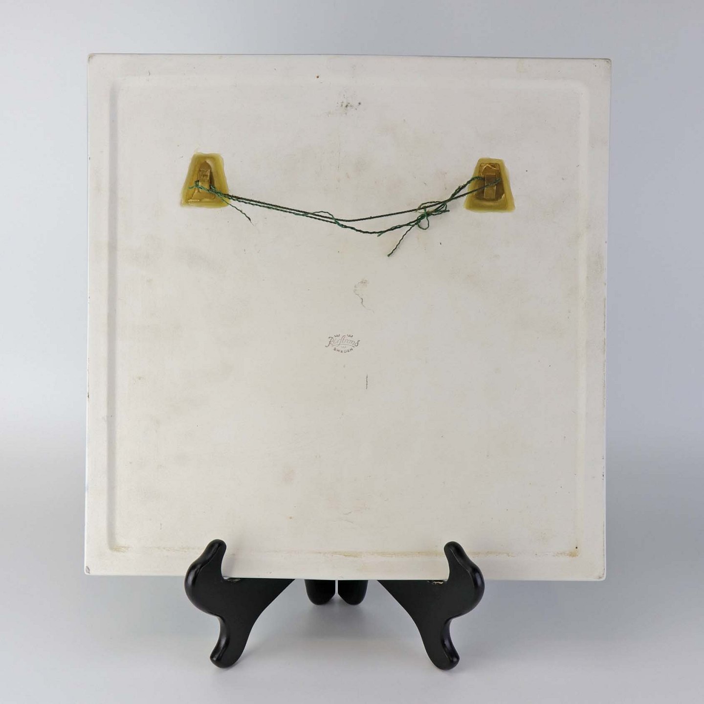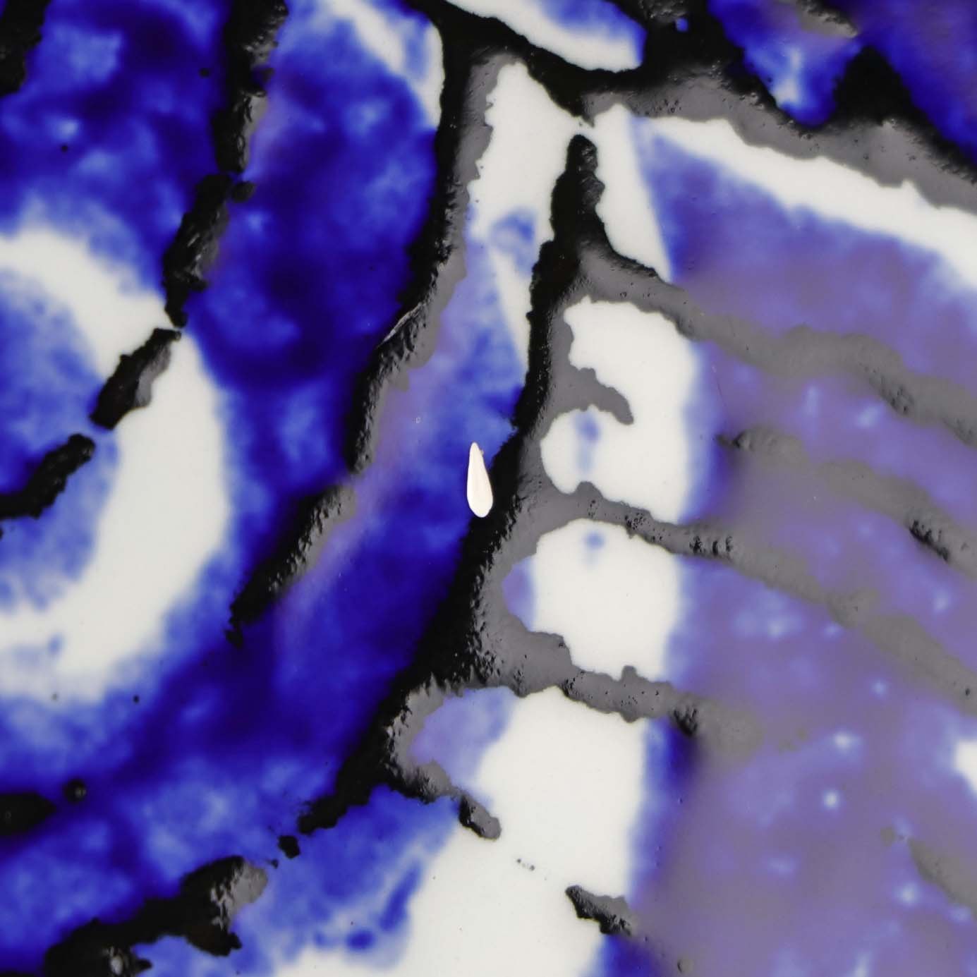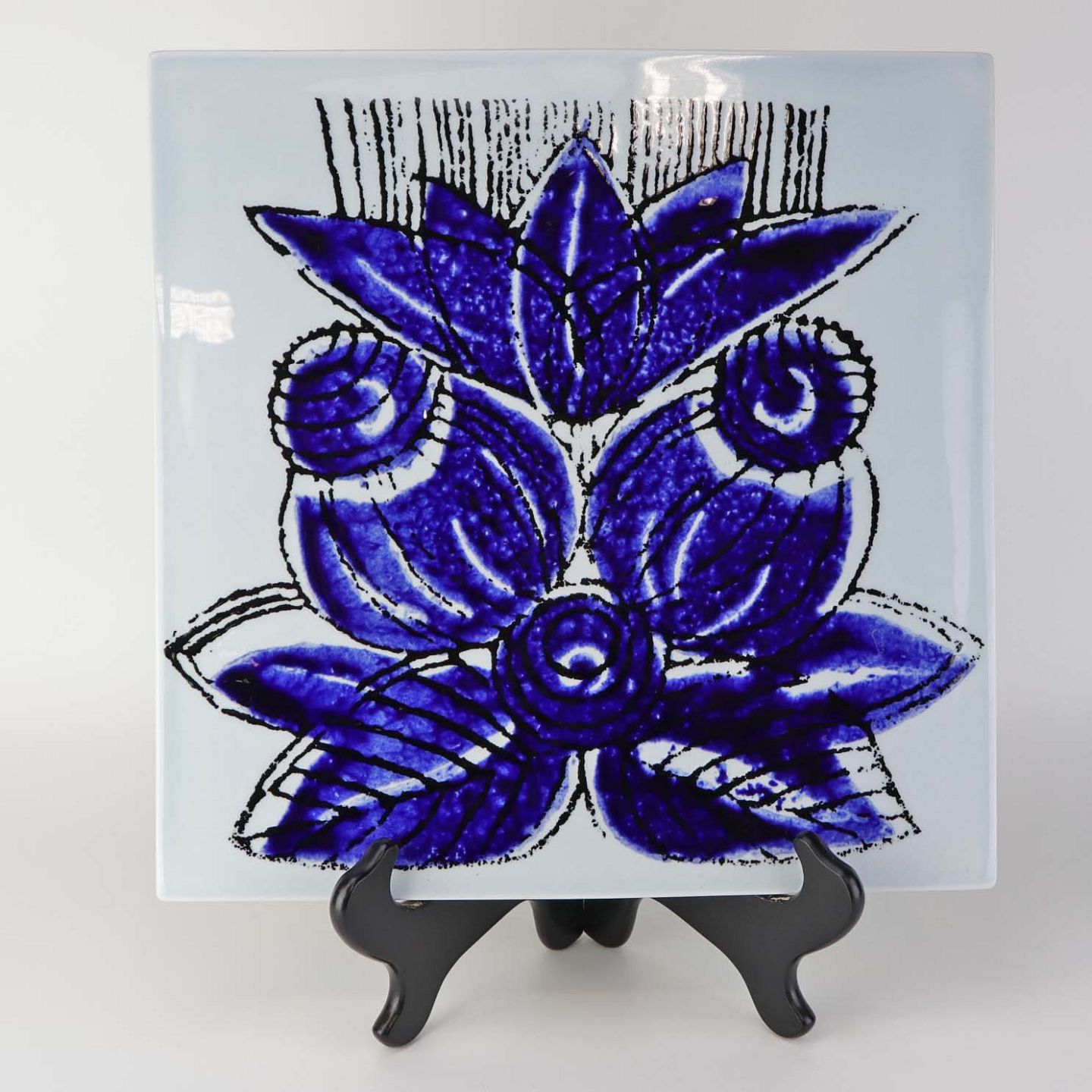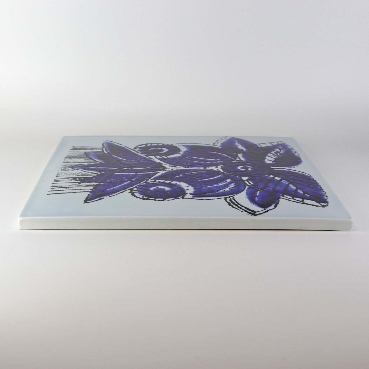Kvadratisk relief i glaseret porcelæn med naturmotiv af blå blomster og blade på lyseblå baggrund.