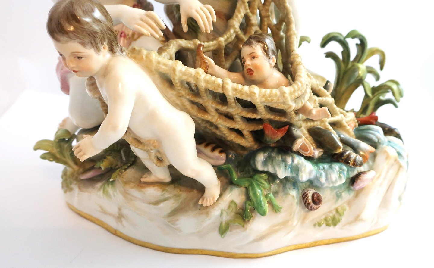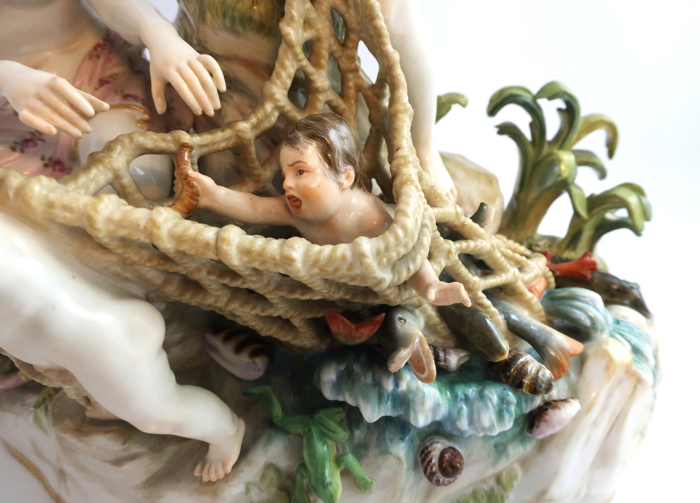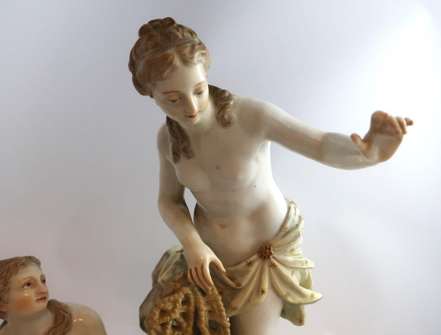 Meissen. Fiskende kvinder med børn. Højde 31 cm. Bredde 25 cm. (2 sortering). Der er få fejl og afslag på figuren.
