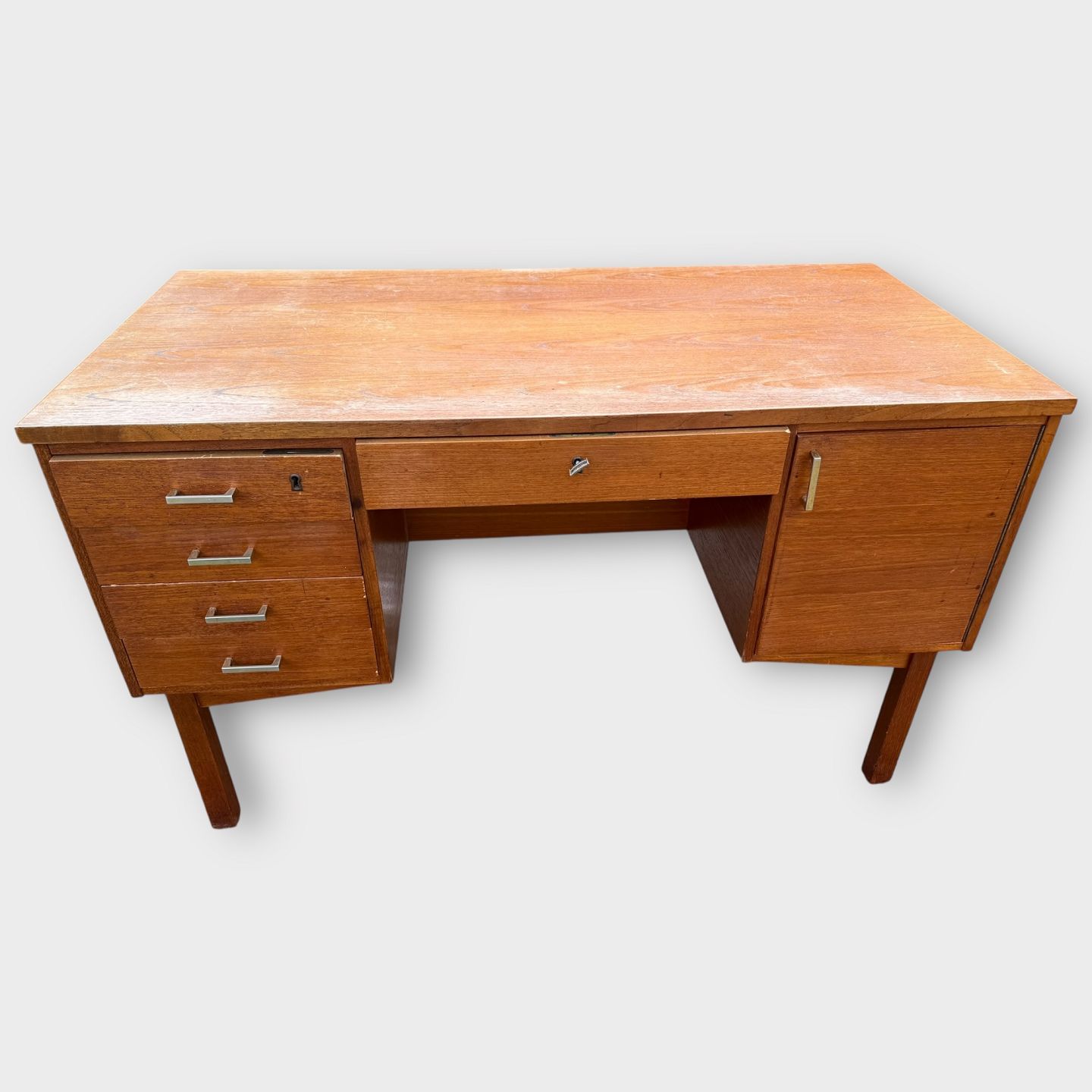 Desk in teak veneer, Danish modern from the 1960s, appears with signs of wear, Dimensions: HxLxW 72x123.5x63.5