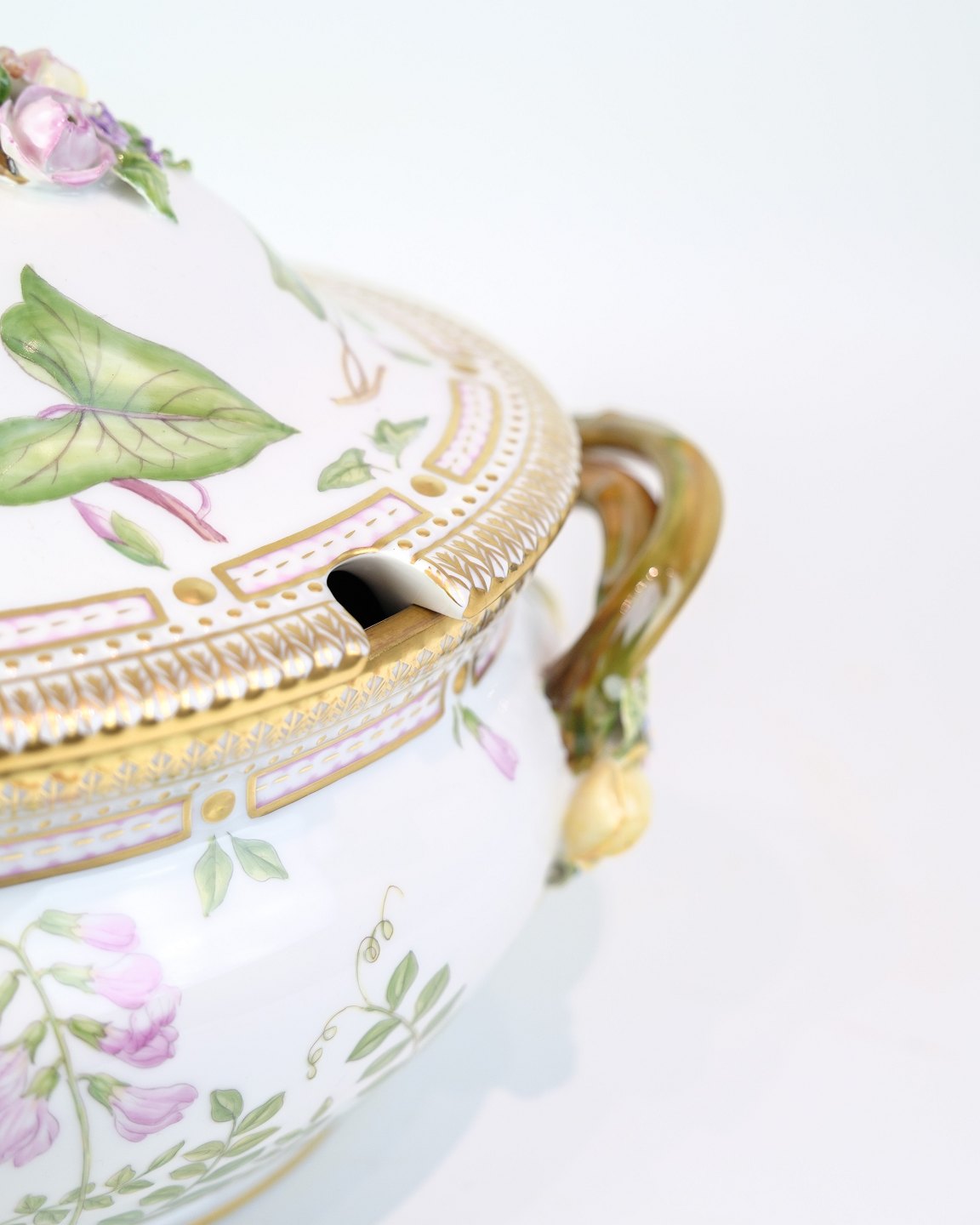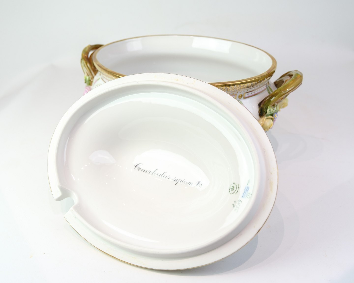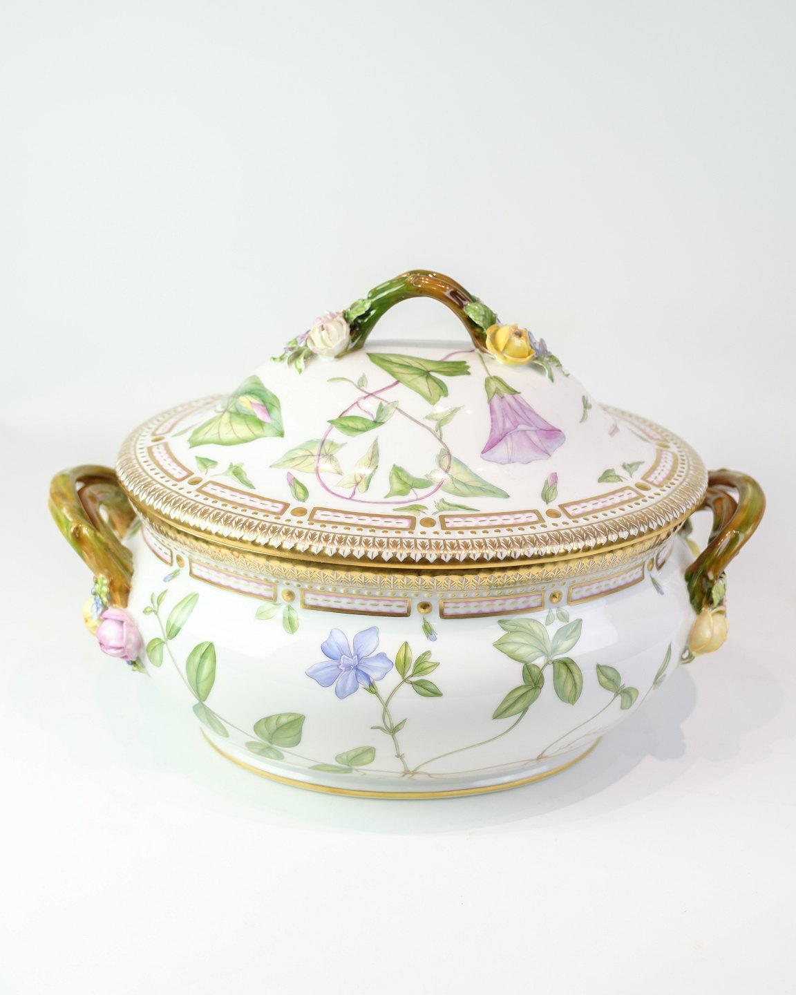 Terrin fra Royal Copenhagens Flora Danica-serie, udført i porcelæn og håndmalet med dekoration nr. 20/3559. Terrinen er rigt dekoreret med naturtro blomster og forsynet med låghank og to sidehanke udformet som grenmotiver med blomster og blade i farver.