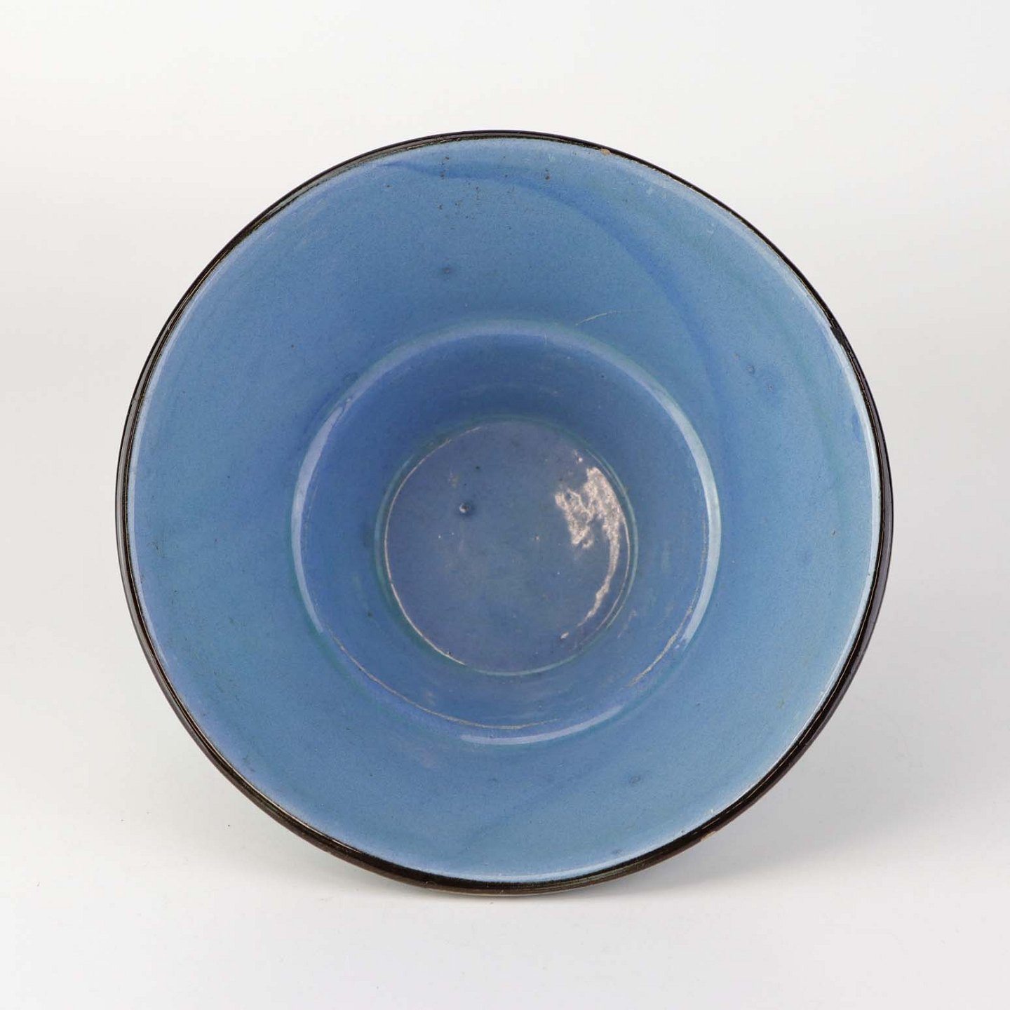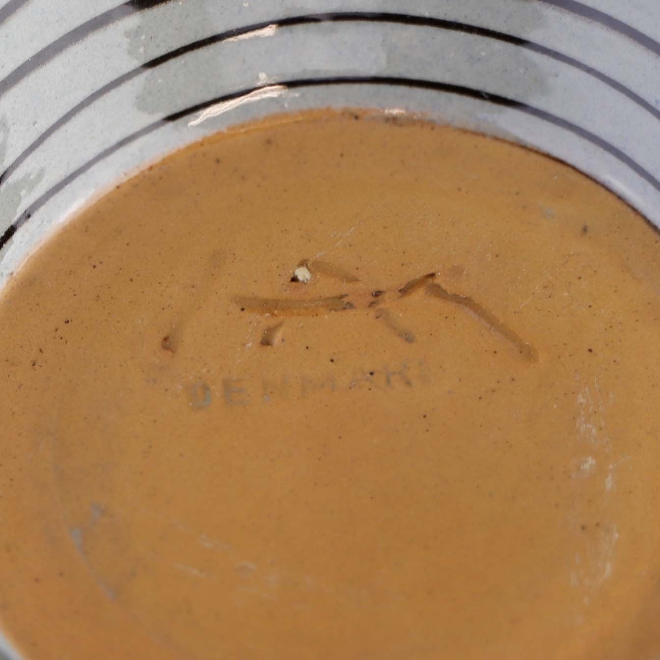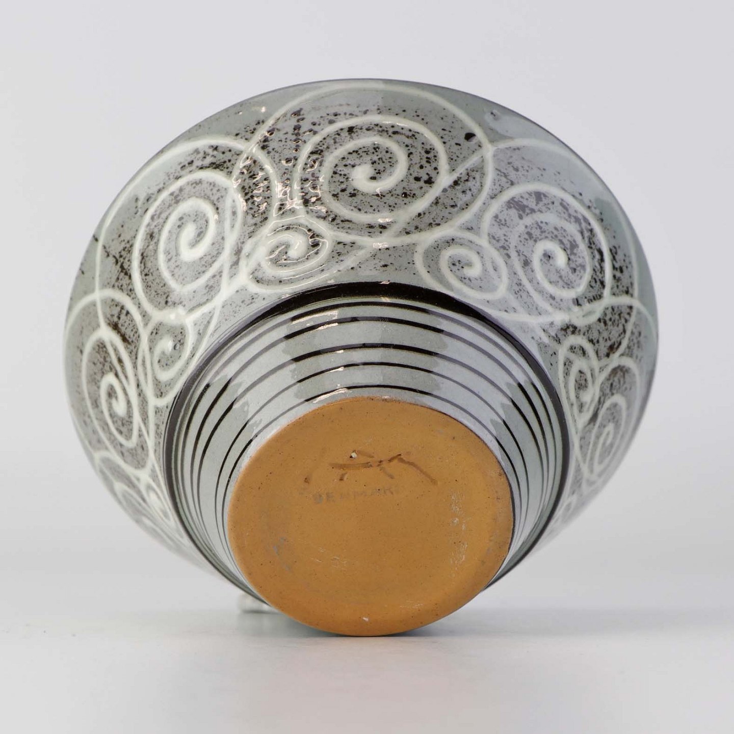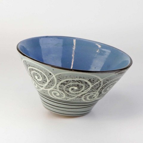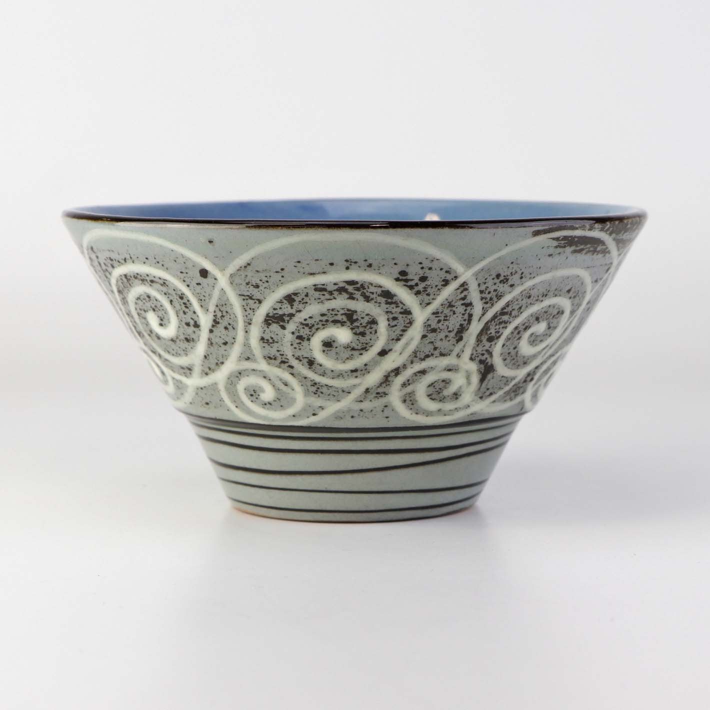 Mindre skål i glaseret keramik dekoreret med hvidt cirkel mønster og sorte striber på grå baggrund med blå inderside.