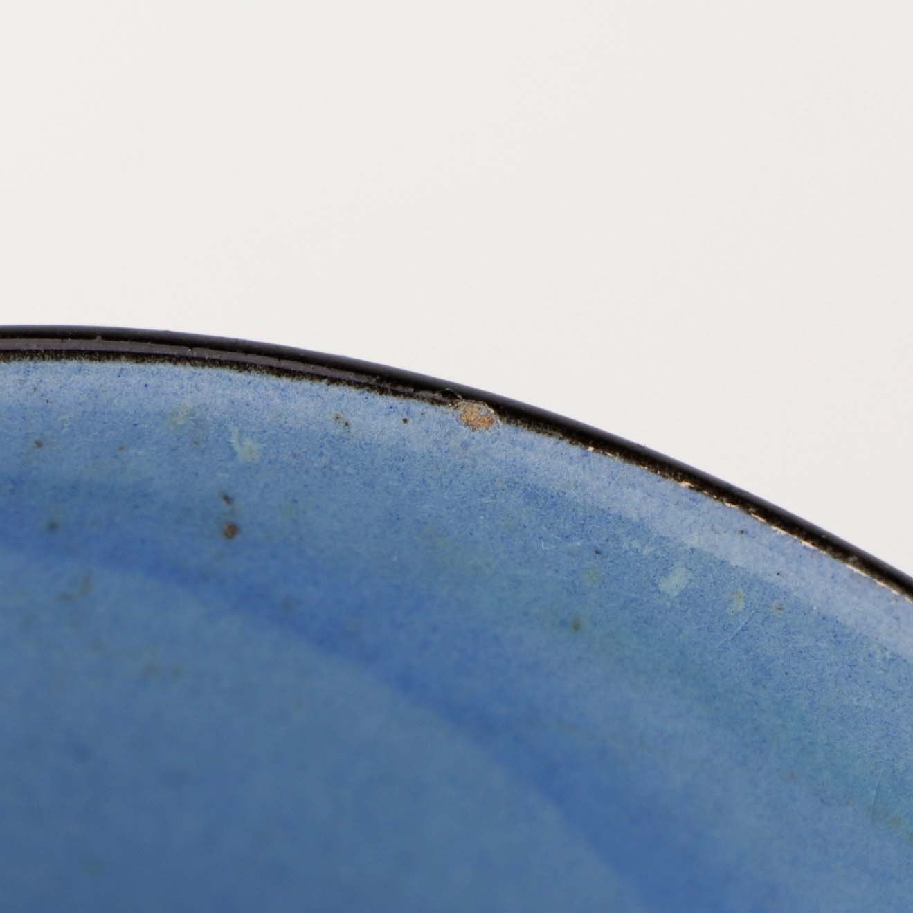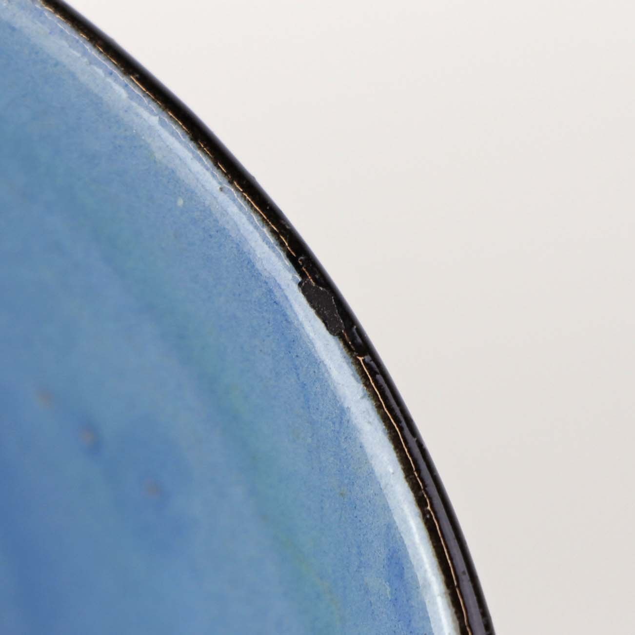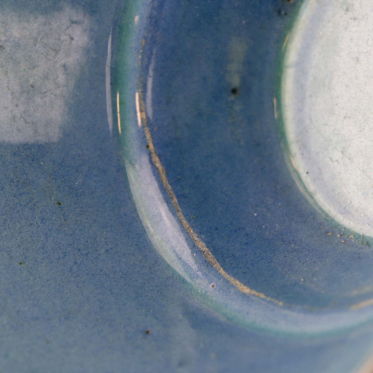 Fremstår med to mindre nøk i glasuren langs topkanten samt ridse i glasuren indvendigt.