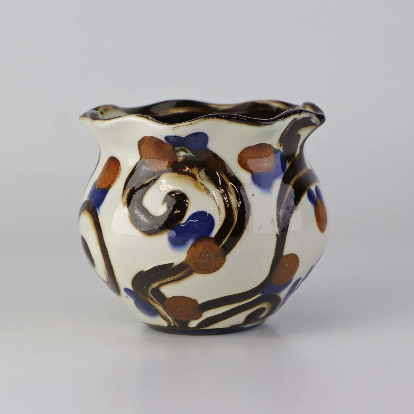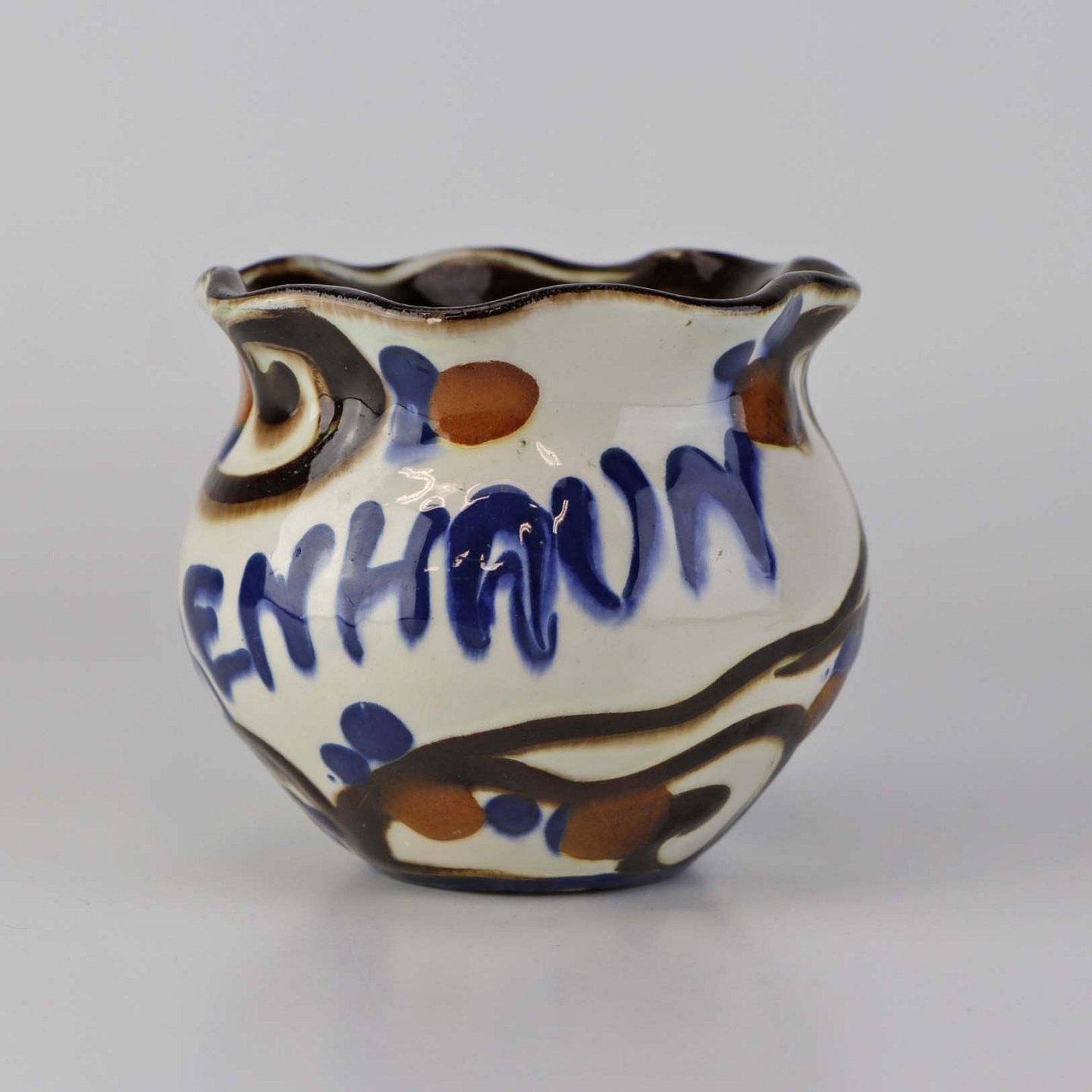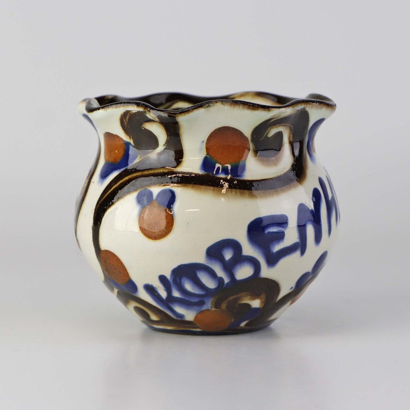 Mindre vase i glaseret keramik med teksten København og dekoreret med abstrakt mønster i brun, rød og blå på lys baggrund.