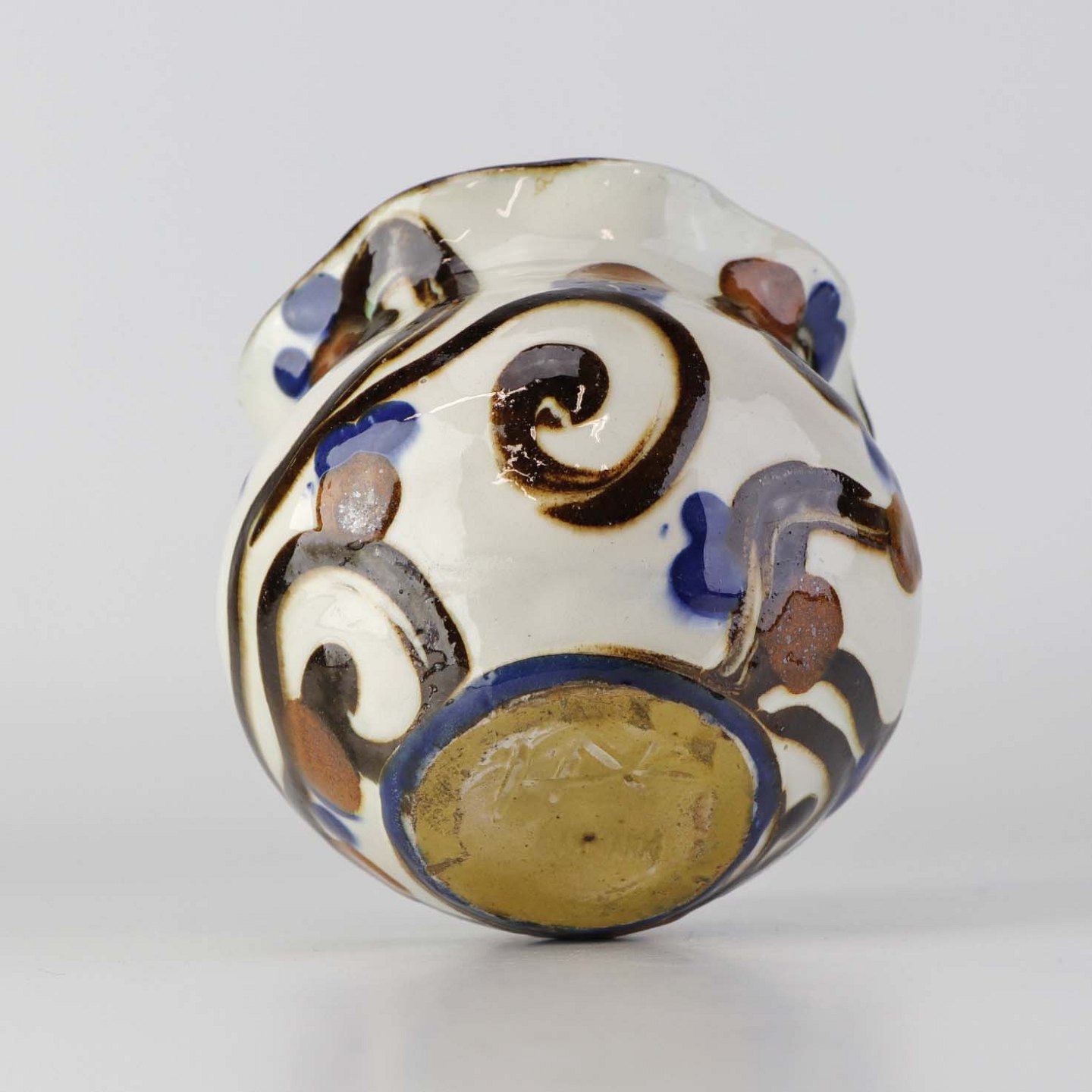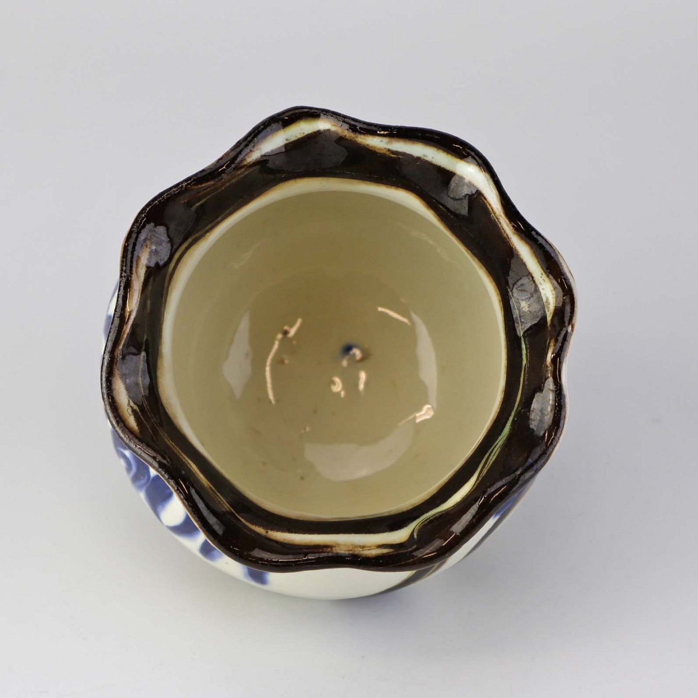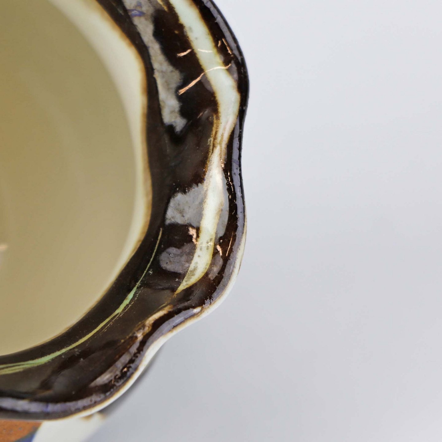 Fremstår med lettere ruhed i glasuren ved topkanten.