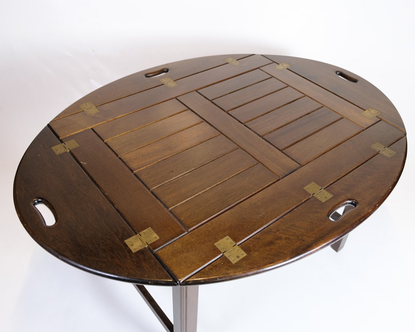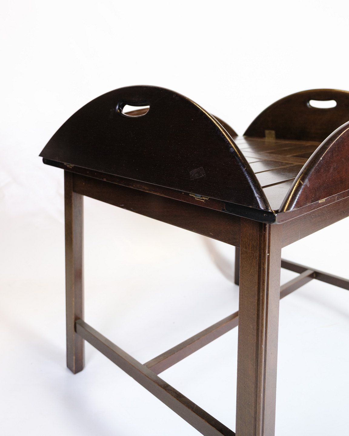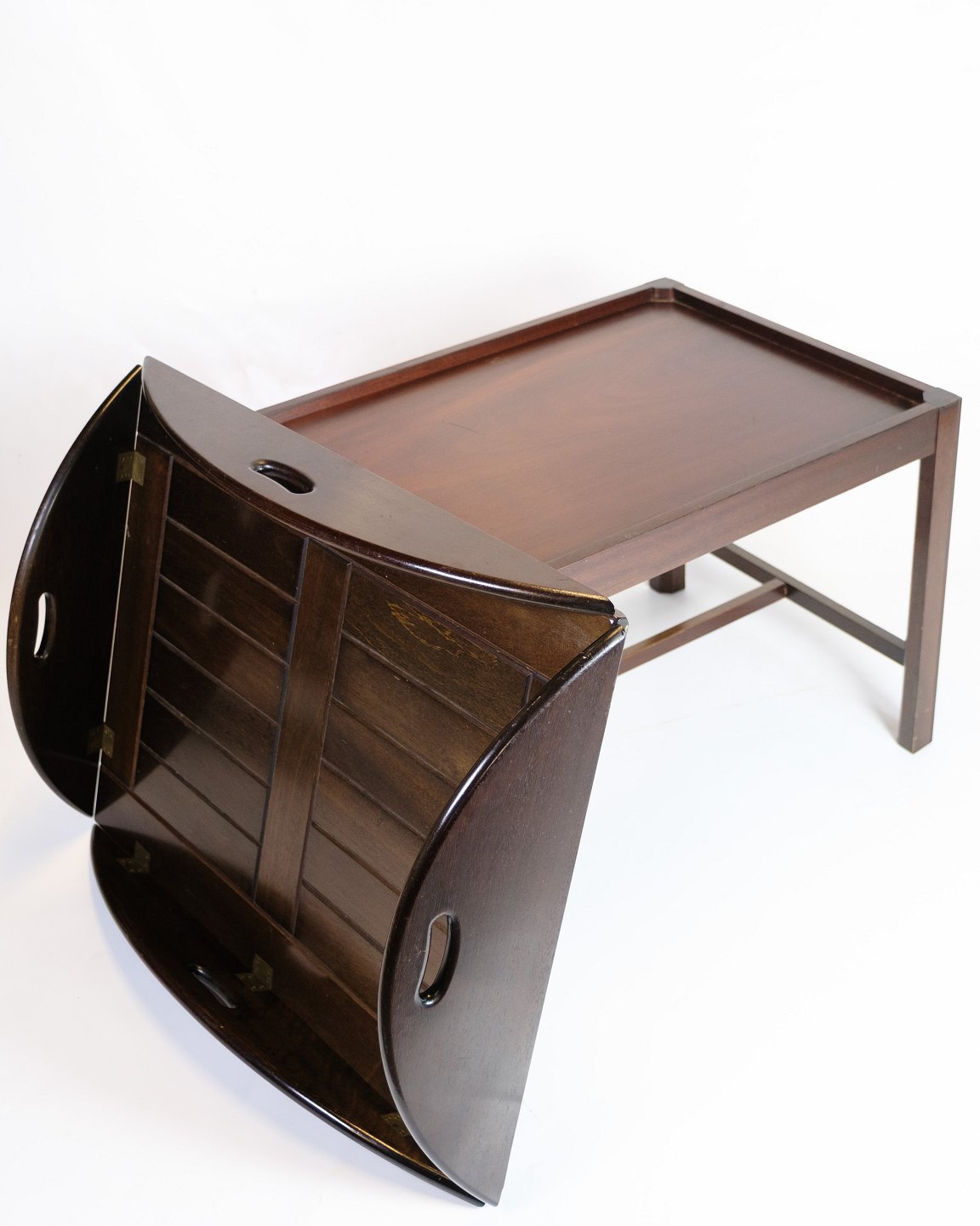 Klassisk butlerbord udført i mahogni med aftagelig bakke og foldbare ben, typisk for dansk design i 1960’erne. Bordet kombinerer funktionalitet med enkelt formsprog og passer perfekt som serveringsbord eller sidebord.