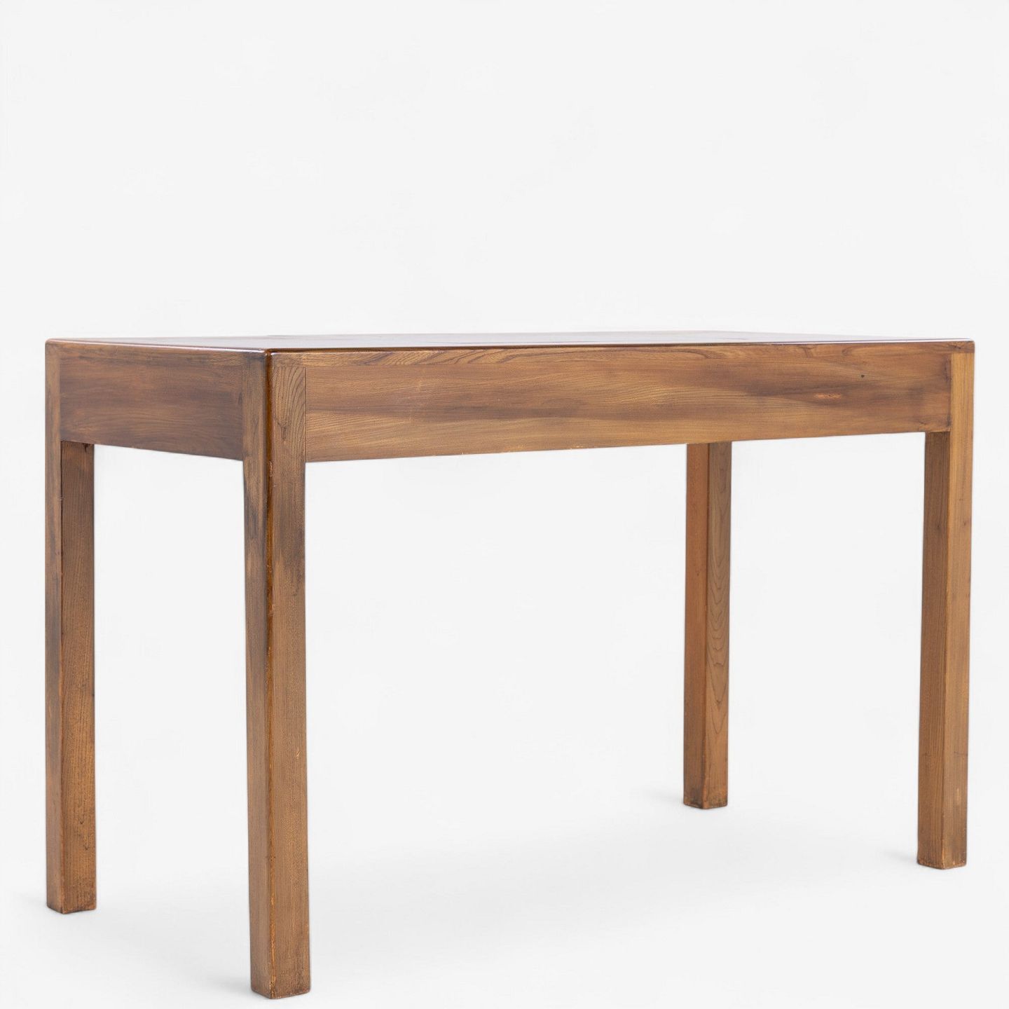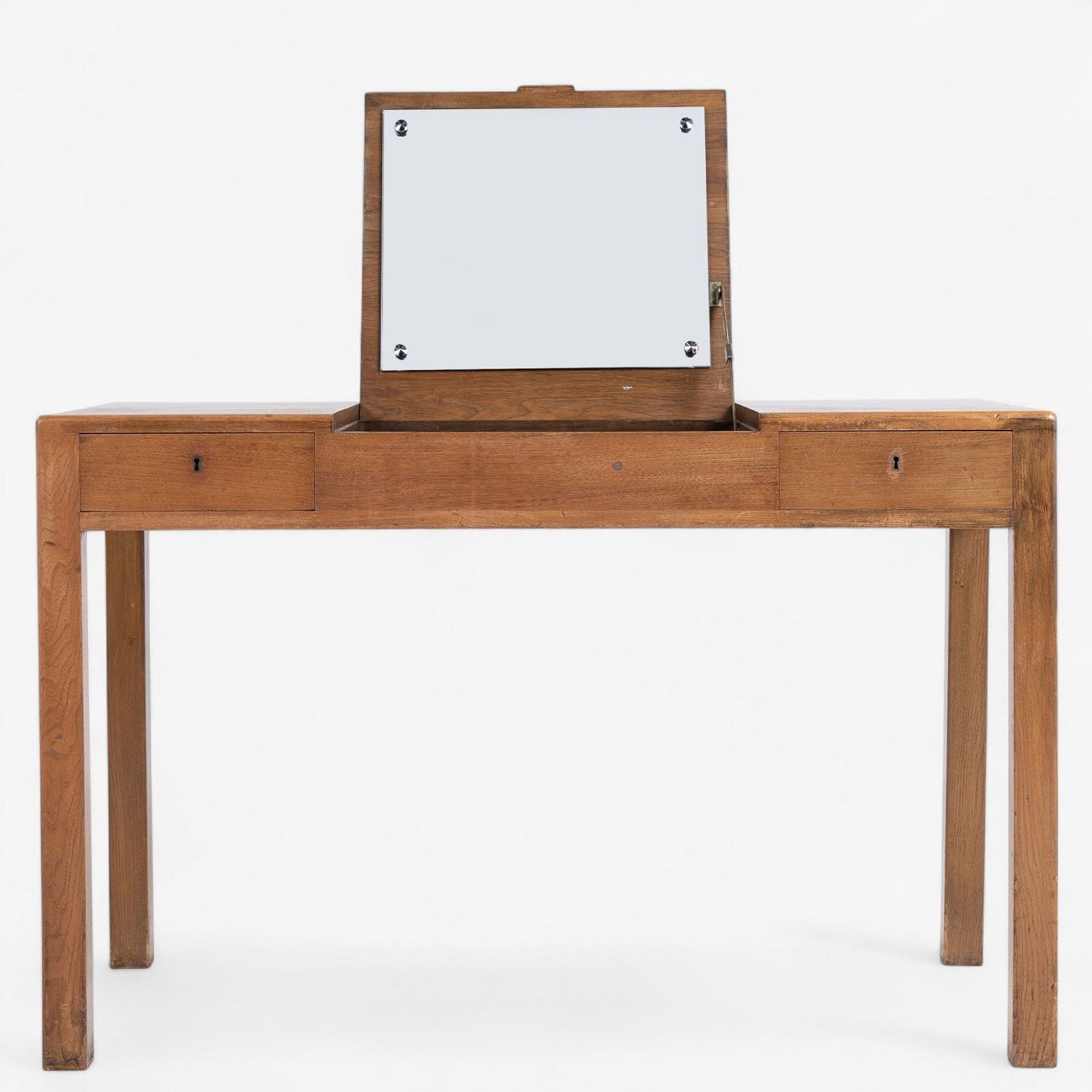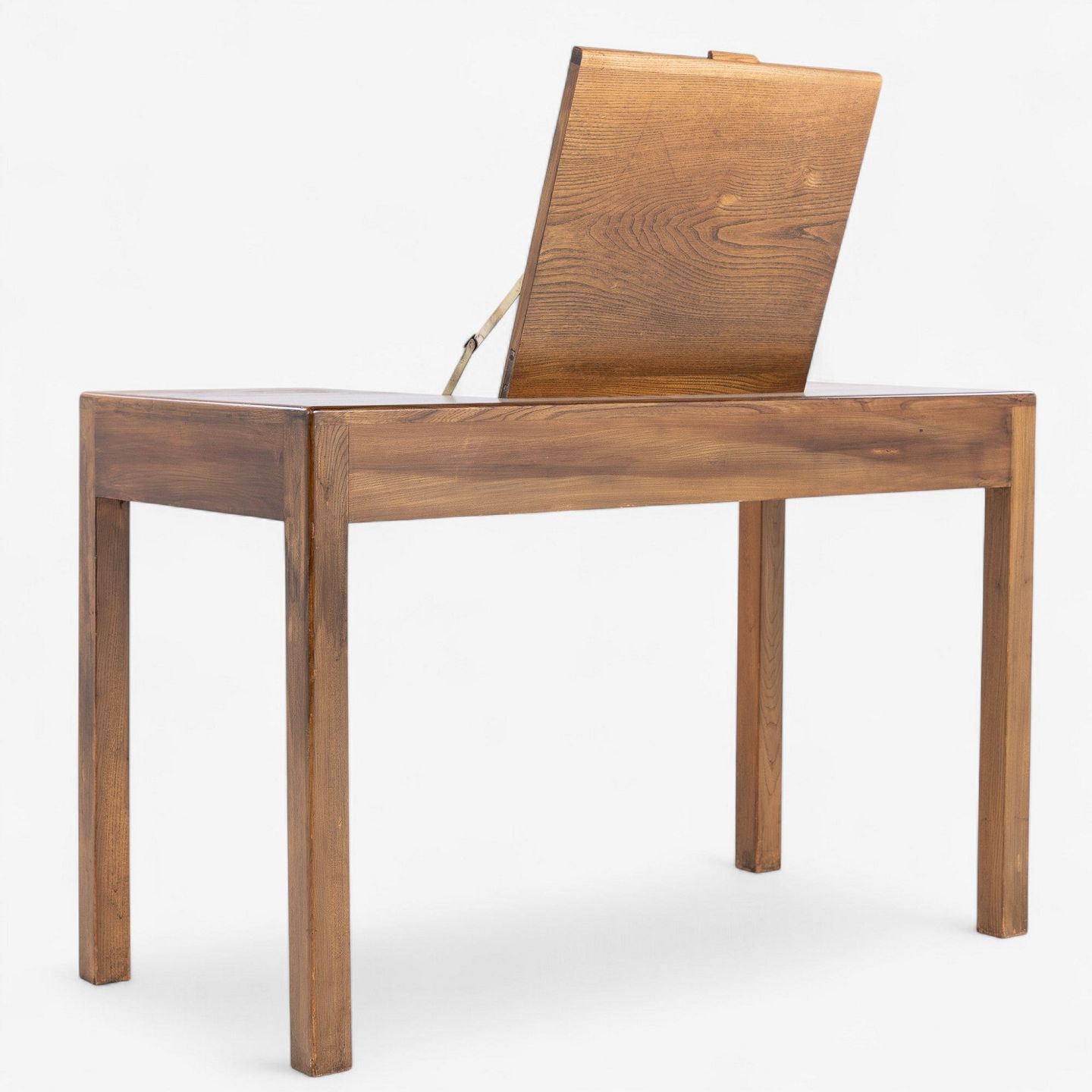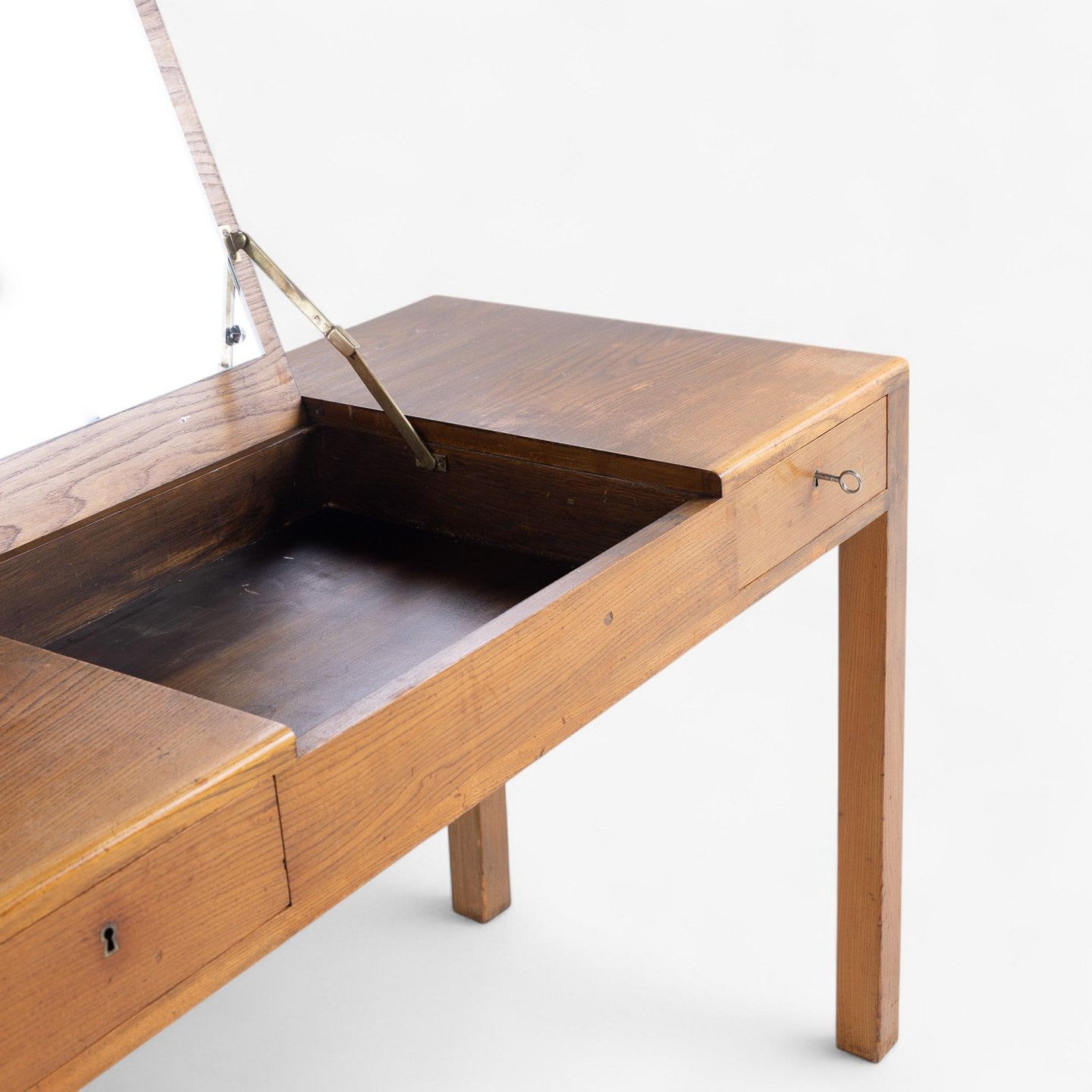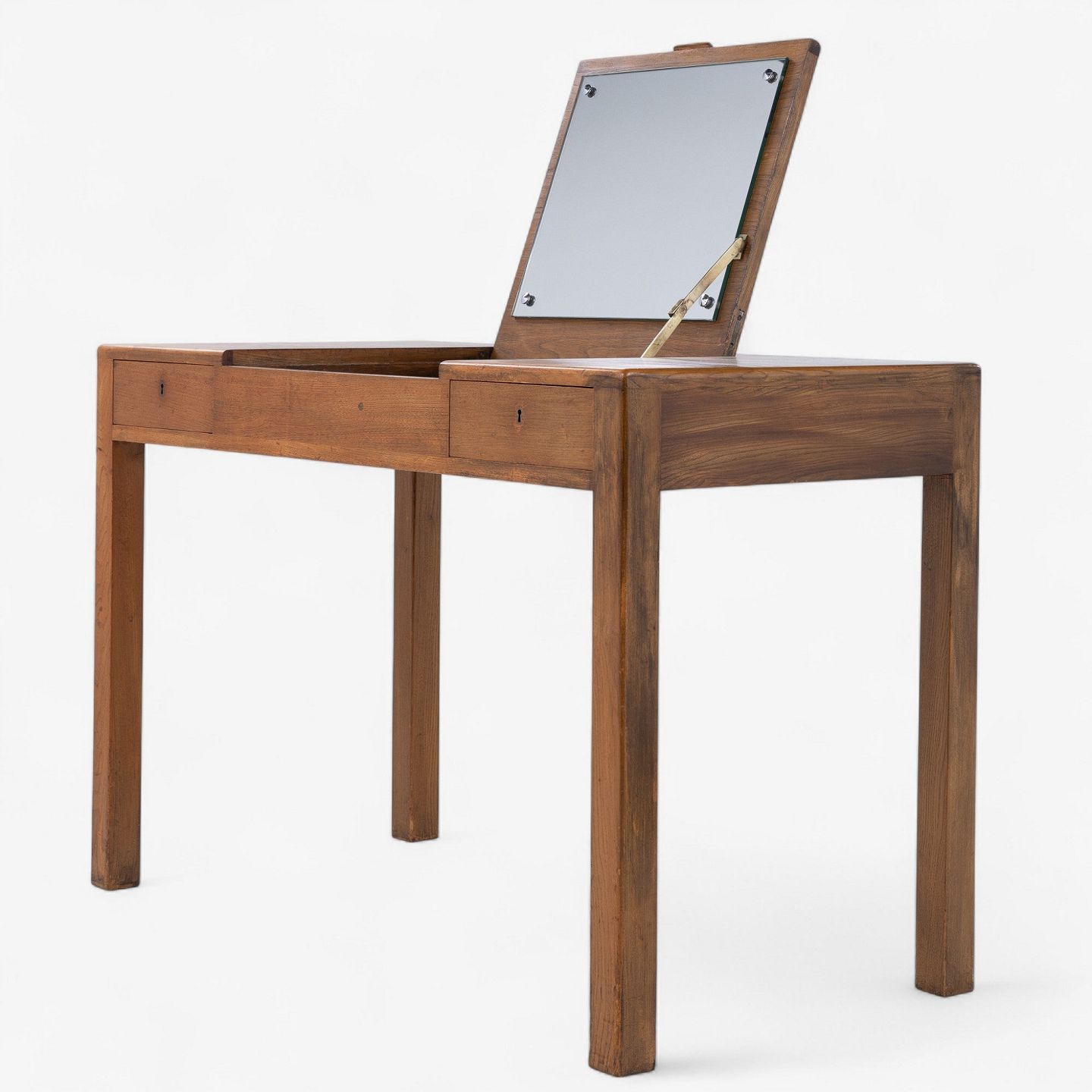 Sminkebord i patineret elmetræ med opklappeligt spejl og to skuffer.