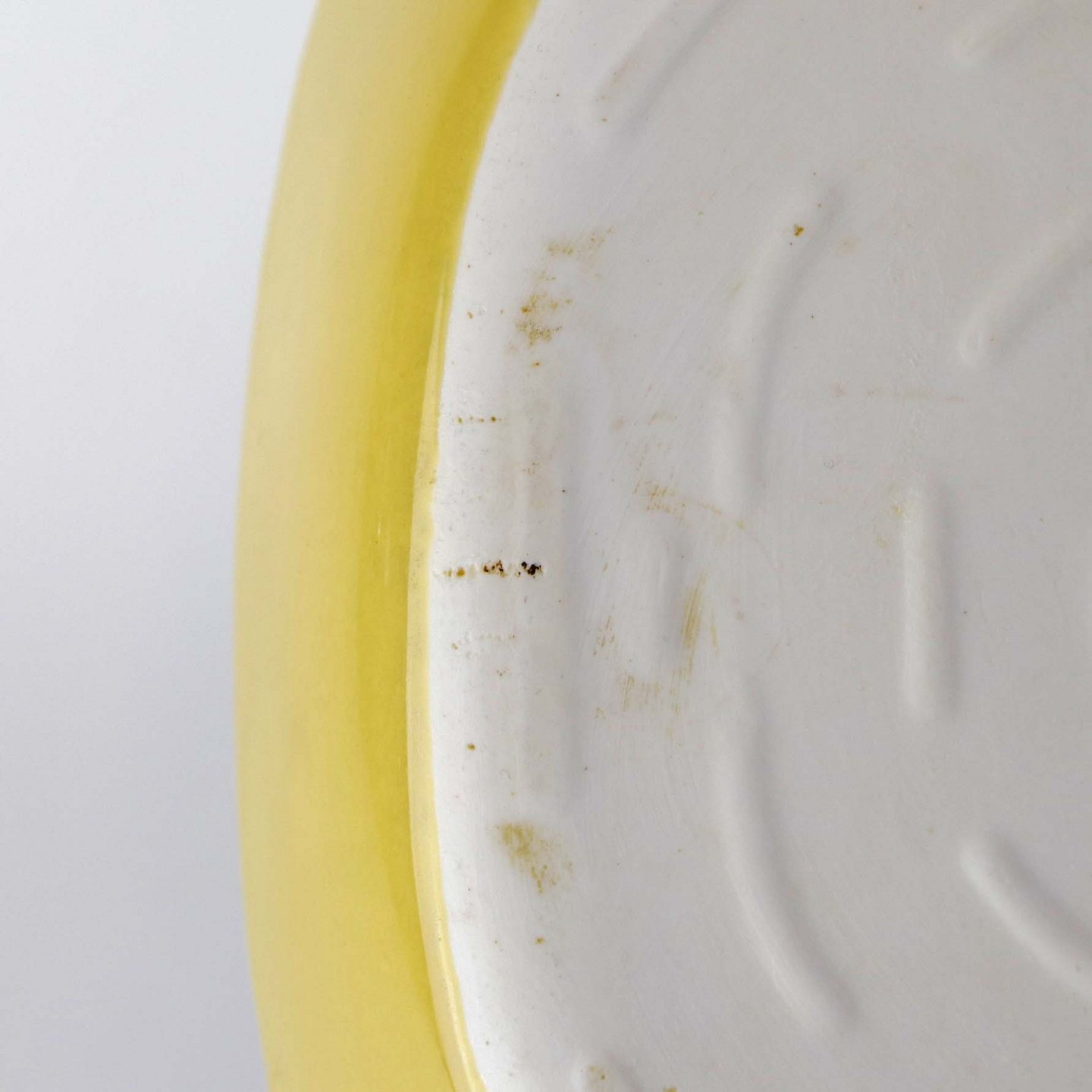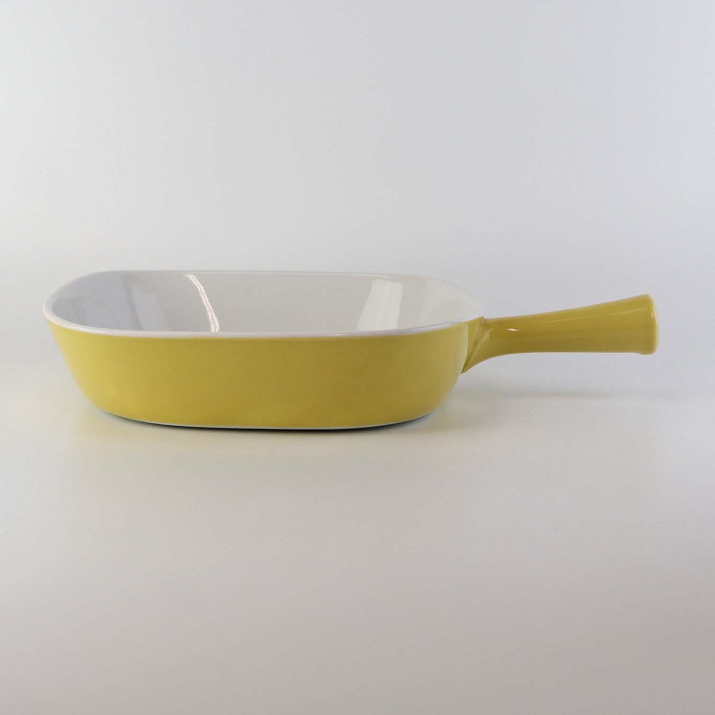 Stellet er fremstillet i ildfast glat porcelæn dekoreret med gul glaseret yderside og hvid glaseret inderside.