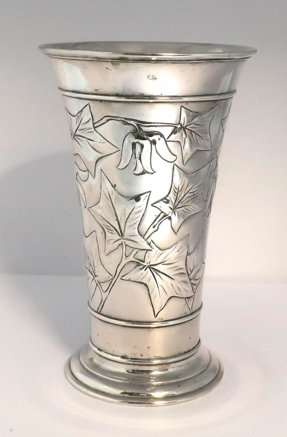 K. Tømmerup, København (K.T.). Sølv vase med blomster motiv (830). Højde 18,5 cm. Produceret 1906.