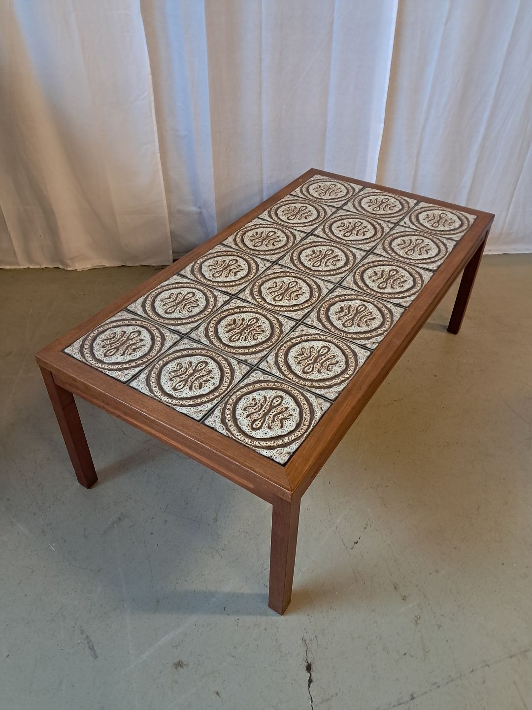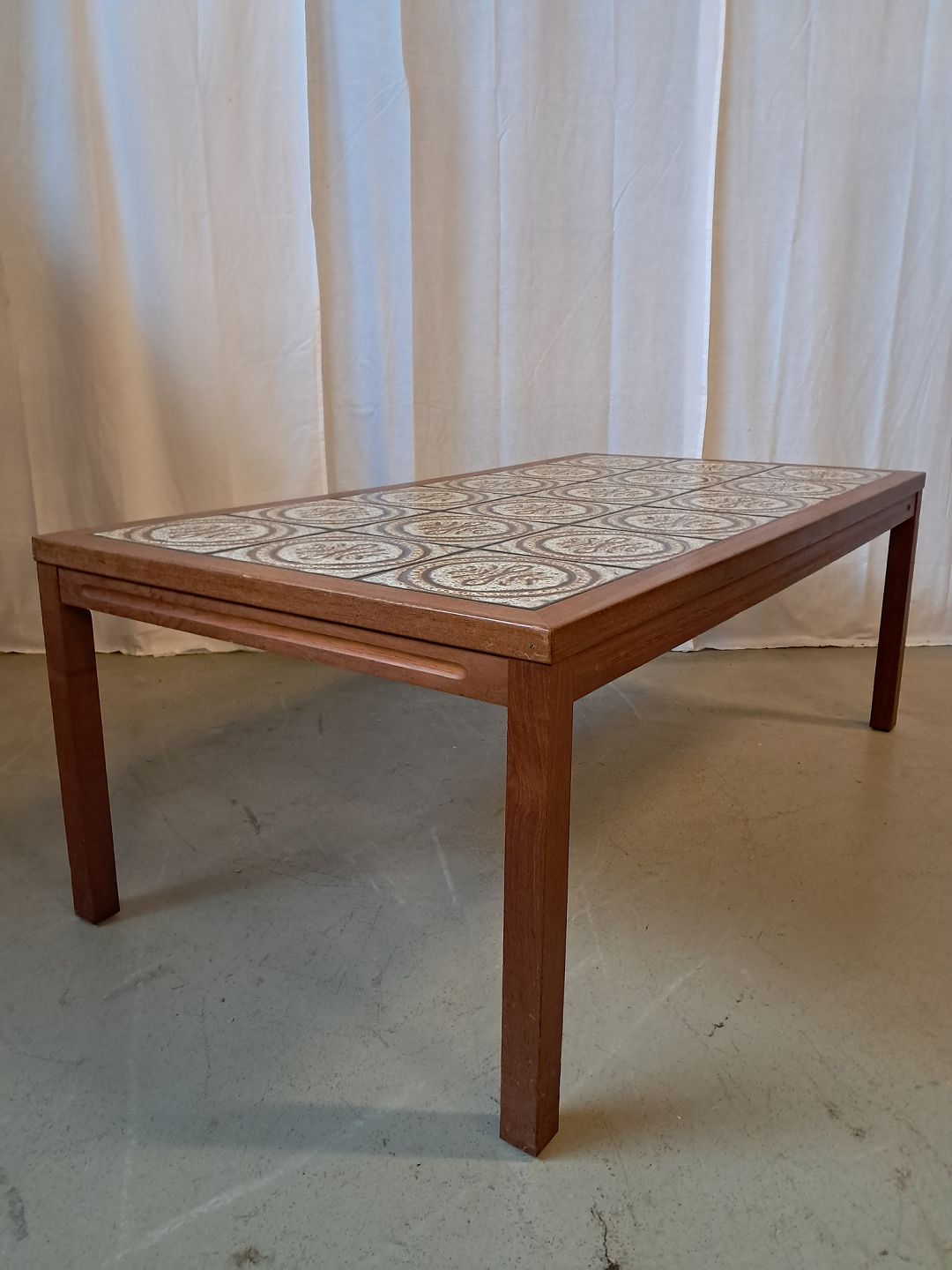 Sofabord i fineret teaktræ med kakler, fra 1960erne.