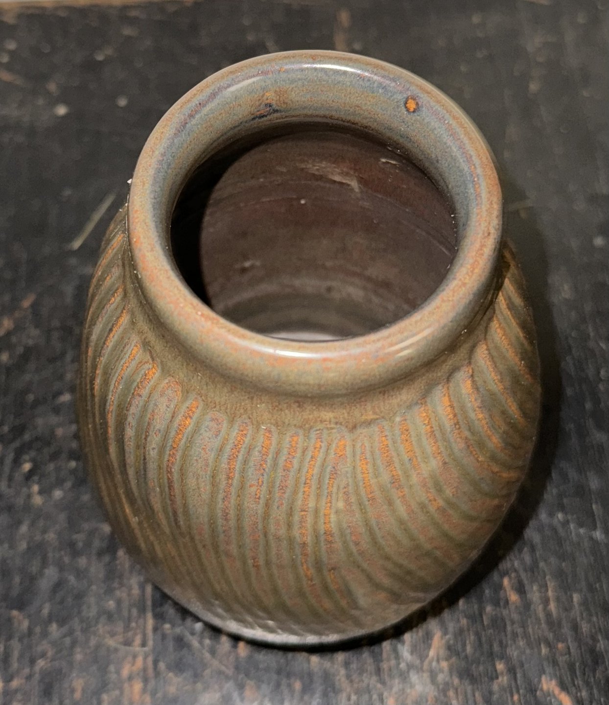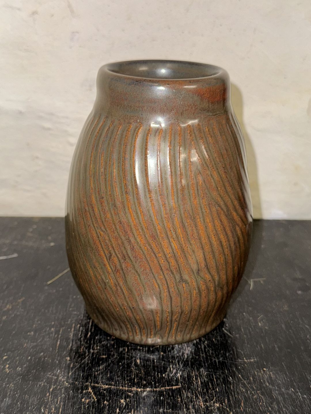 Ceramic vase from Lauritz Hjorth on Bornholm. Decorated with vertical (turning) grooves. Covered in brown glaze. Presumably made in the 1940s. In good condition. Factory mark on the bottom. Dimensions: H. 14.5 cm