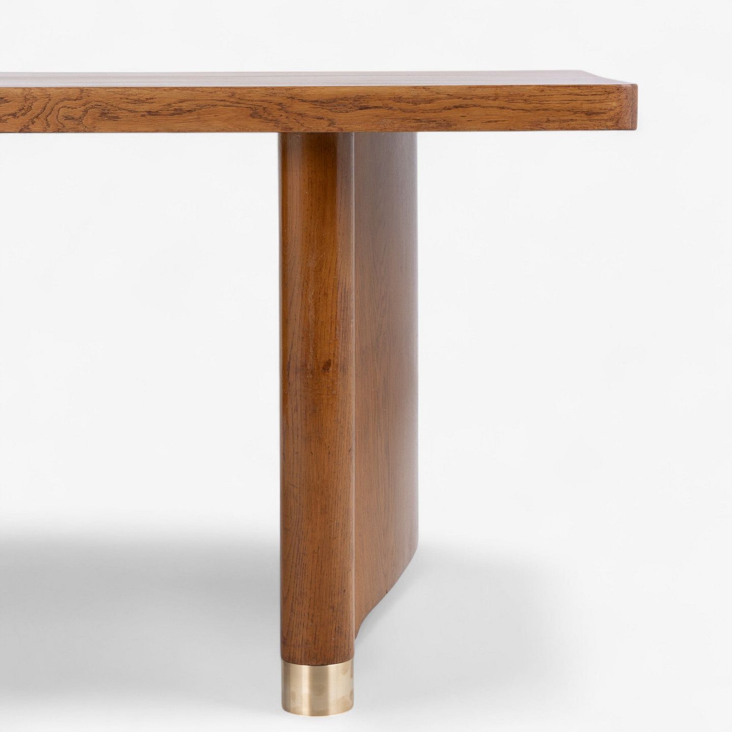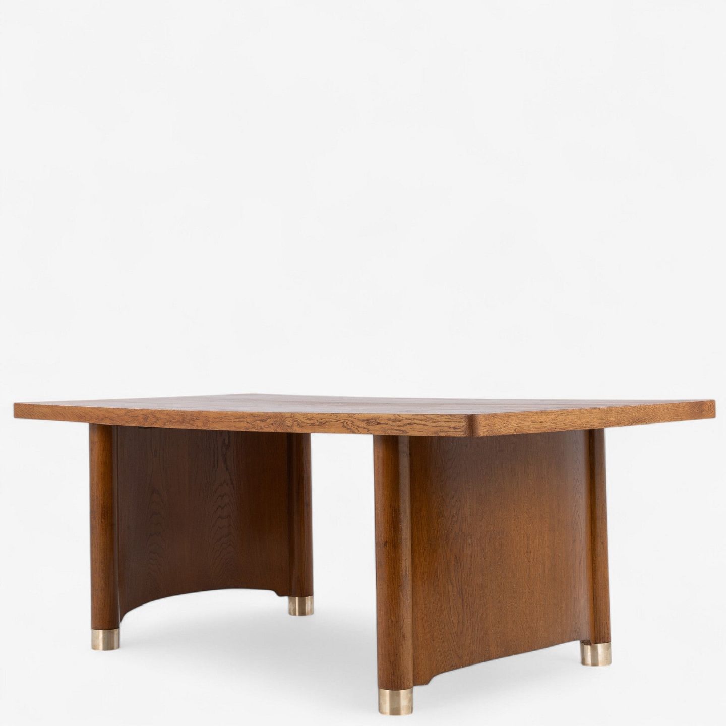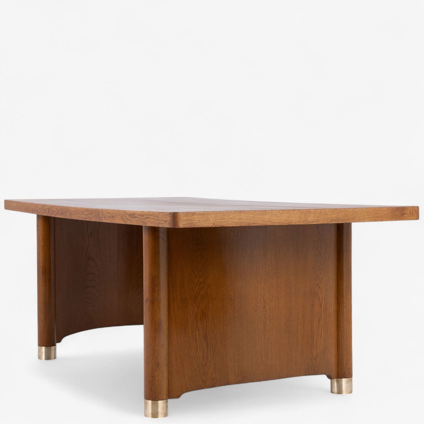 Stort 'Art Deco'-spisebord/skrivebord i patineret egetræ med buede søjleben og sko i messing. Fra 1930'erne.