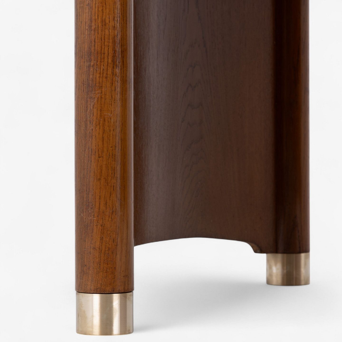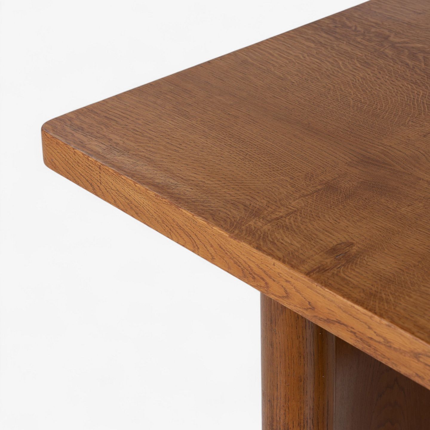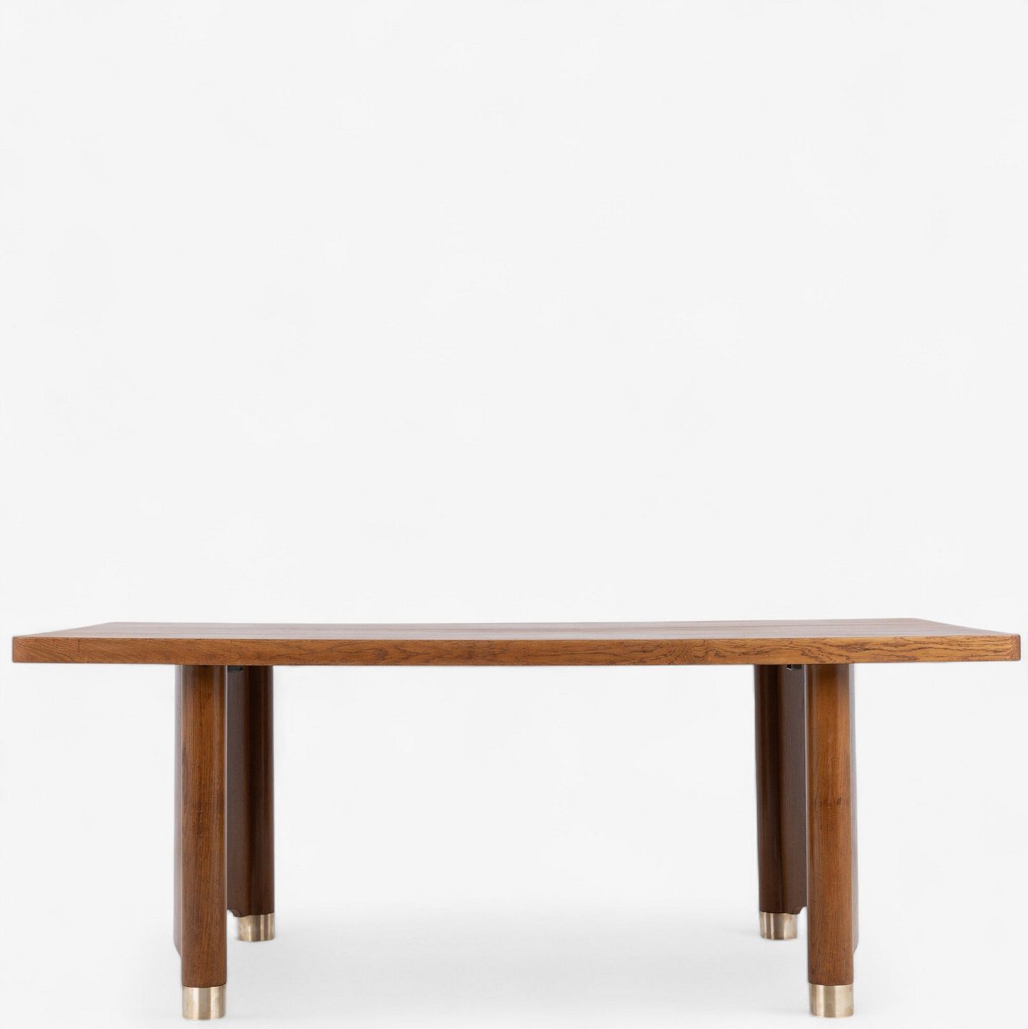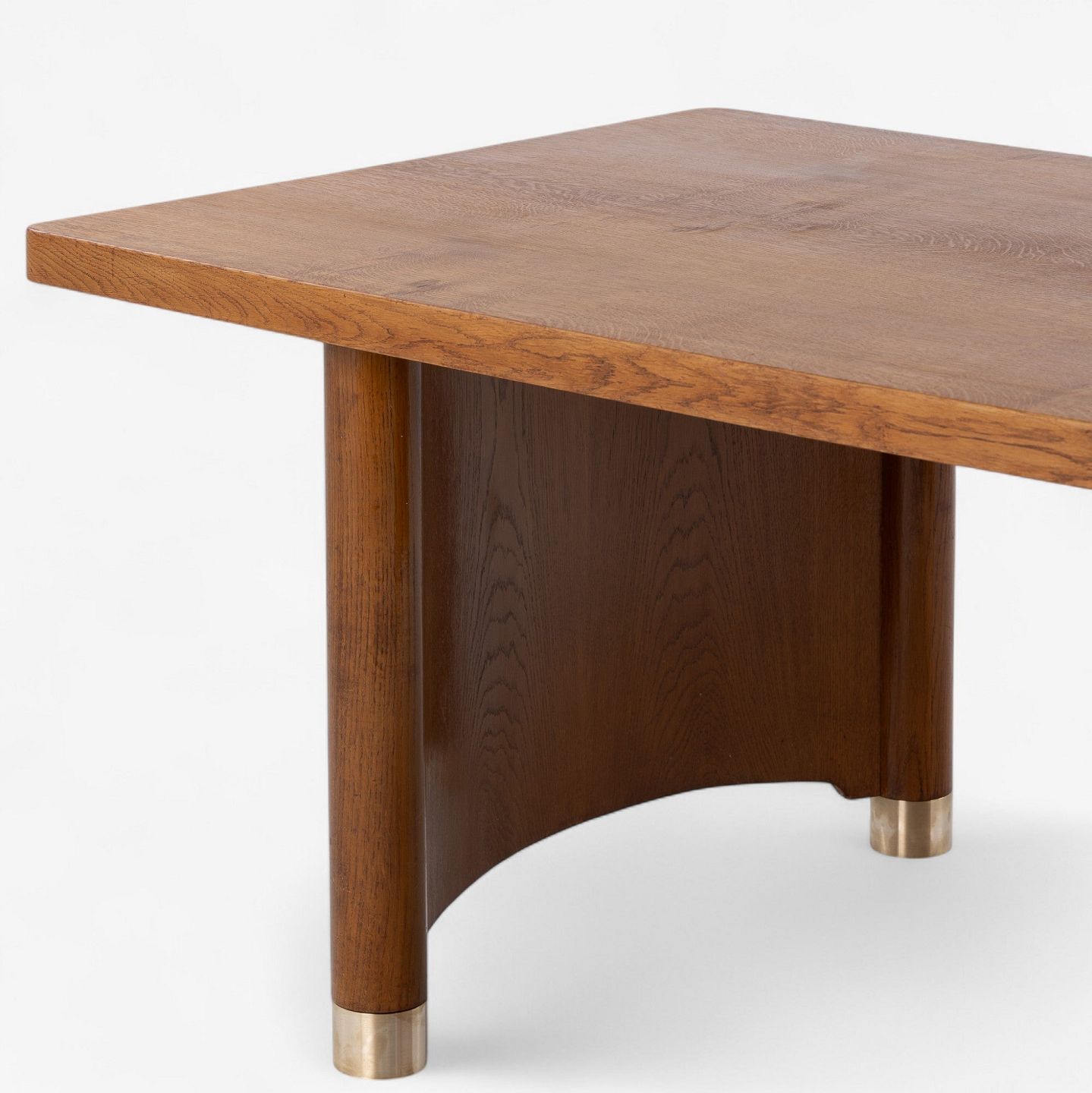 Stort 'Art Deco'-spisebord/skrivebord i patineret egetræ med buede søjleben og sko i messing. Fra 1930'erne.
