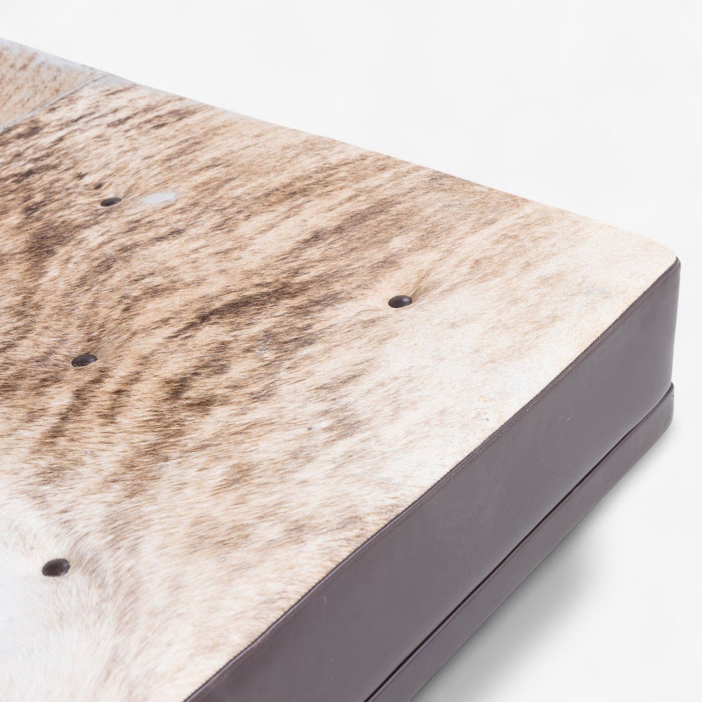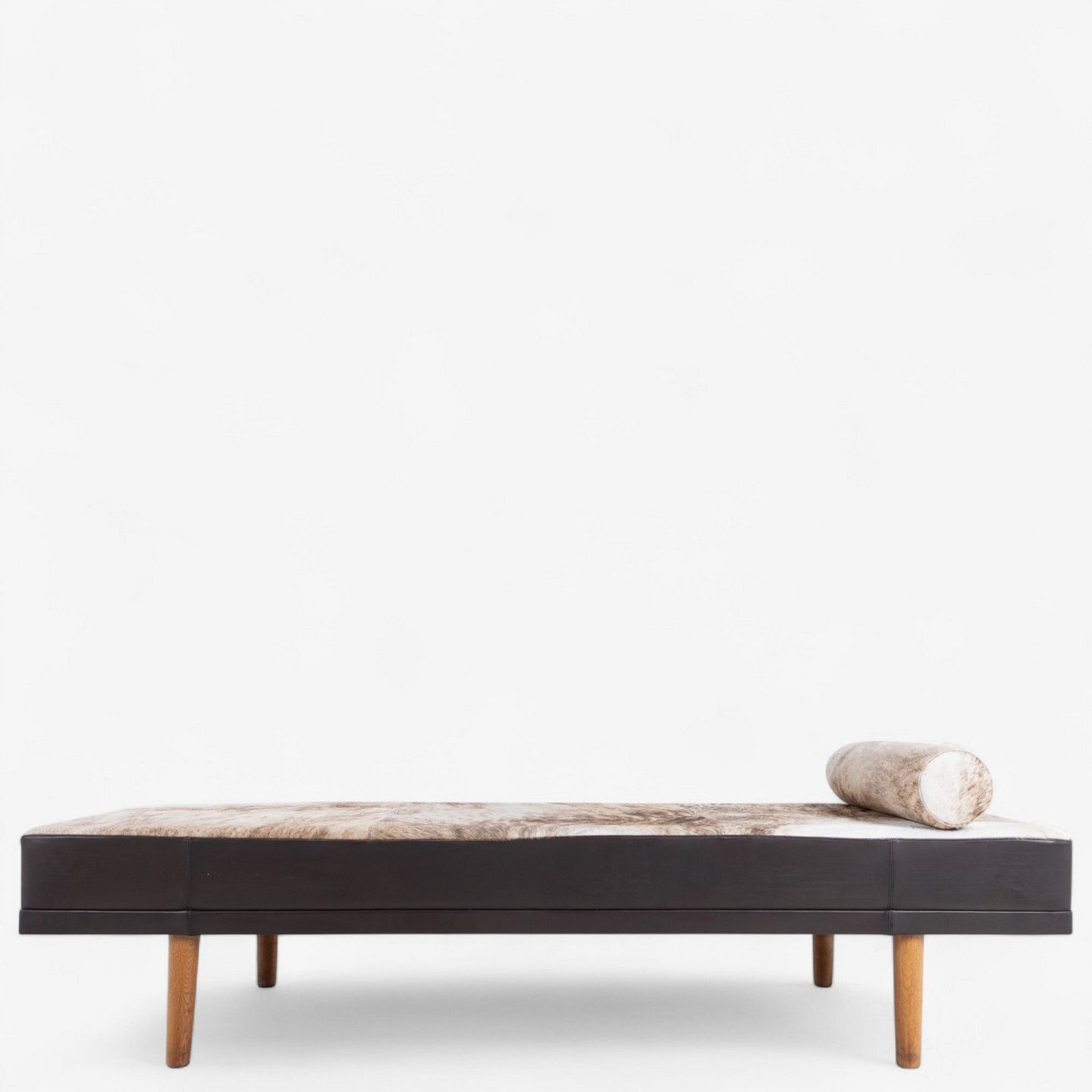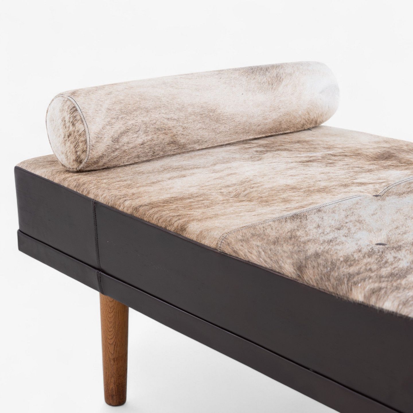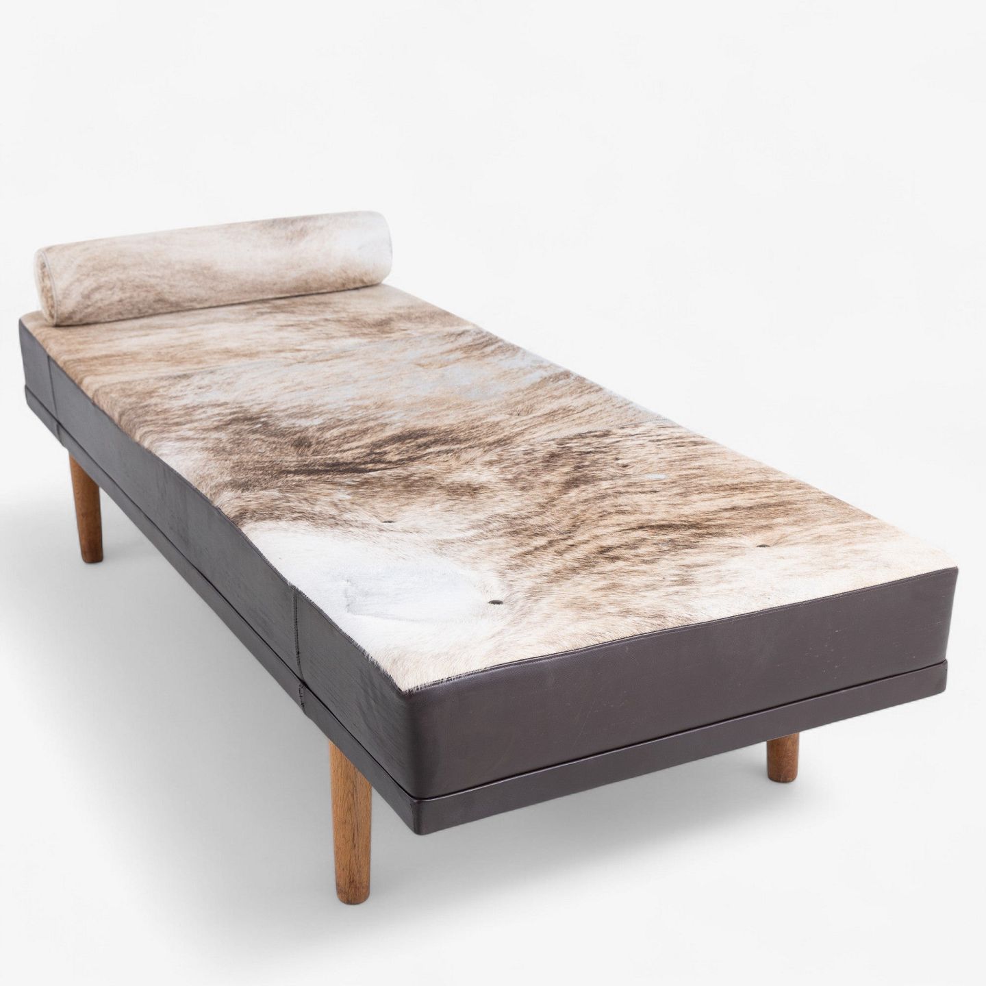 Daybed betrukket i koskind med keder i læder og ben i bøgetræ.