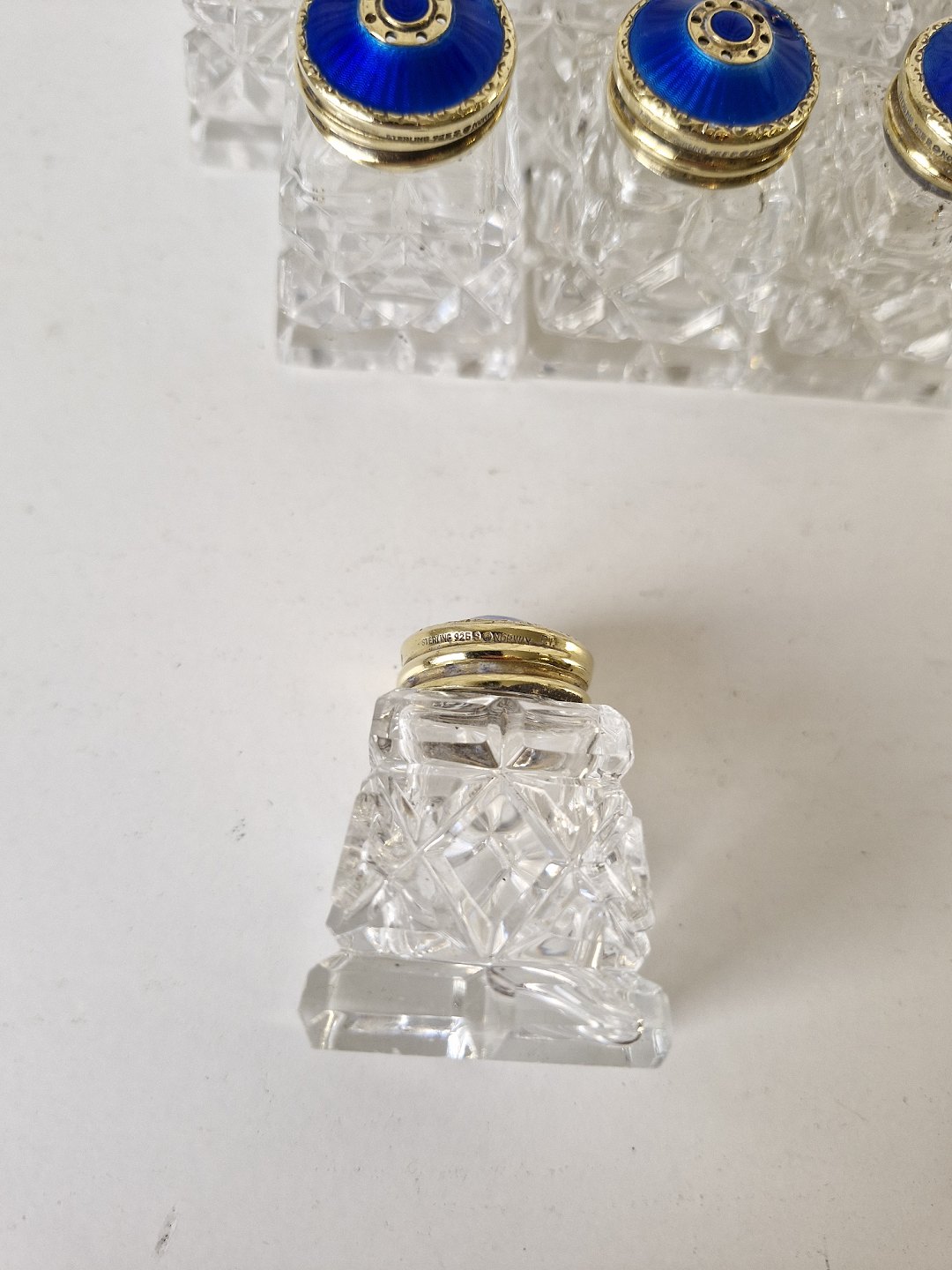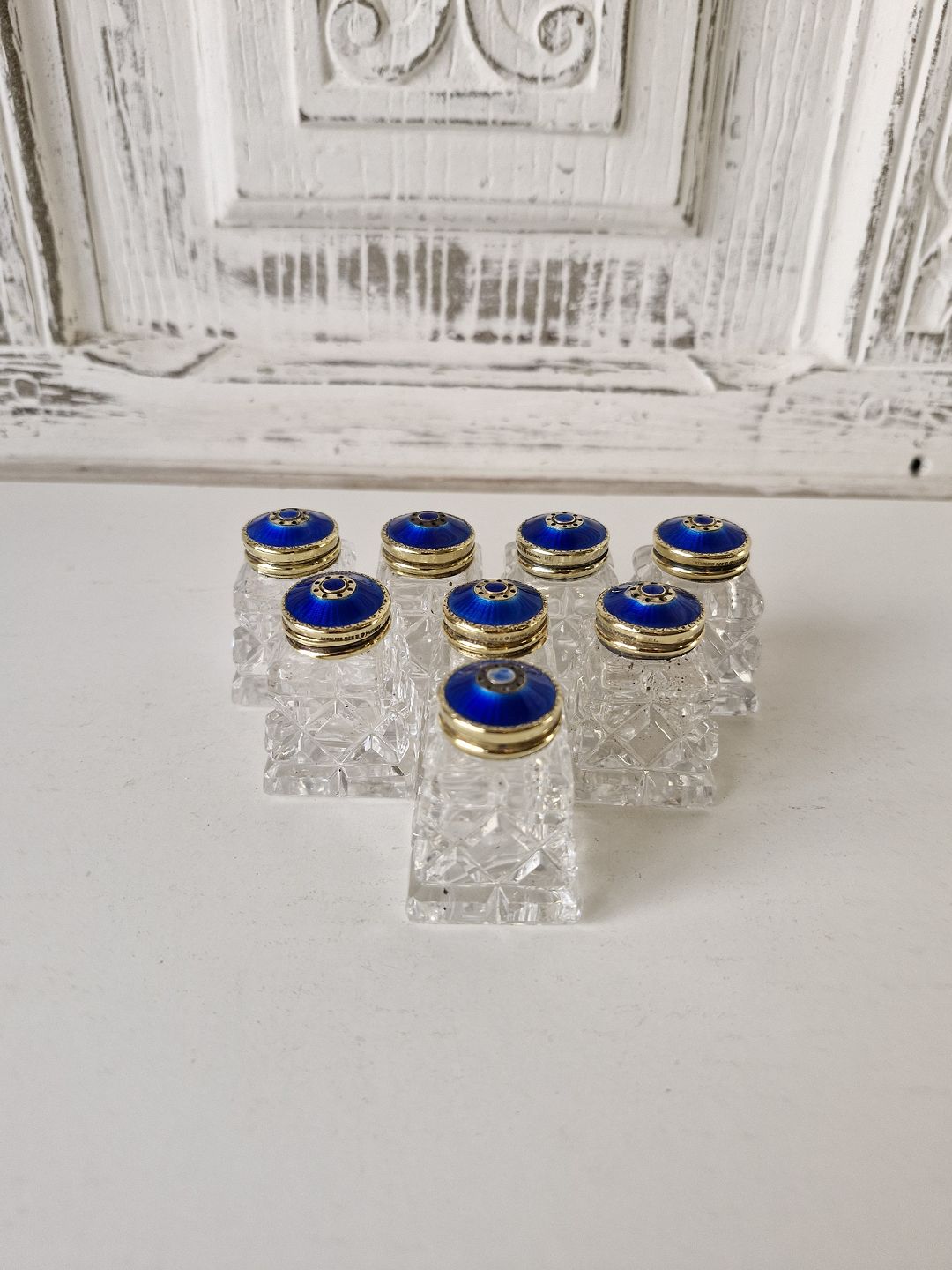 Sæt på 8 saltbøsser i krystal med låg i forgyldt sølv og emalje
