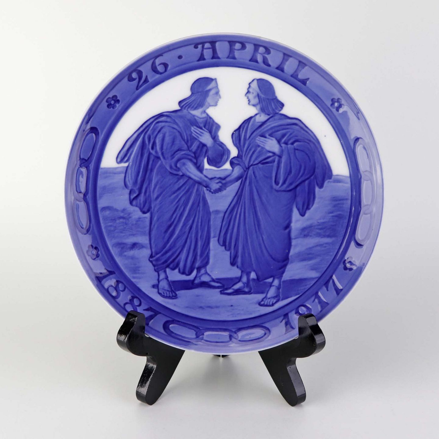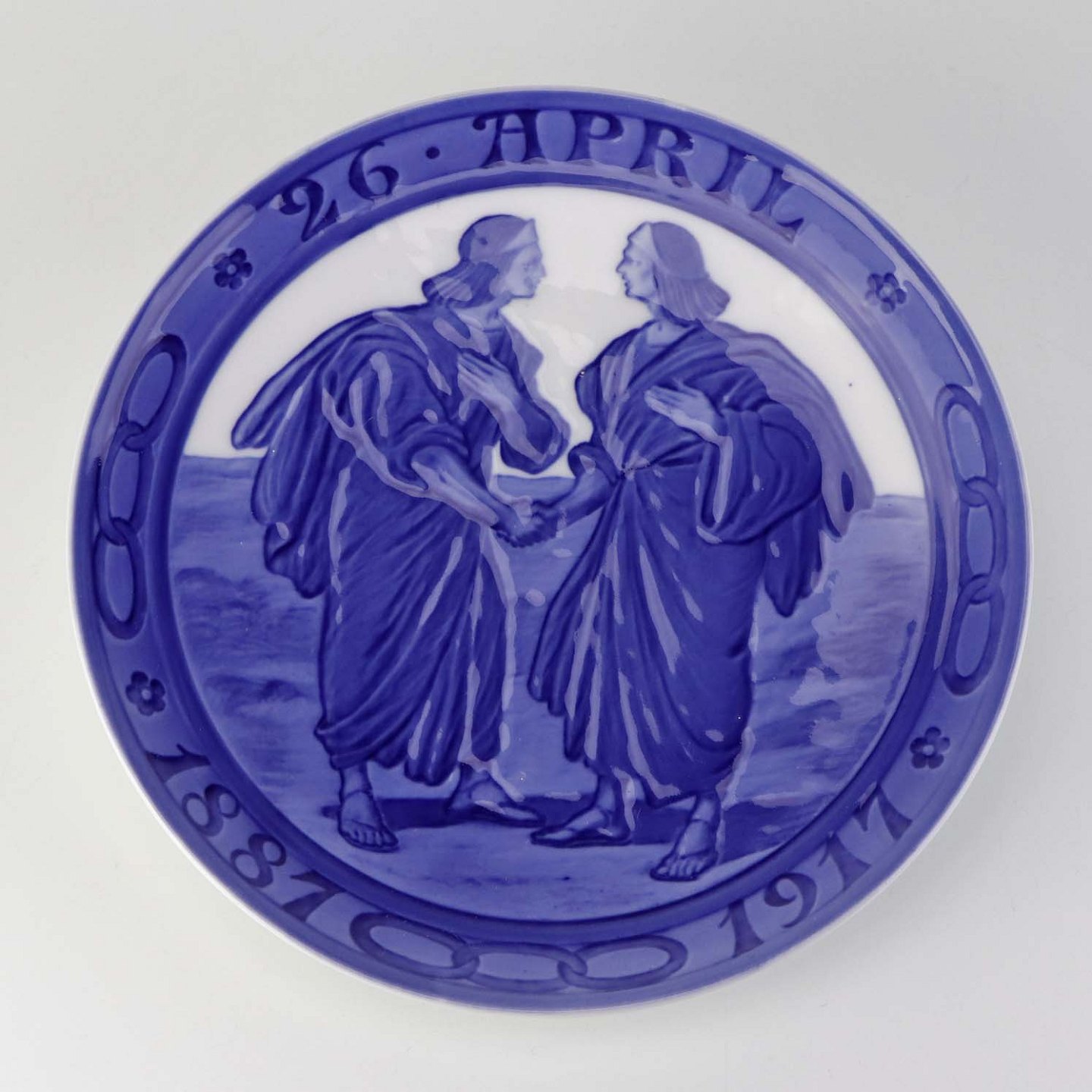 Mindeplatte i porcelæn med motiv af to mænd som giver hånd. Udgivet i anledning af 30 års jubilæet for Odd Fellow logen med teksten 26. april 1887-1917. Nr. 135