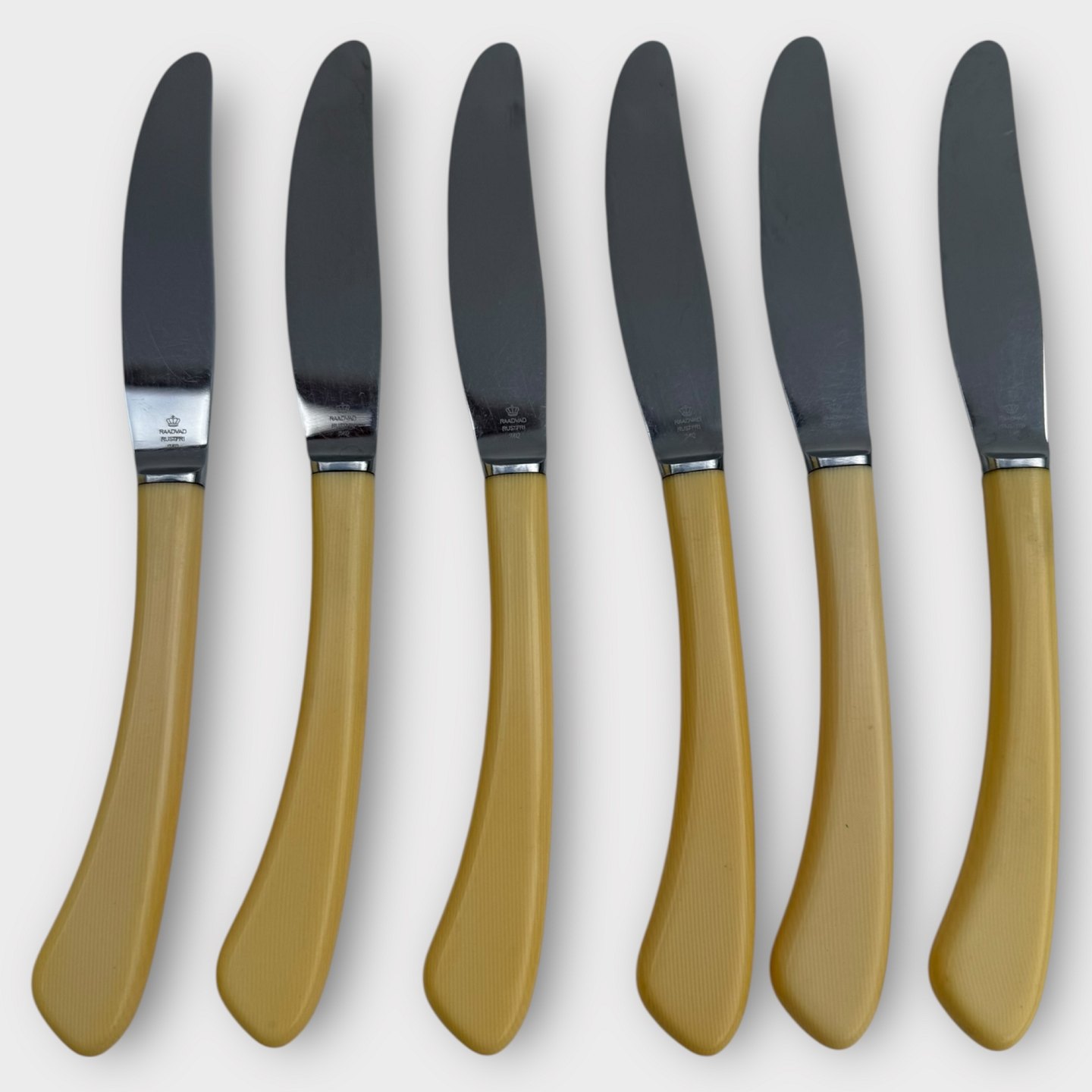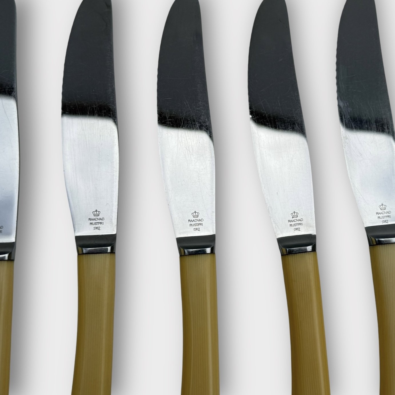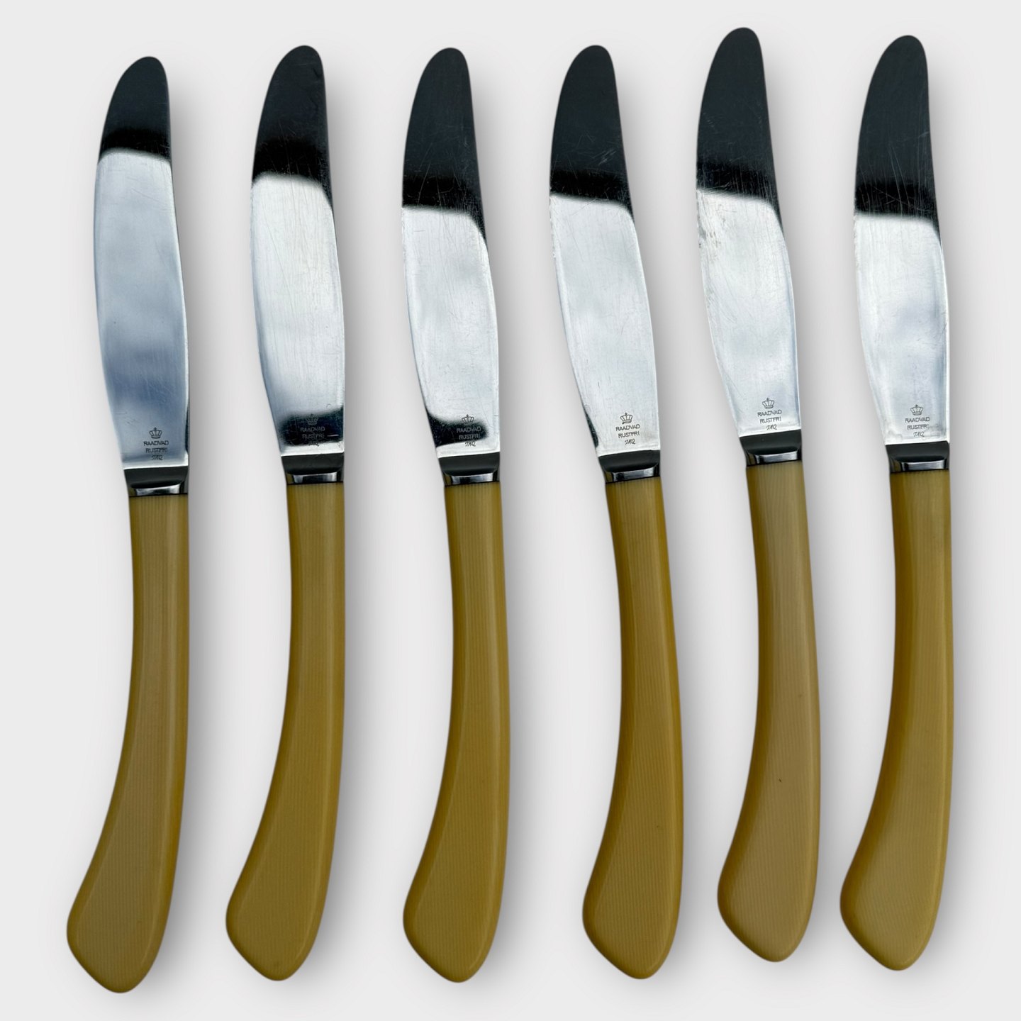 Jens Harald Quistgaard, Knive med lyse kunststofskafter og rustfri stålblade med skær, fremstillet hos Raadvad knivfabrik, 21,5cm lang, pæn stand