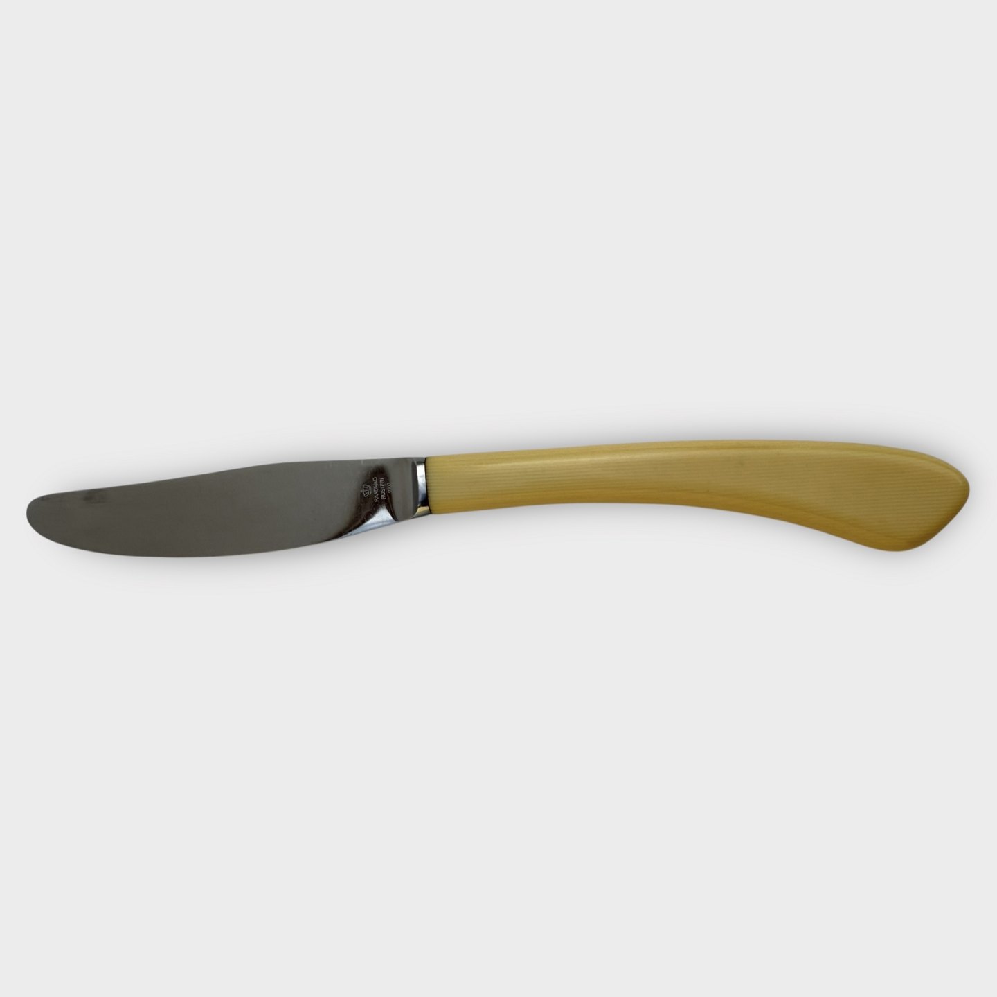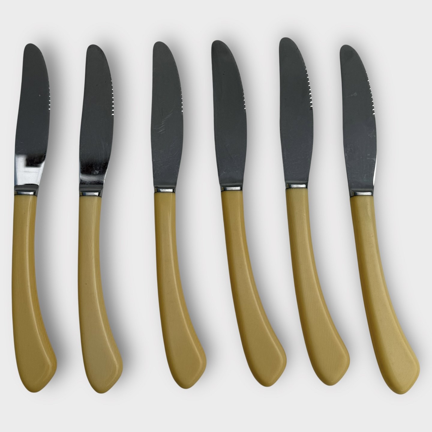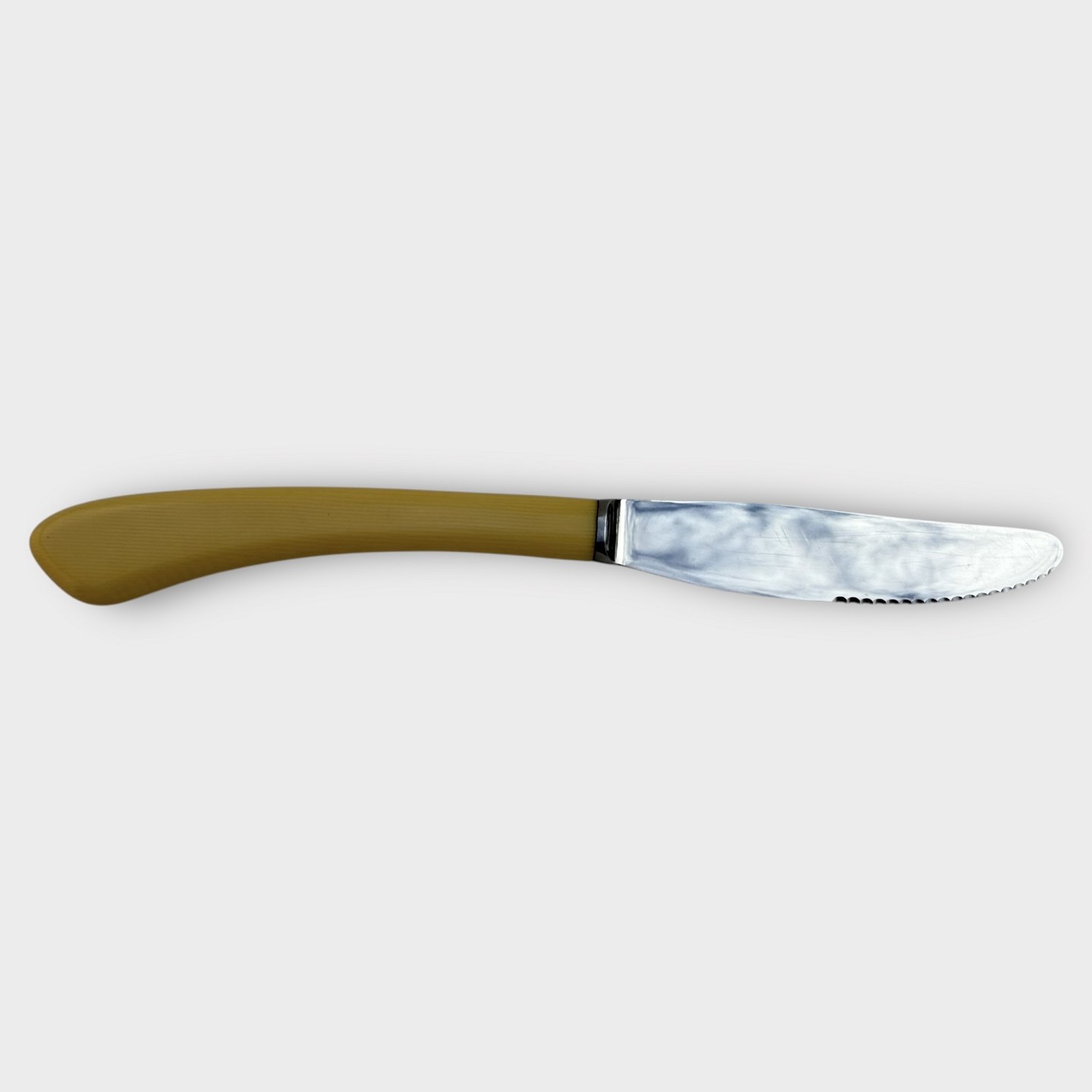 Jens Harald Quistgaard, Knive med lyse kunststofskafter og rustfri stålblade med skær, fremstillet hos Raadvad knivfabrik, 21,5cm lang, pæn stand