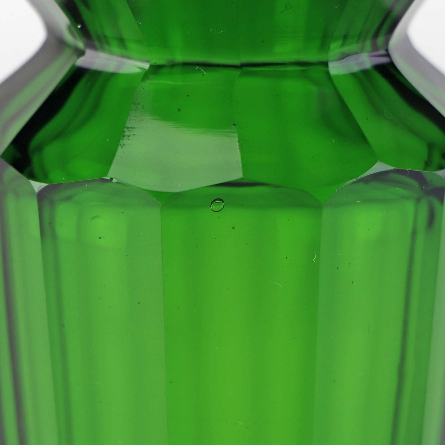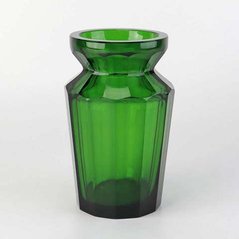 Lille vase i mundblæst grønt glas med facetslebet kantede sider og rund topkant.