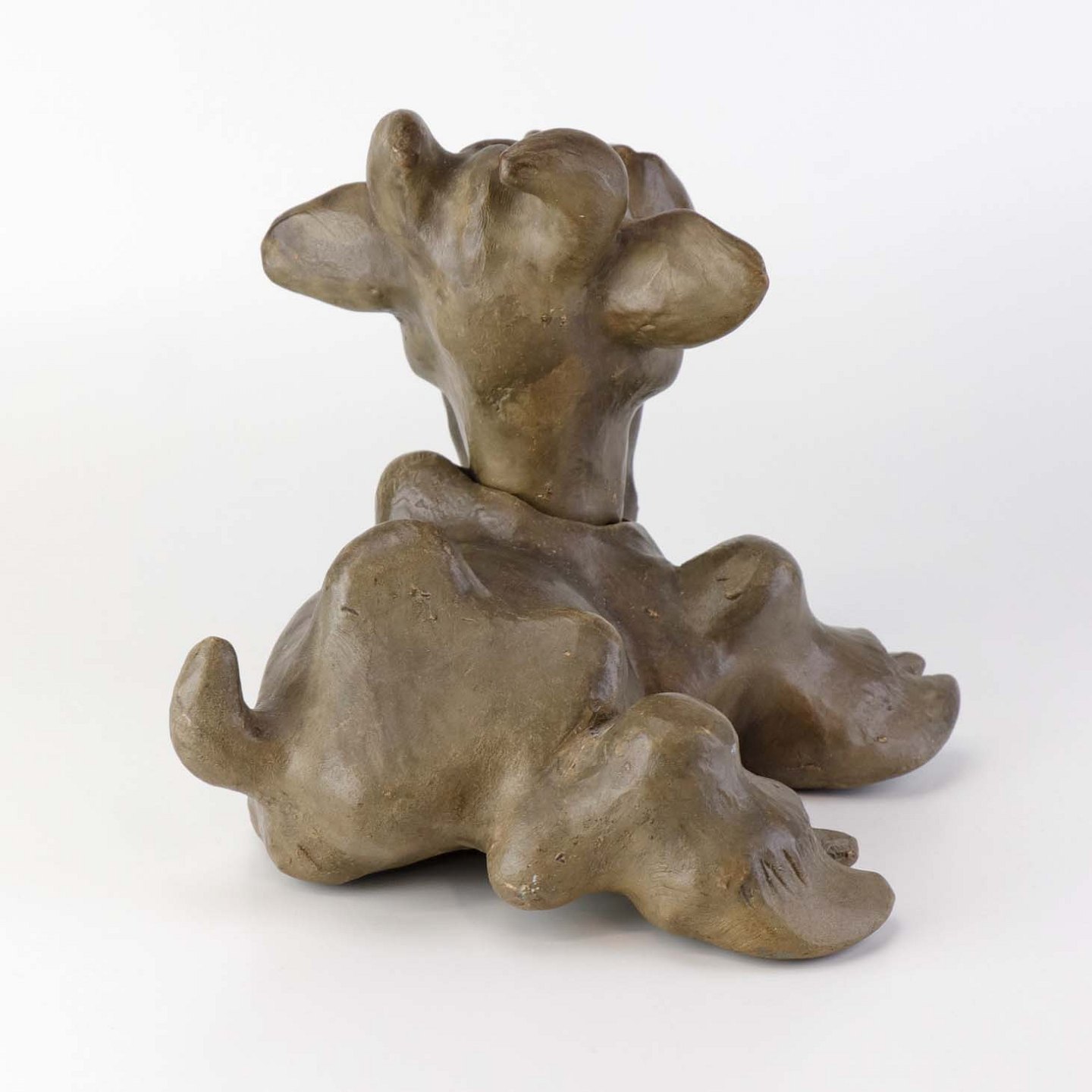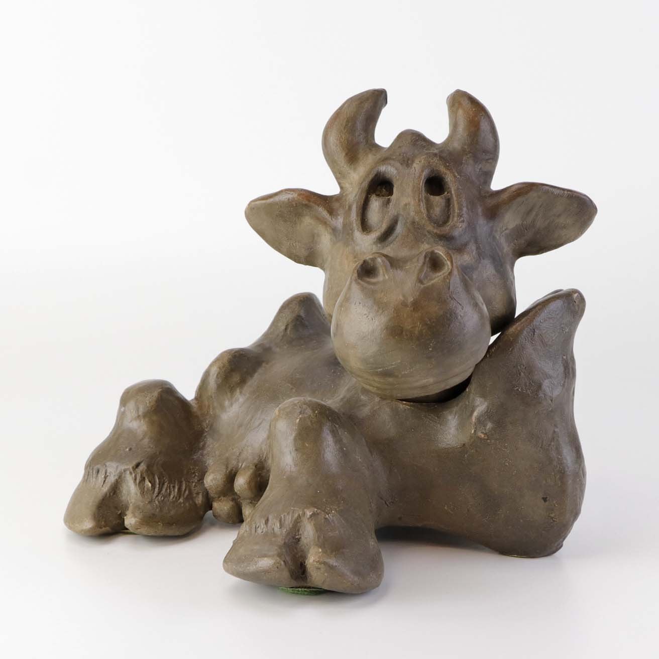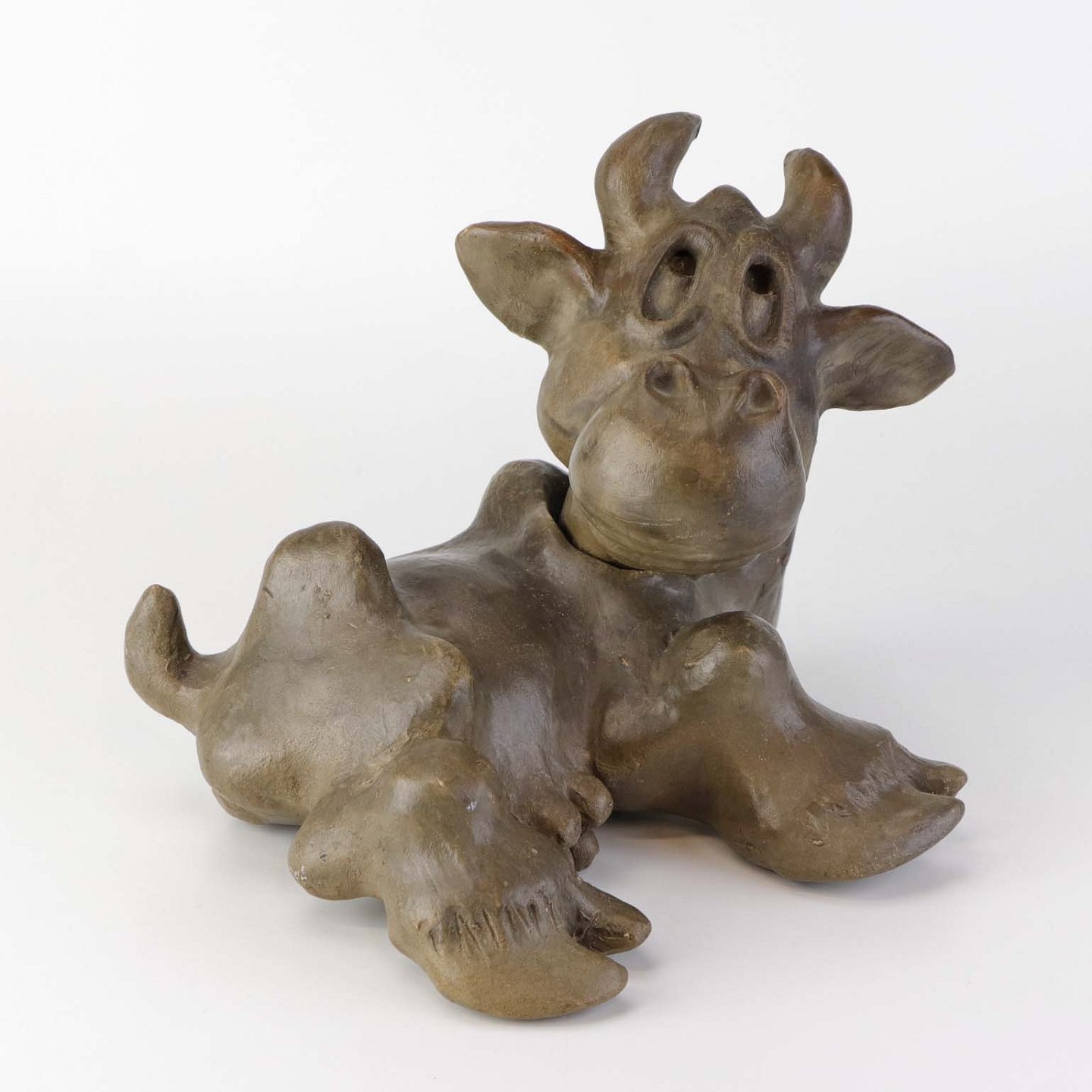 Figur i keramik med motiv en liggende ko med bevægeligt hoved som hviler den ene hov. Hovedet kan roteres.