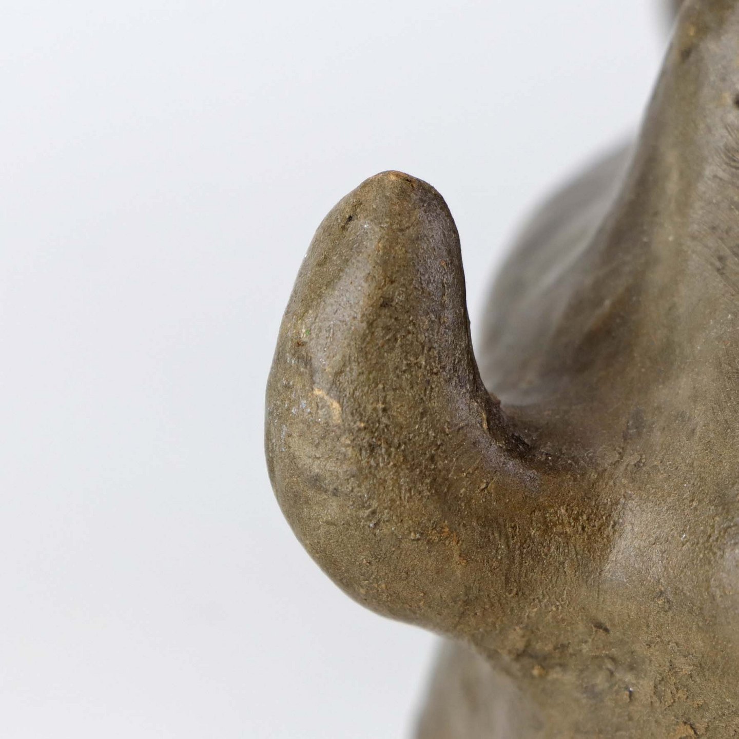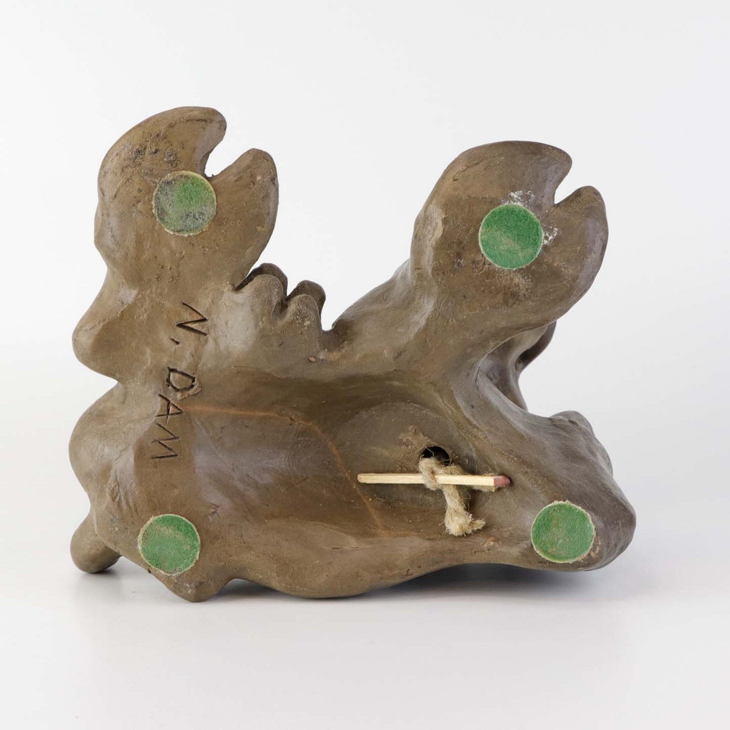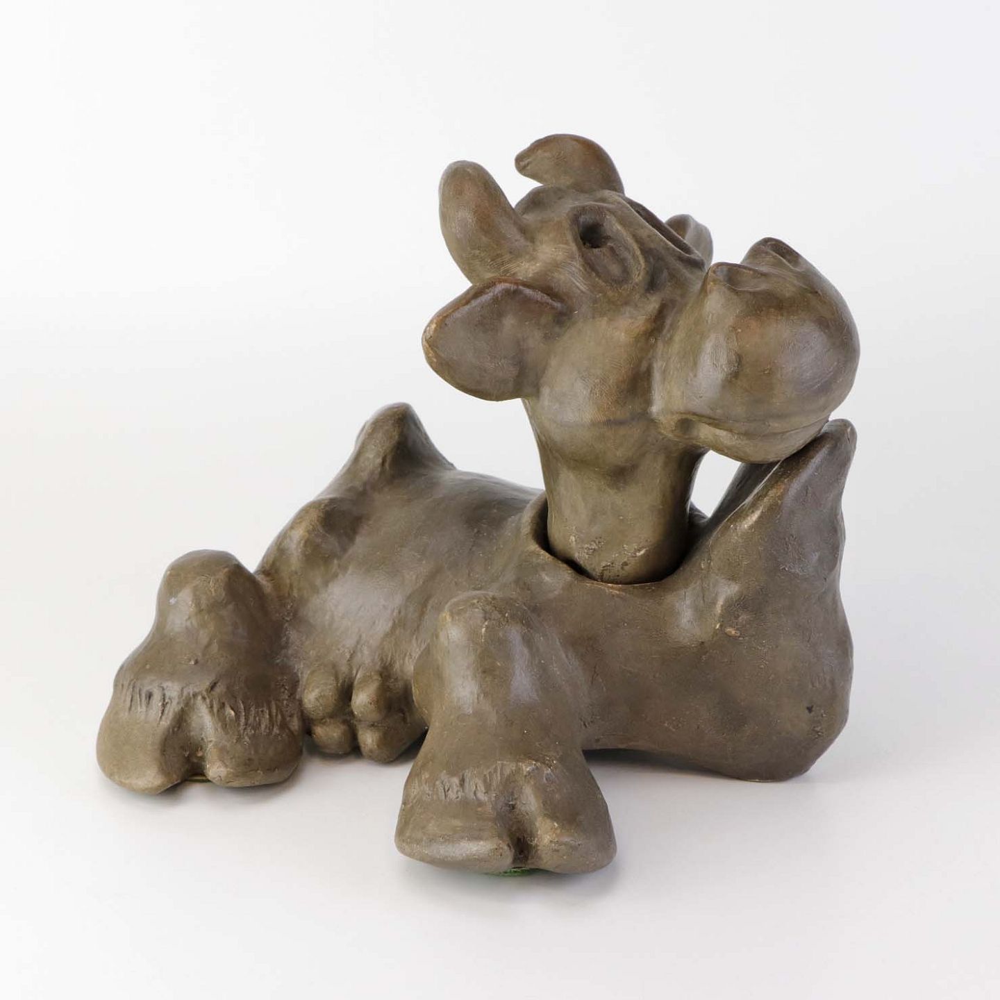 Figur i keramik med motiv en liggende ko med bevægeligt hoved som hviler den ene hov. Hovedet kan roteres.