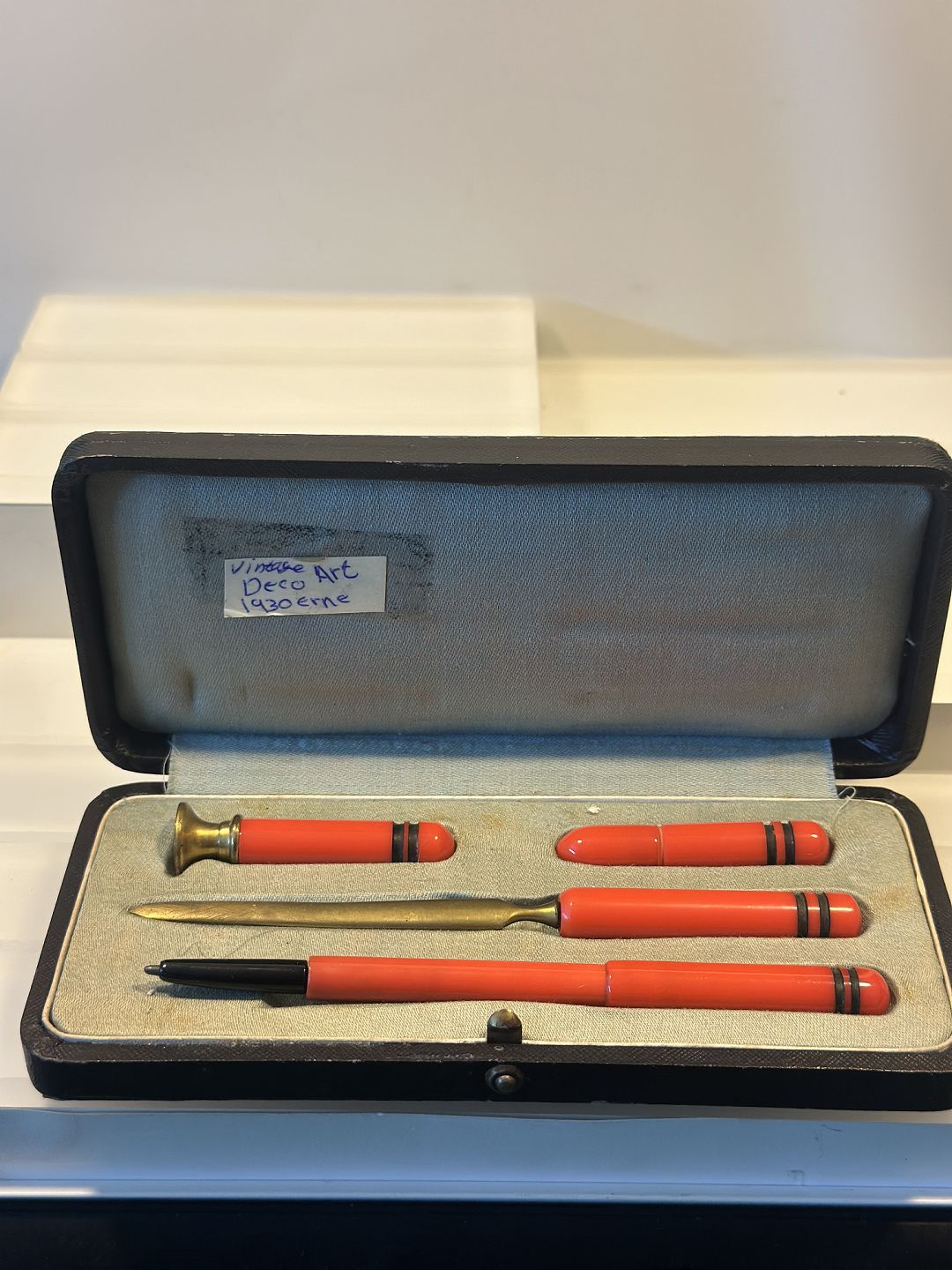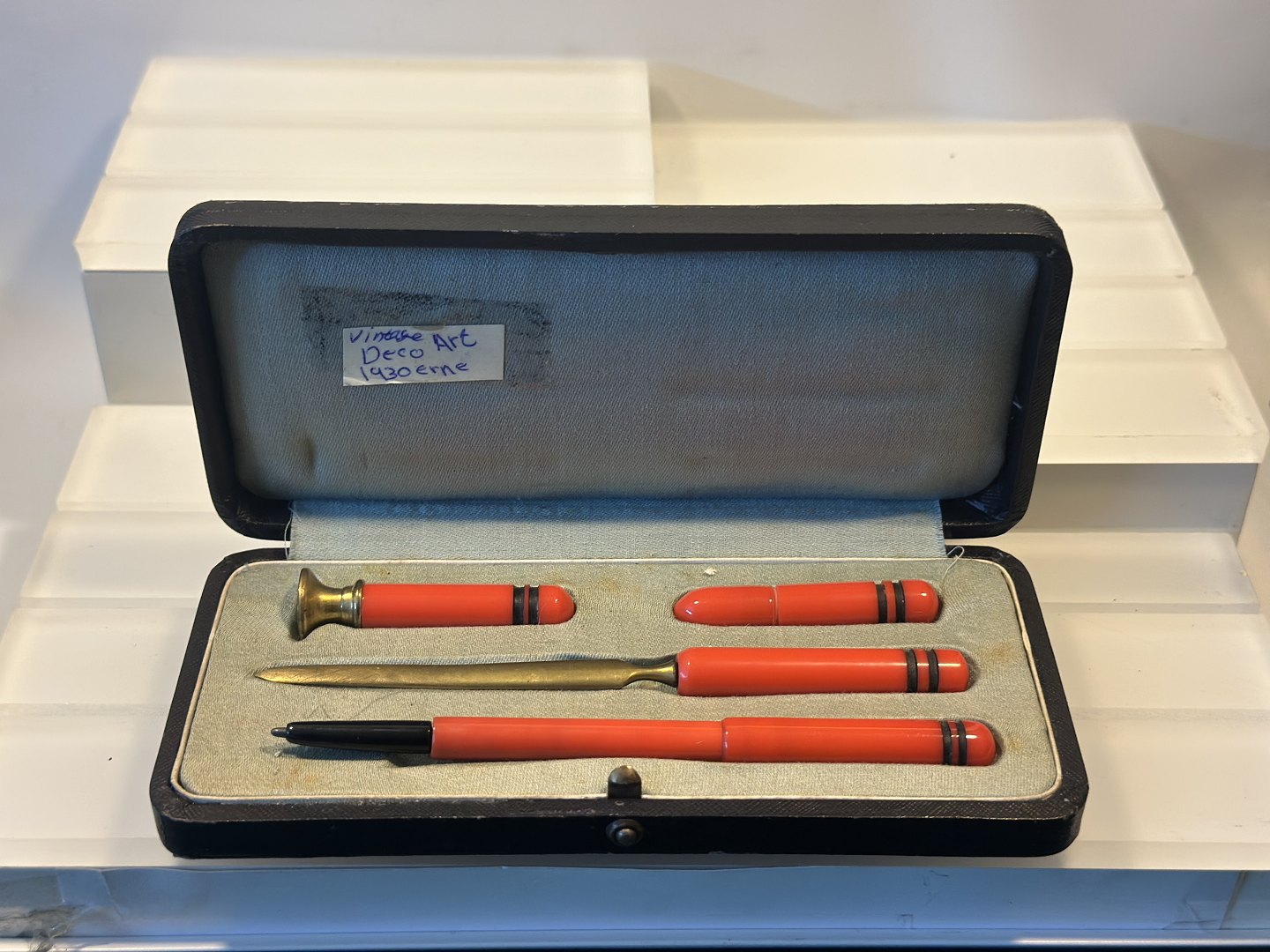 Art Deco Schreibset, aus den 1930er Jahren, Set besteht aus einem Stift, einem Brieföffner und einem Tintenfass, alles in Rot und Messingelementen