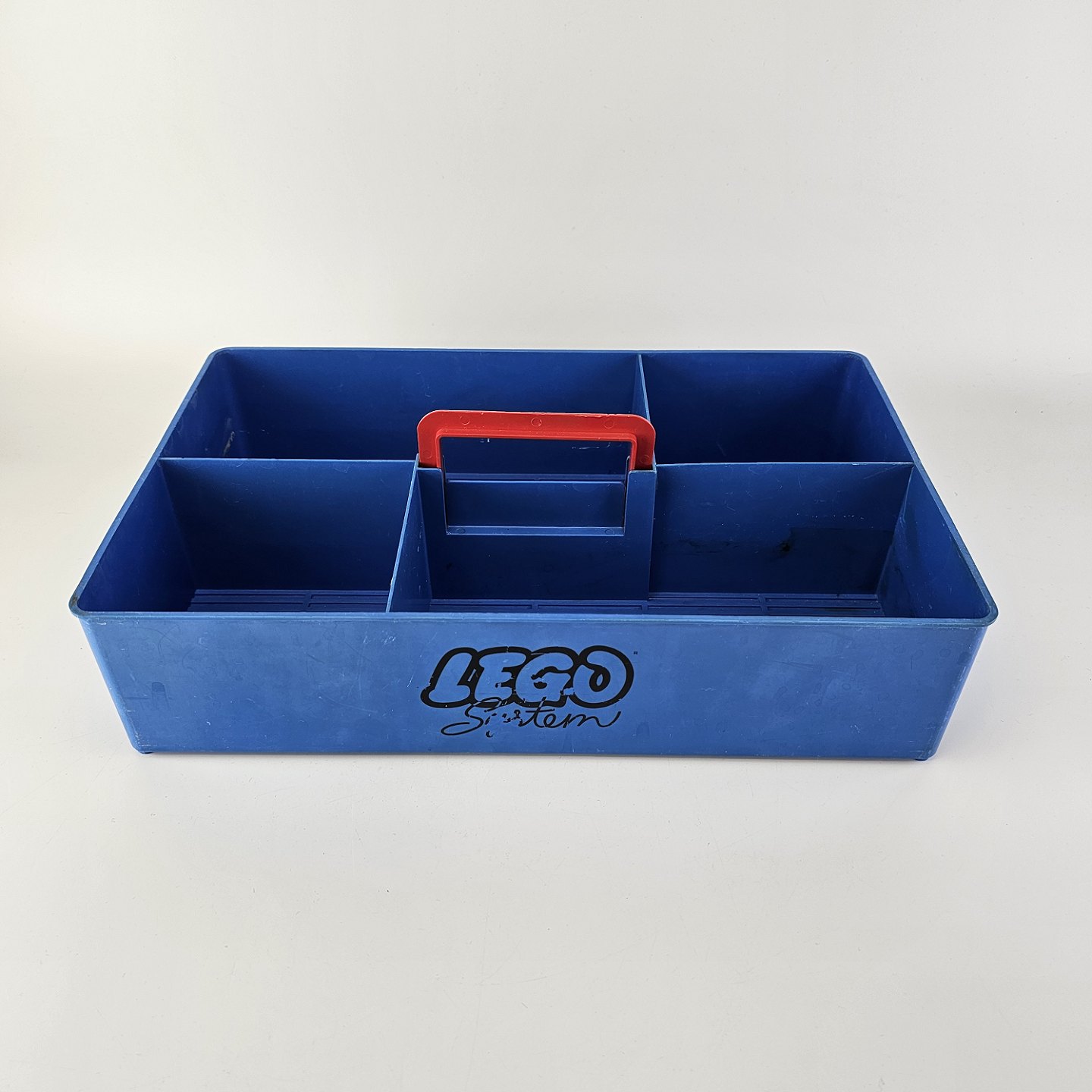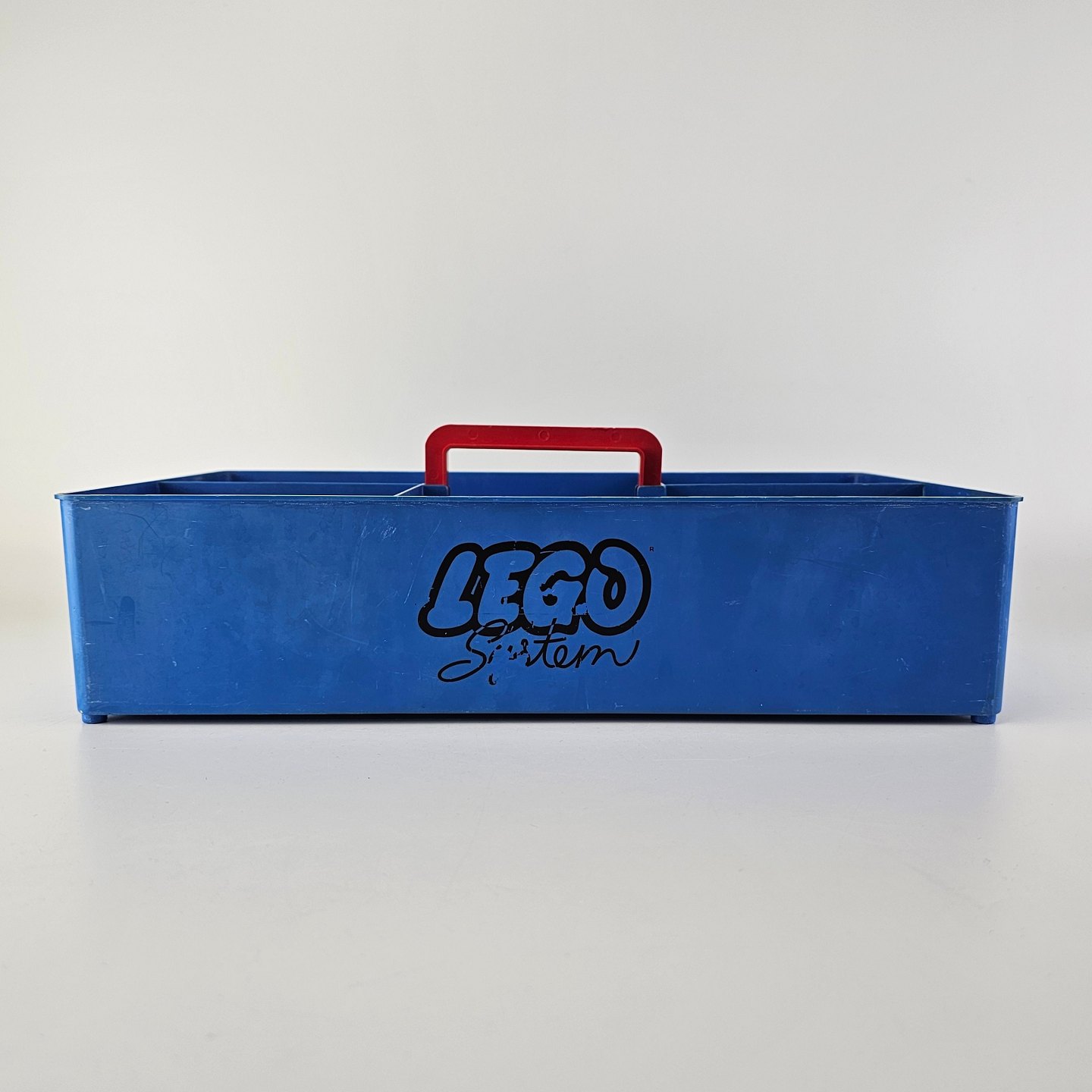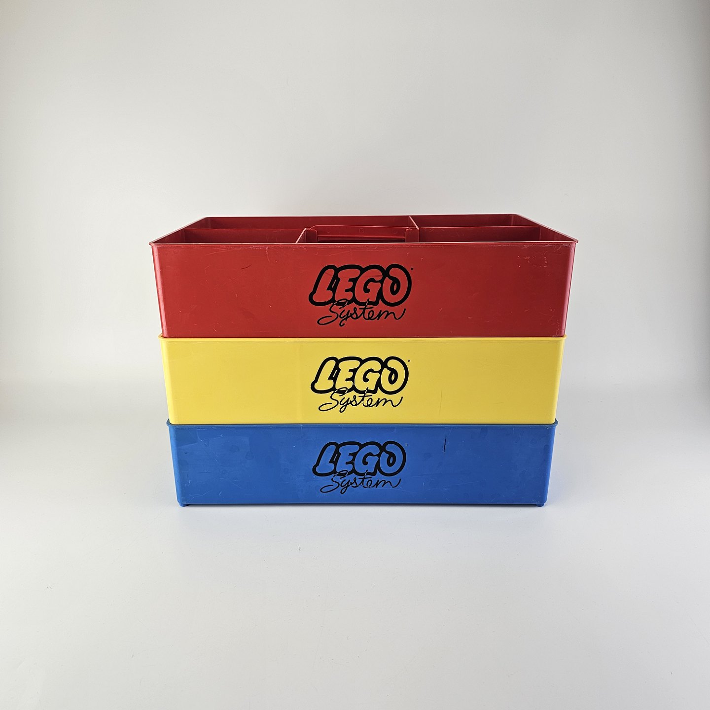 Tre opbevaringskasser i plast. Håndtaget kan trækkes op og ned, og kasserne kan stables