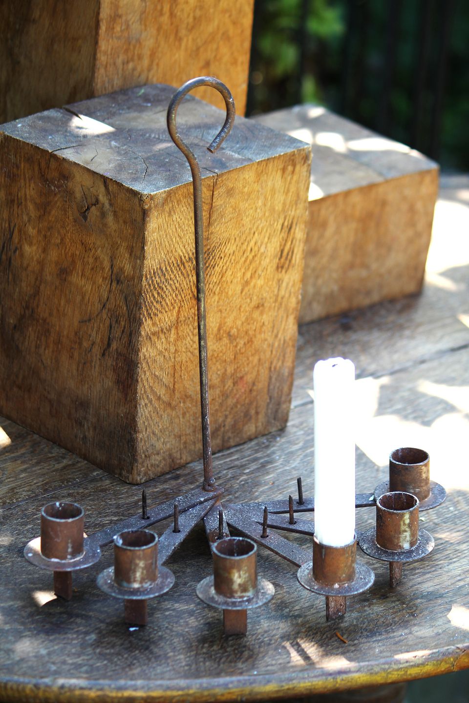 Gammel svensk lysestage i smedejern til 6 stearinlys som både kan stå på bord eller hænges ned fra loft. (gammelt tov til ophæng følger med)