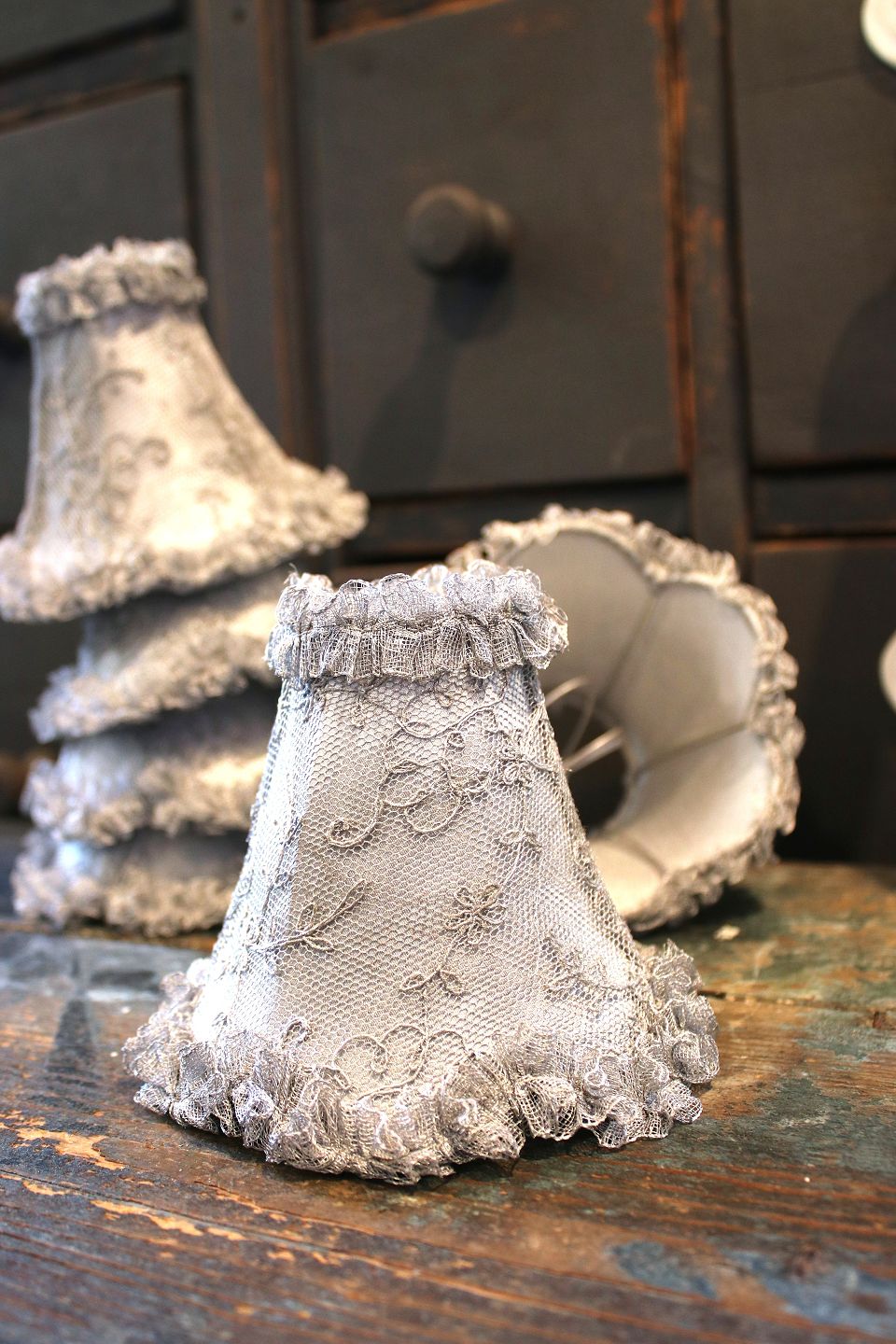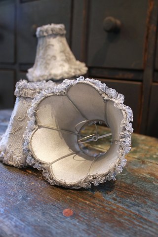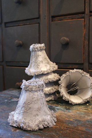6 stk. små gamle vintage lampeskærme fra 40érne til lysekrone i stof med tyl og blondekanter...