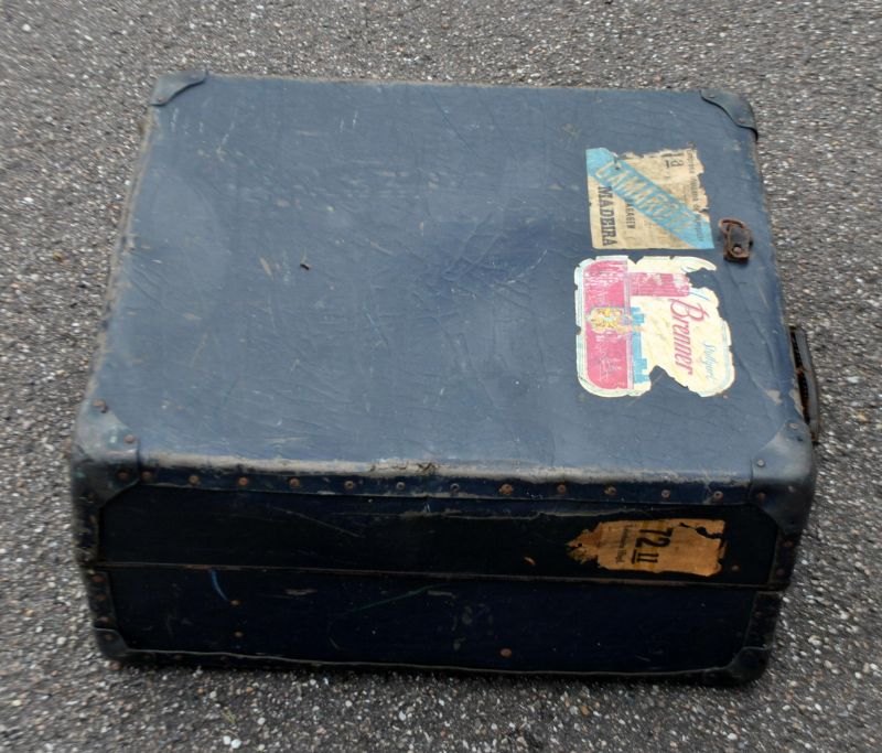 Kuffert, 20. årh. Med tyske mærkater. Bred hank. To låse, rustne og uden nøgle. L: 54 cm. B: 49 cm. H: 26 cm.
