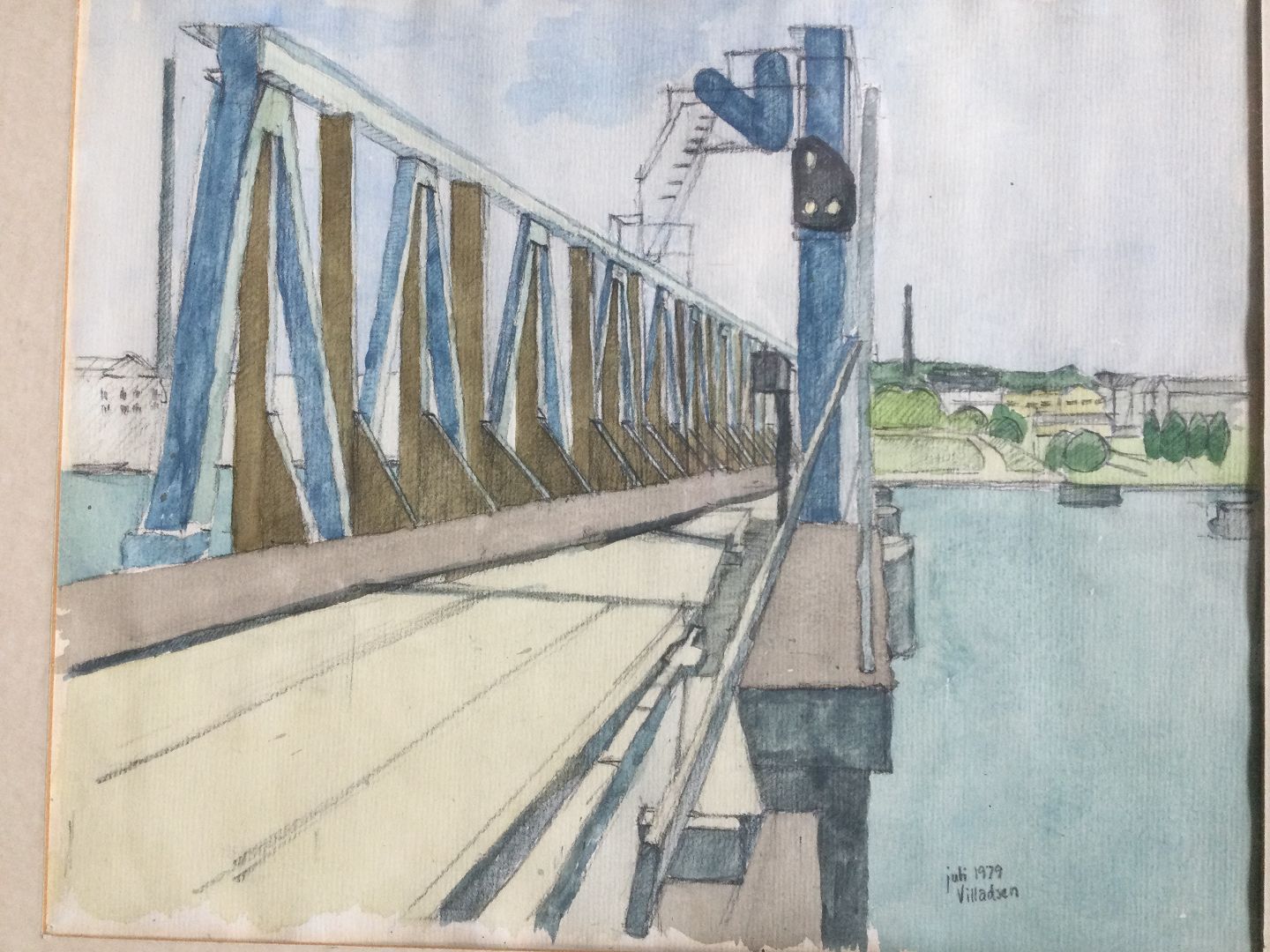 Akvarel signeret Villadsen 1979 - komposition med bro.
