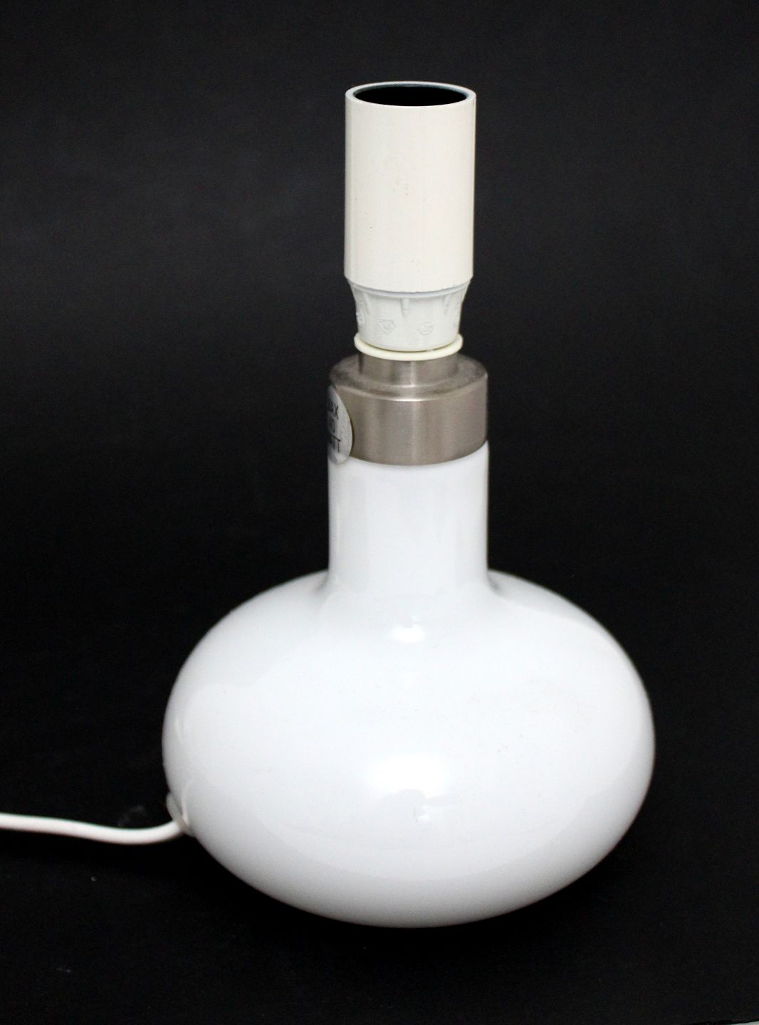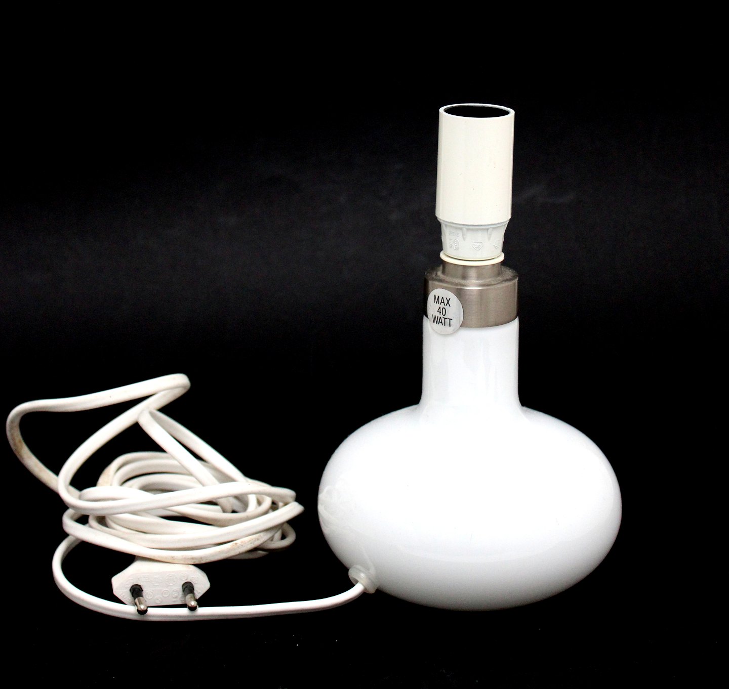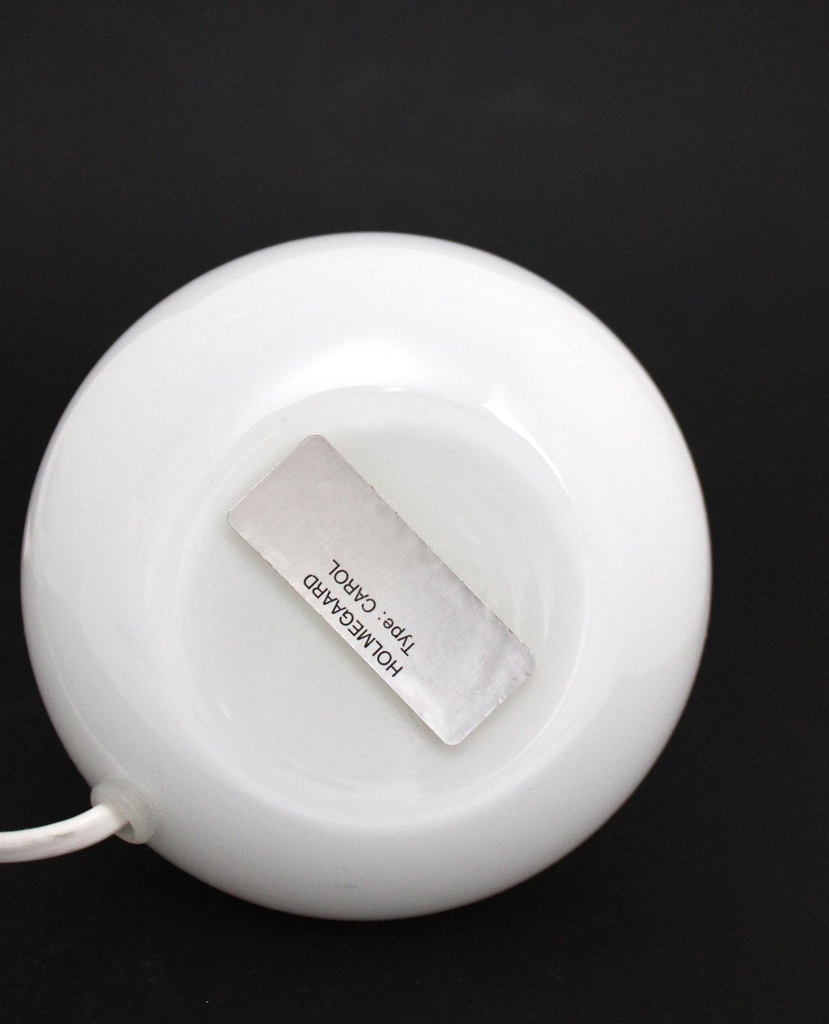 Holmegaard, Carol reollampe lille model i hvid opalglas med stål top og lille fatning. Designet af Sidse Werner i 1982. Produceret på Fyens Glasværk. Højde incl. fatning 18 cm. Nederste diameter 11 cm. Pris: 200 kr. stk. Lager: 1