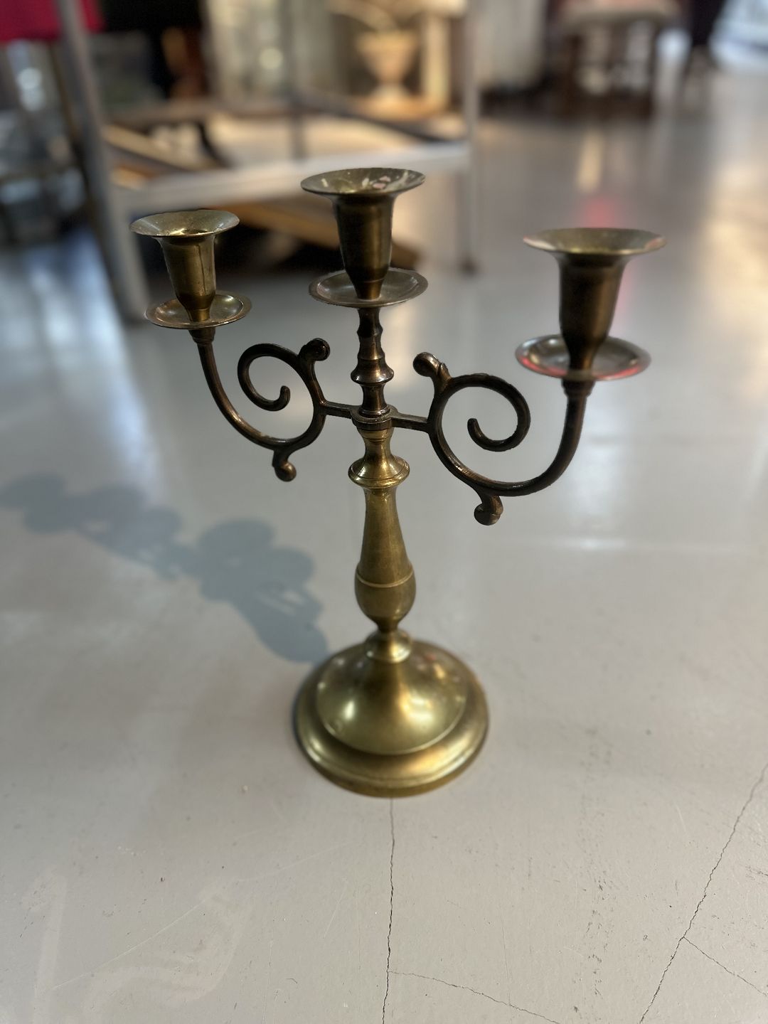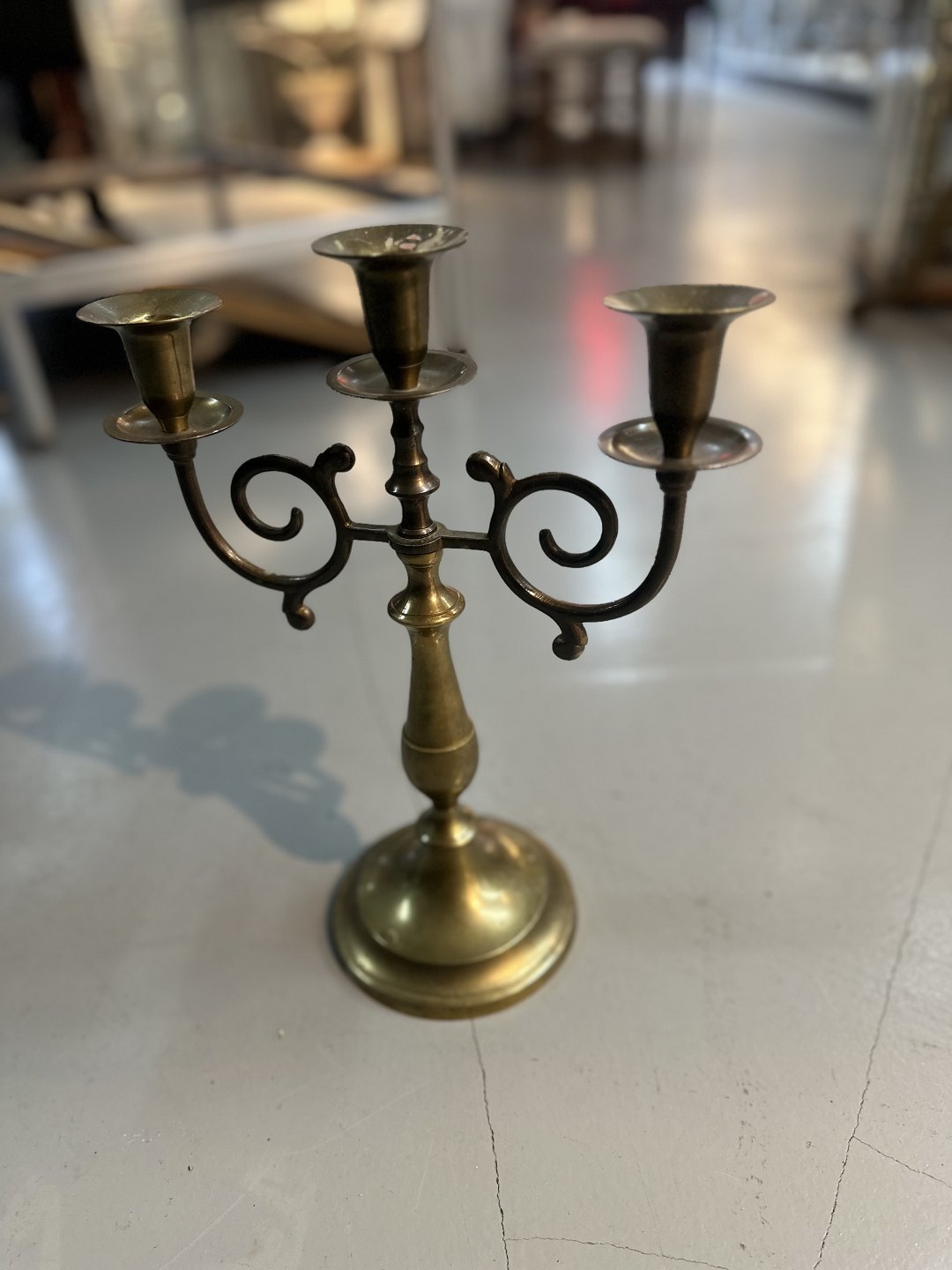 Tre-arme lysestager i messing , balusterfod og svungne arme i klassisk still , fra 1900 tallet