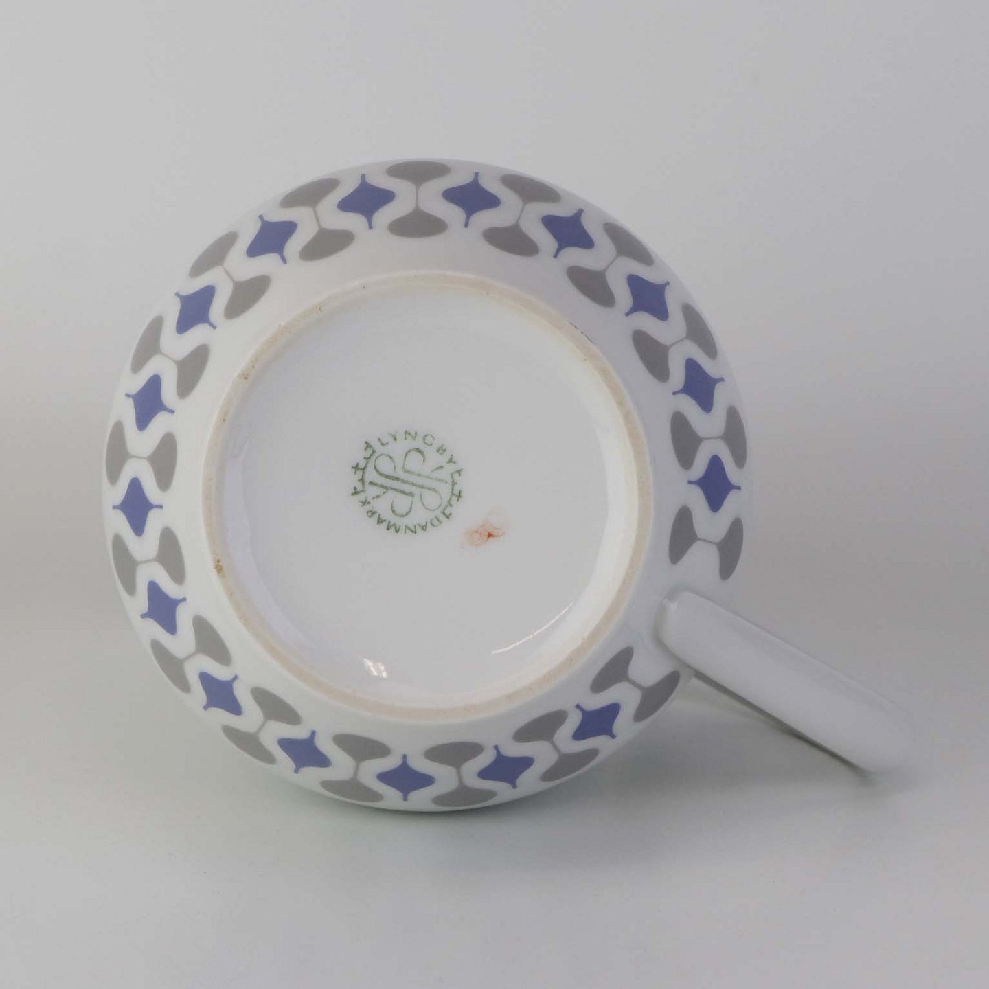 Stel produceret i perioden 1961-69 fremstillet i glat hvidt porcelæn dekoreret med blå og grå dråber.