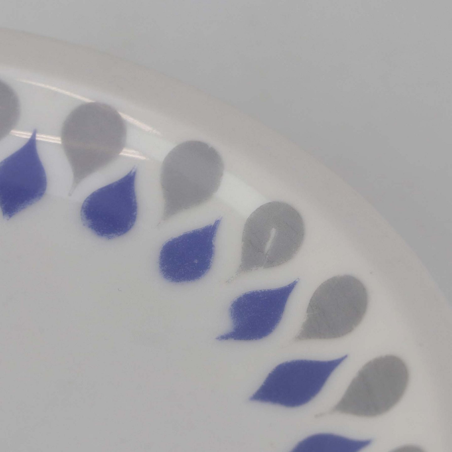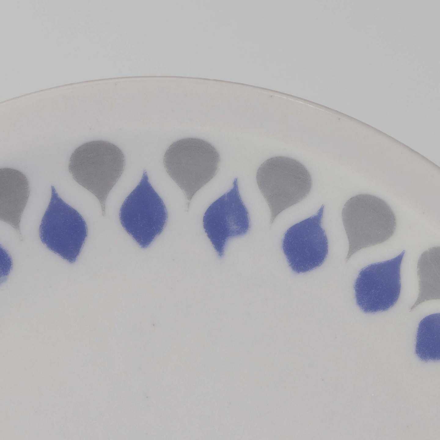 Stel produceret i perioden 1961-69 fremstillet i glat hvidt porcelæn dekoreret med blå og grå dråber.