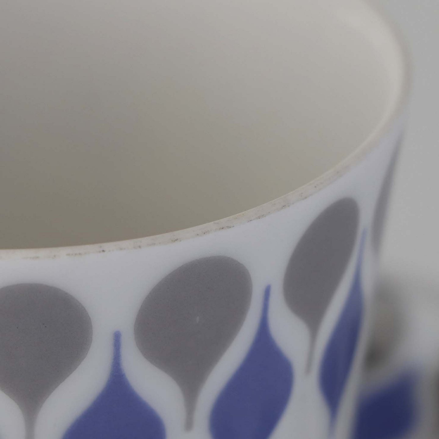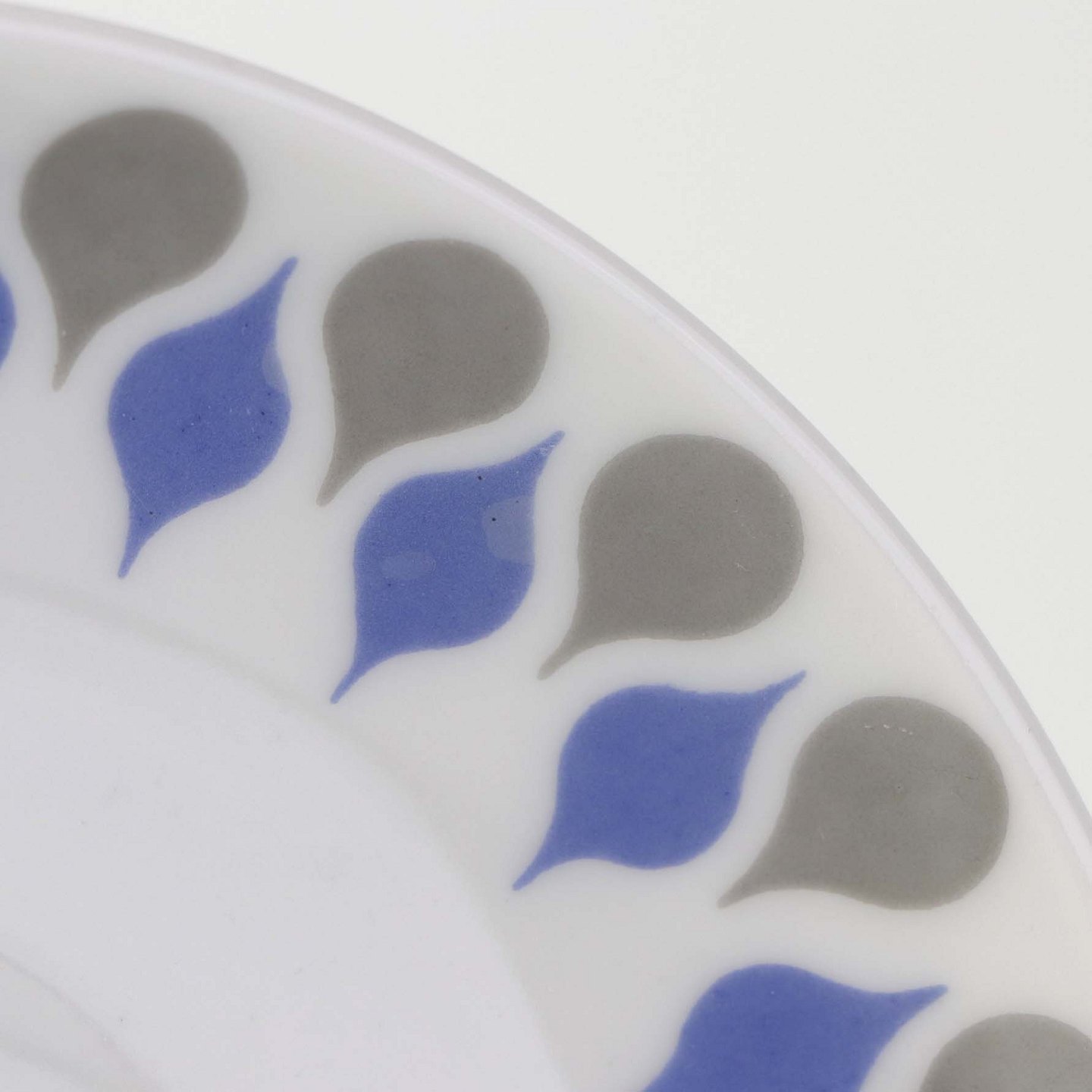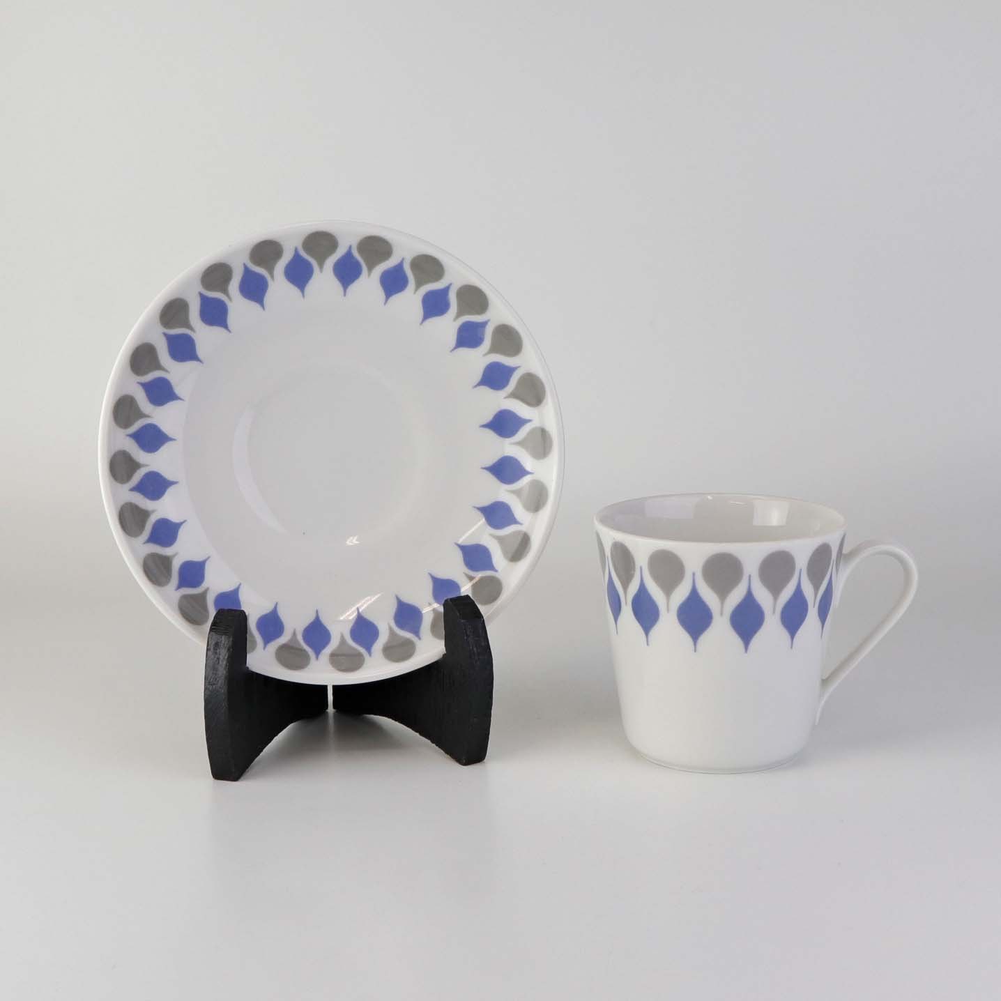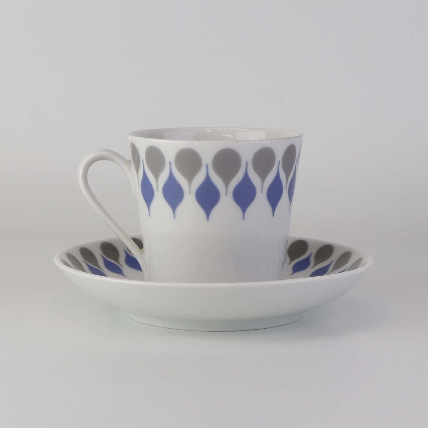 Stel produceret i perioden 1961-69 fremstillet i glat hvidt porcelæn dekoreret med blå og grå dråber.
