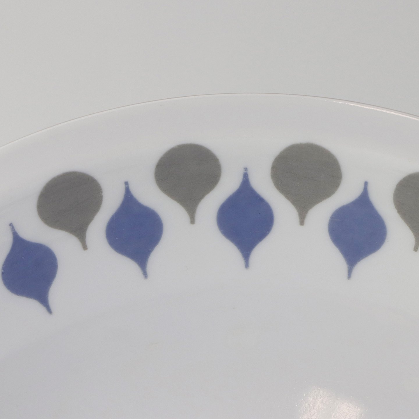 Stel produceret i perioden 1961-69 fremstillet i glat hvidt porcelæn dekoreret med blå og grå dråber.