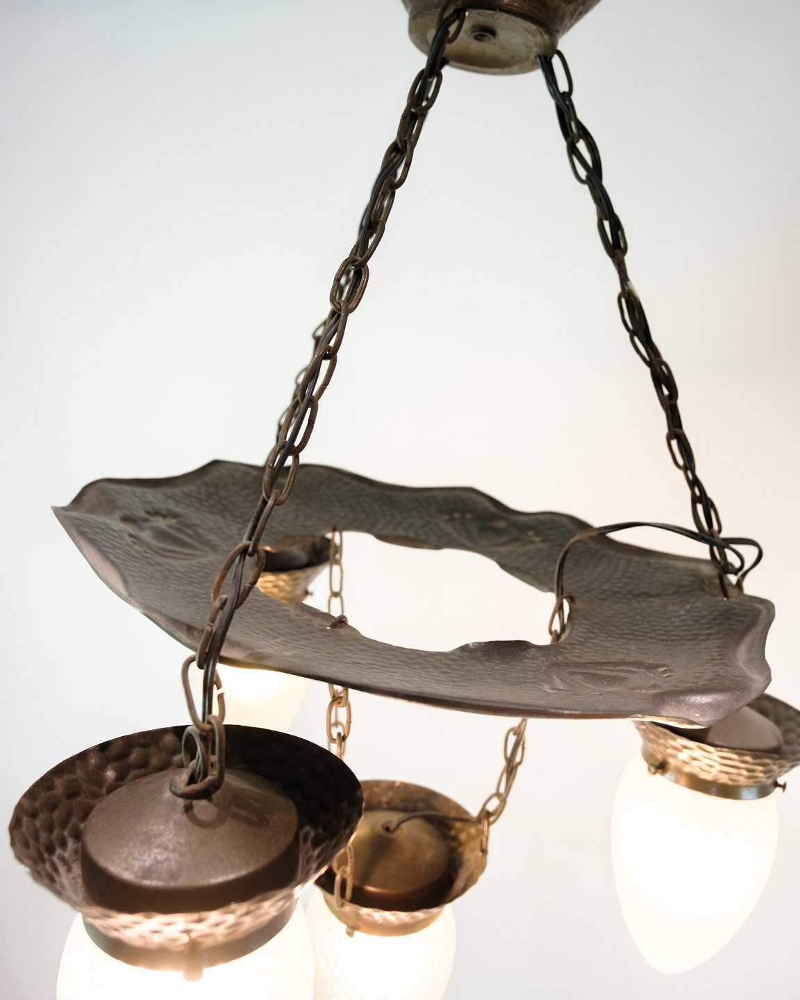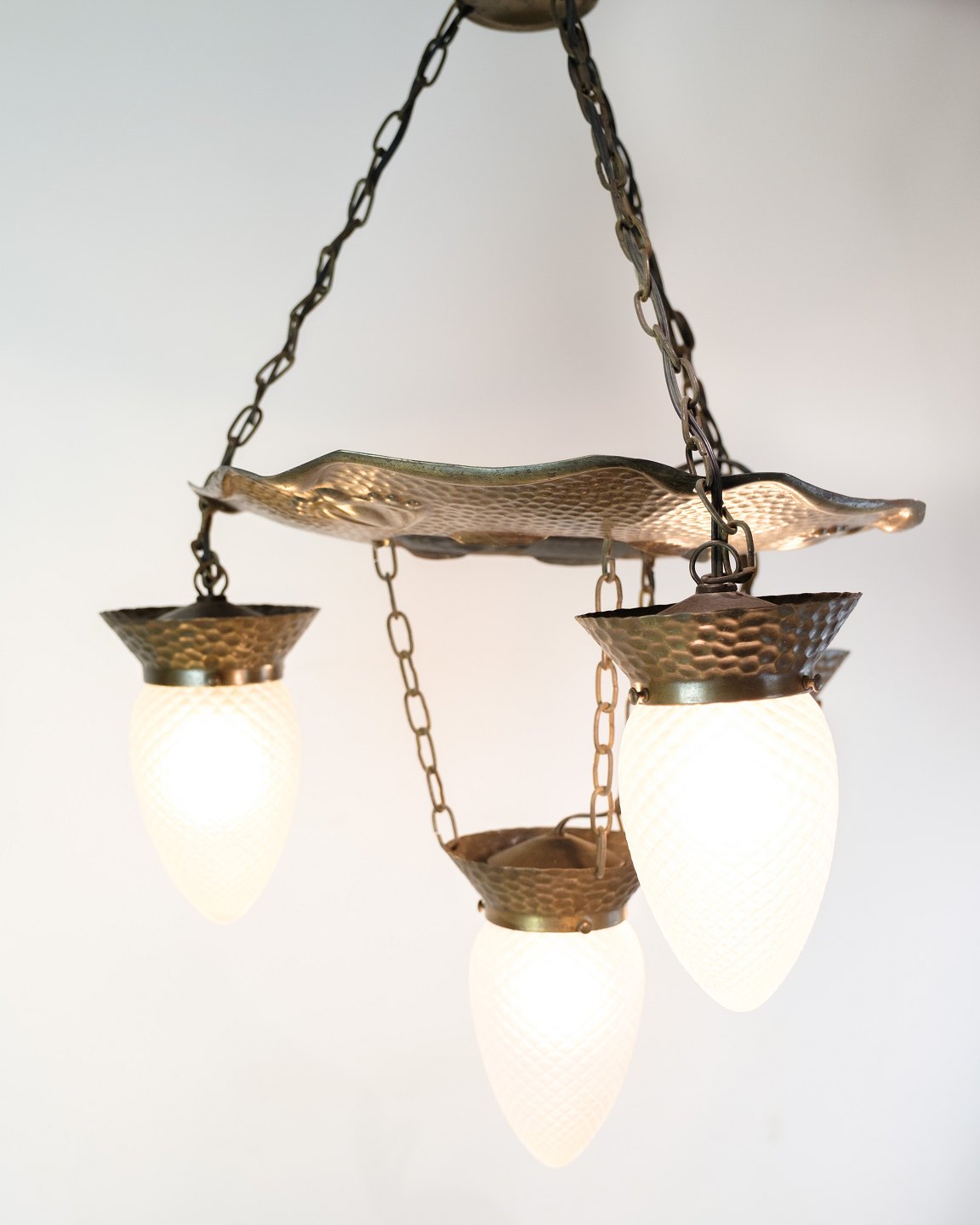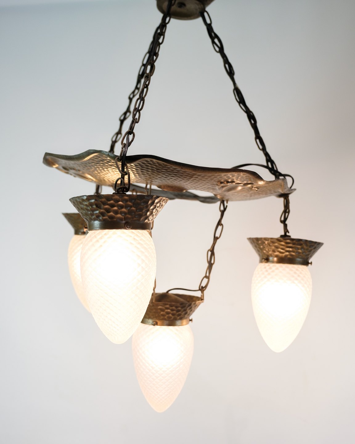 Jugendstil lysekrone fra 1920’erne i patineret, hamret messing med fire arme og dråbeformede glas. Elegant klassisk loftslampe.