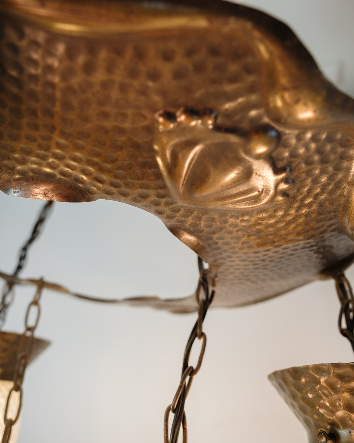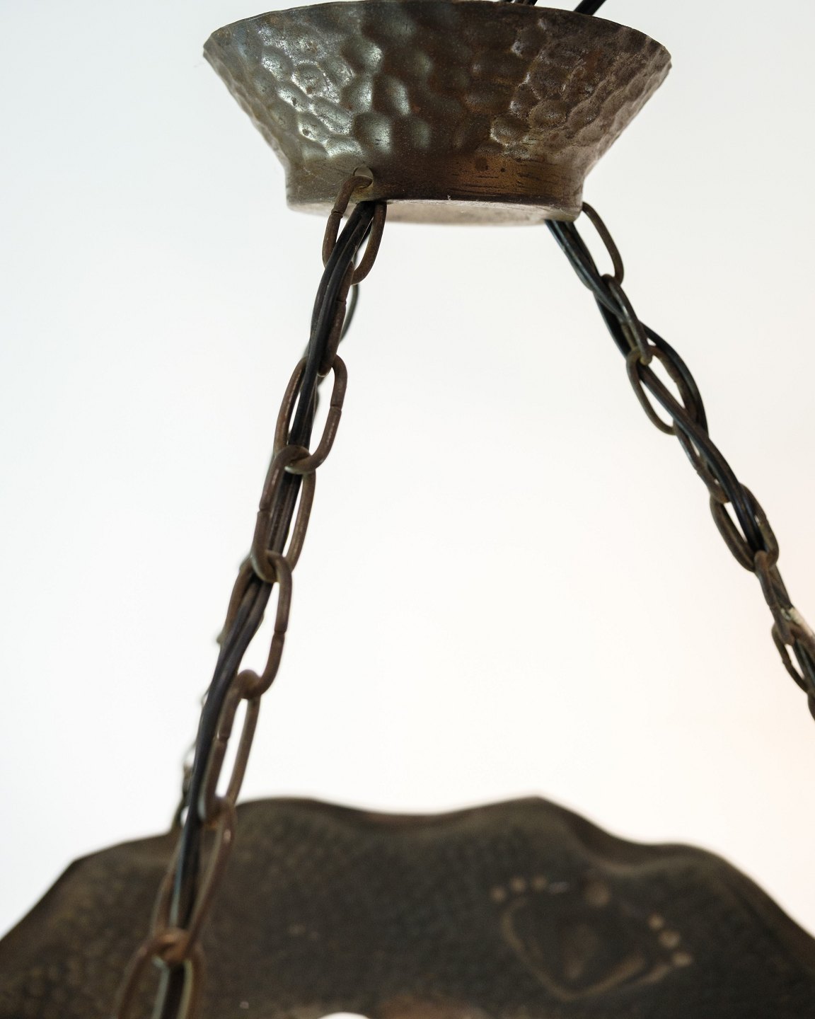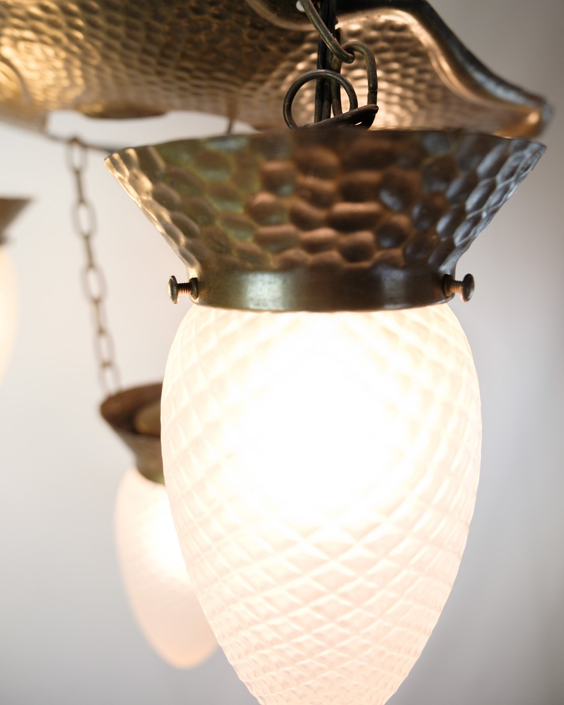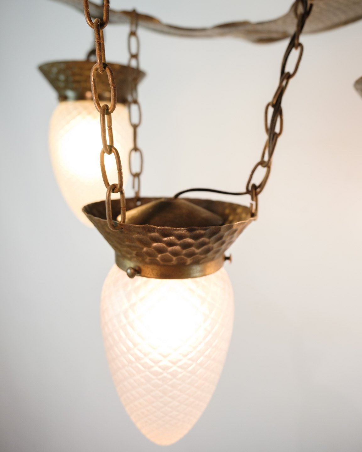 Jugendstil lysekrone fra 1920’erne i patineret, hamret messing med fire arme og dråbeformede glas. Elegant klassisk loftslampe.