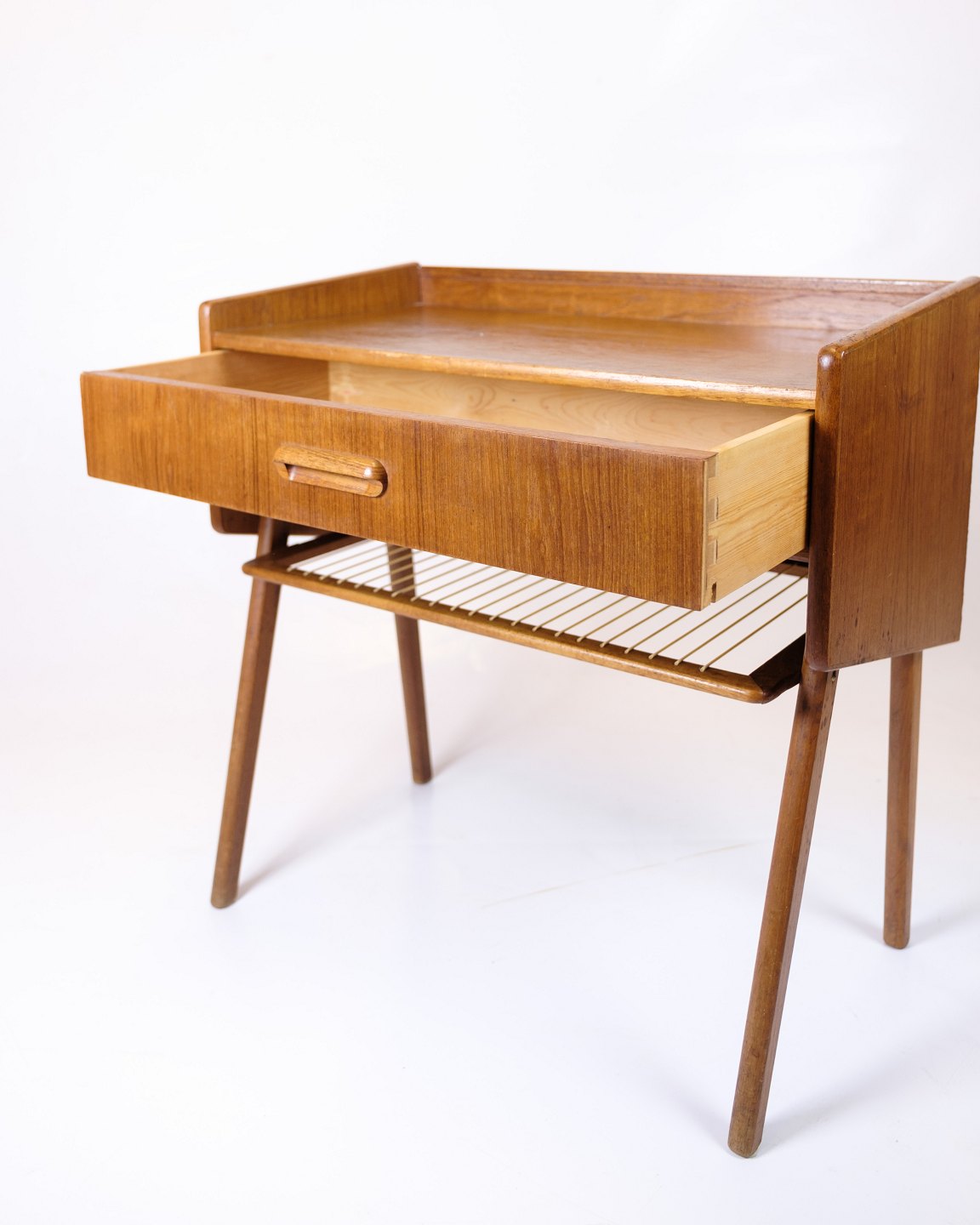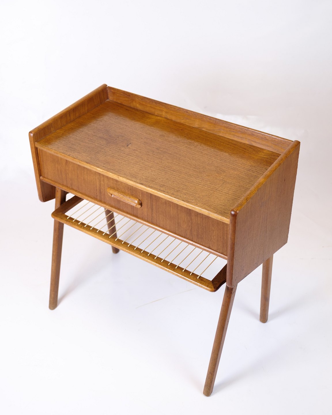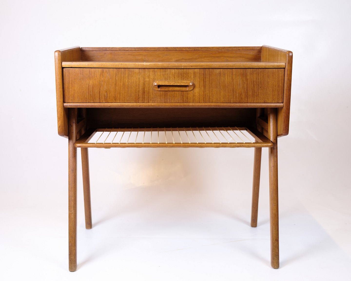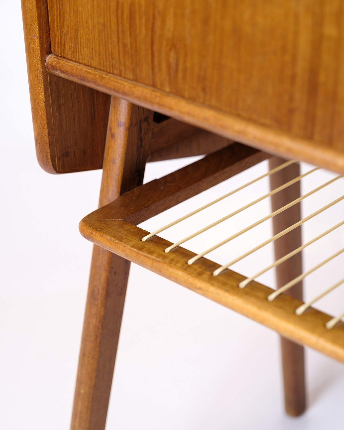 Sidebord/natbord i teaktræ med skuffe og flethylde. Dansk design fra 1960’erne. Elegant og funktionelt møbel i flot stand.