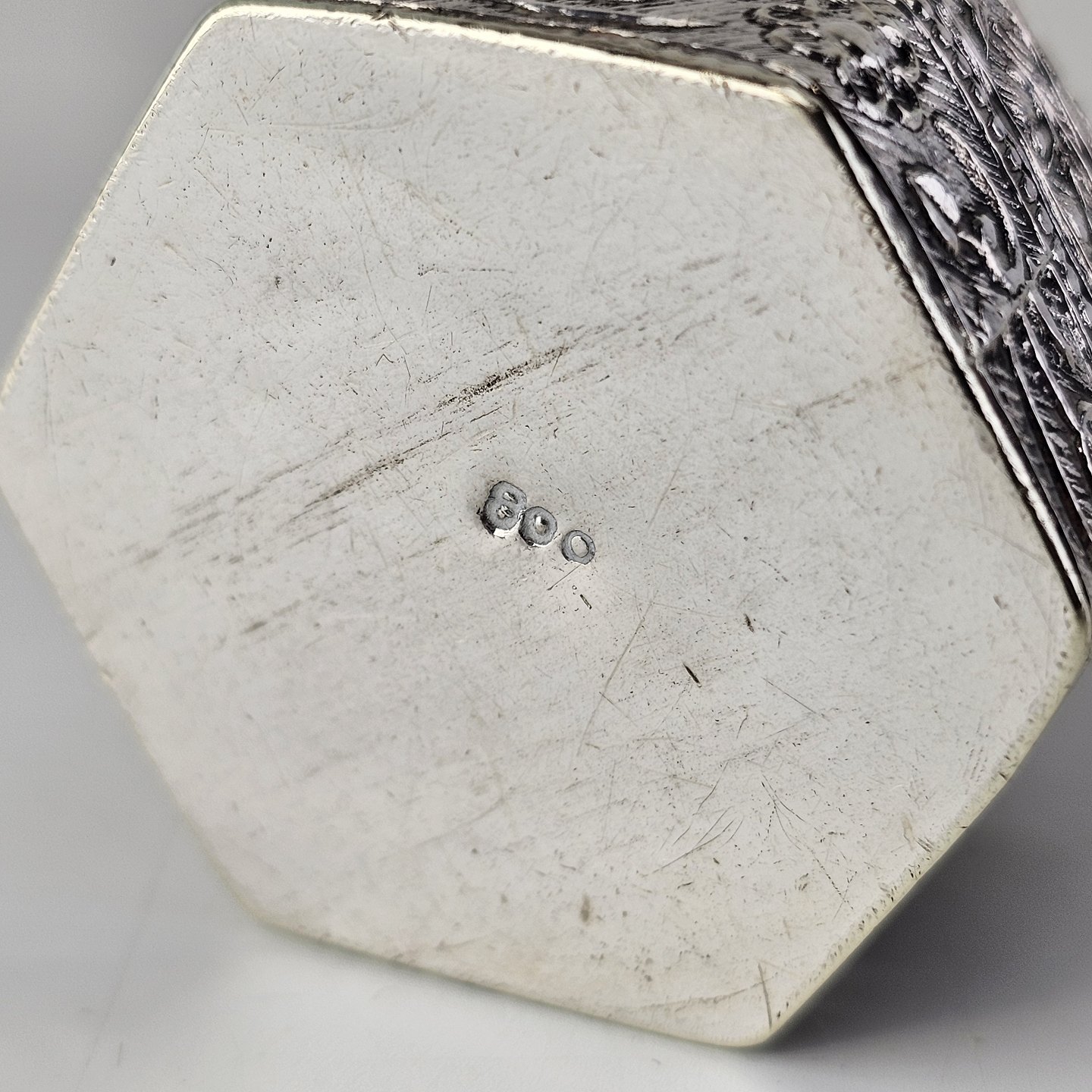 Lille dåse i sølv med koppellåg og dekoreret med blomsterranker