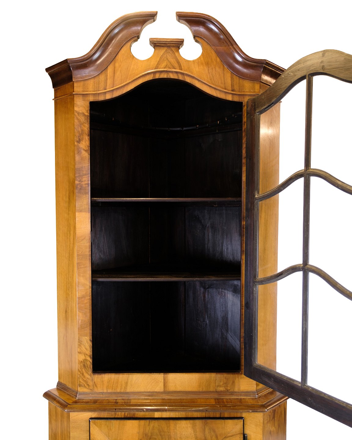 Antikt vitrineskab i barokstil fra ca. 1900. Udført i nøddetræ med glaslåge og sprosser. Elegant hjørneskab med klassisk udtryk.
