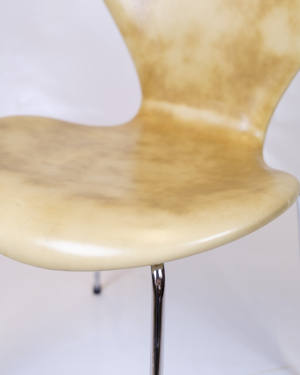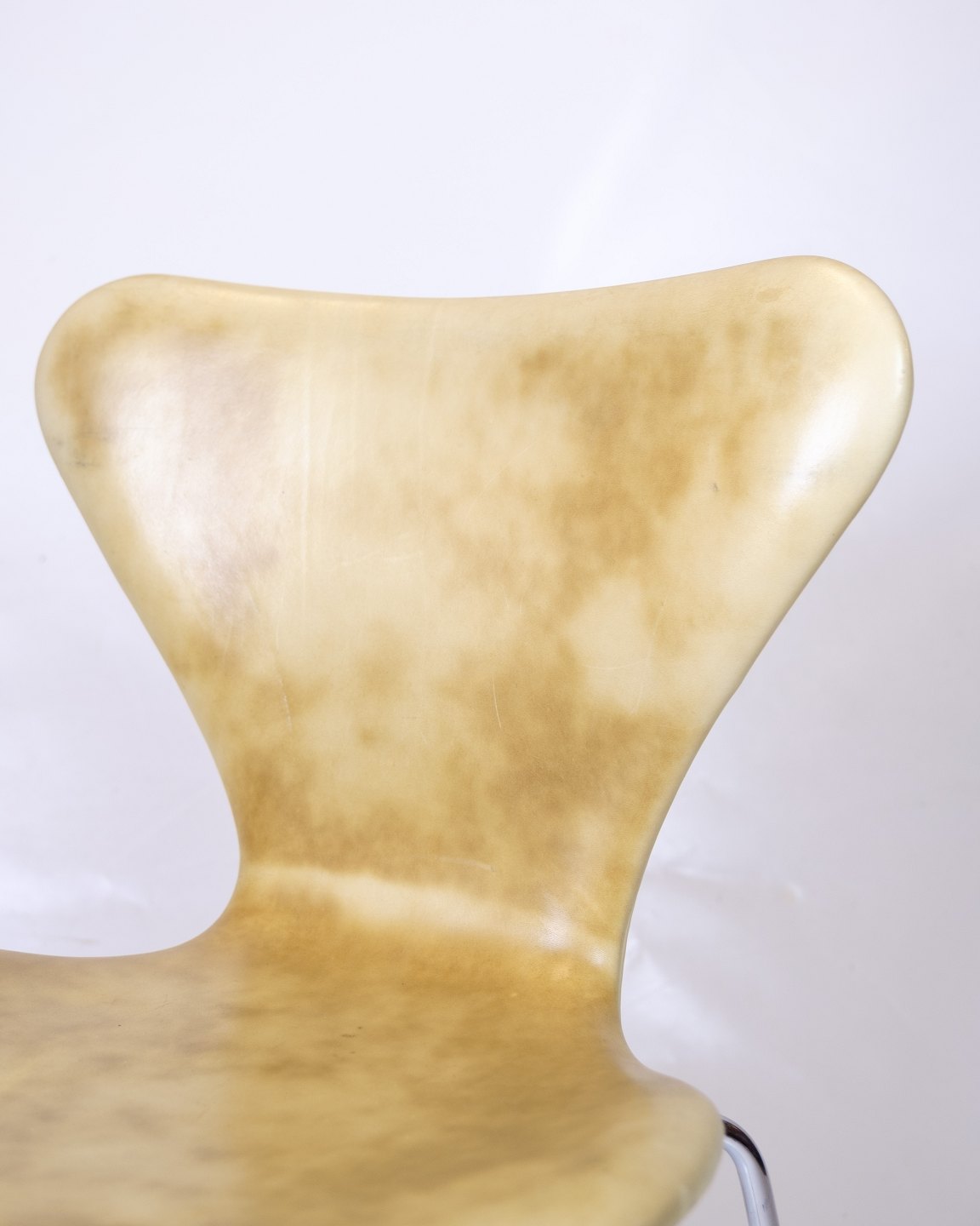 Sæt af otte Syver stole, model 3107, designet af Arne Jacobsen i 1955 og produceret af Fritz Hansen. Stolene er betrukket med smukt patineret naturfarvet læder, som giver hver stol sit eget unikke udtryk. Stellet er udført i kromstål.
